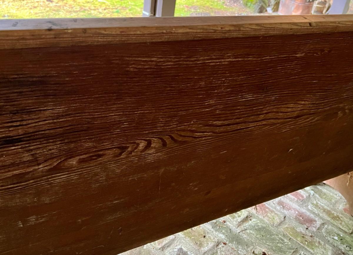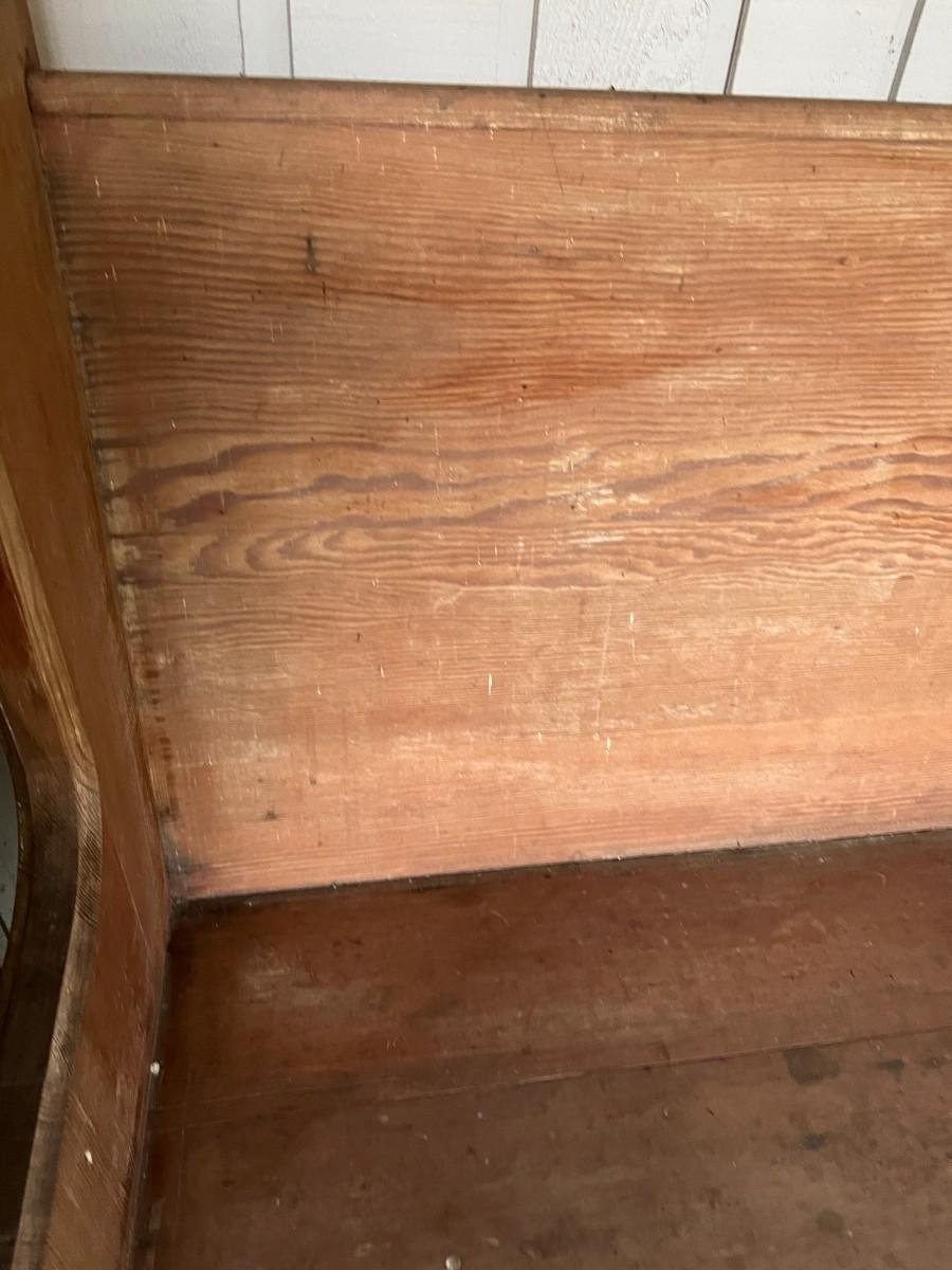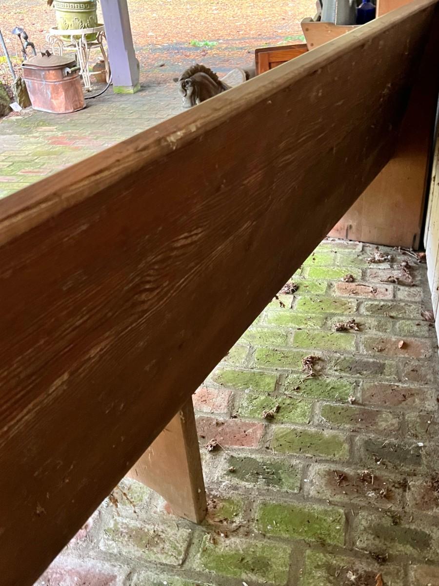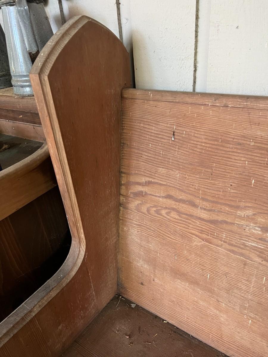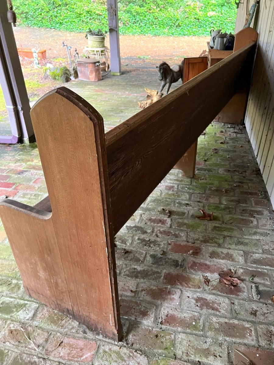 Large Antique 10 Foot Wooden Church Pew. From a Redmond estate, where it has been stored on a covered outdoor patio. In good condition, as shown.