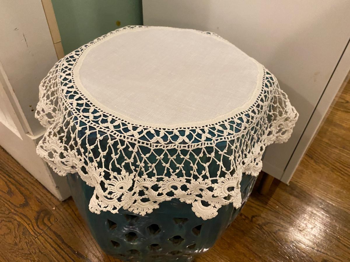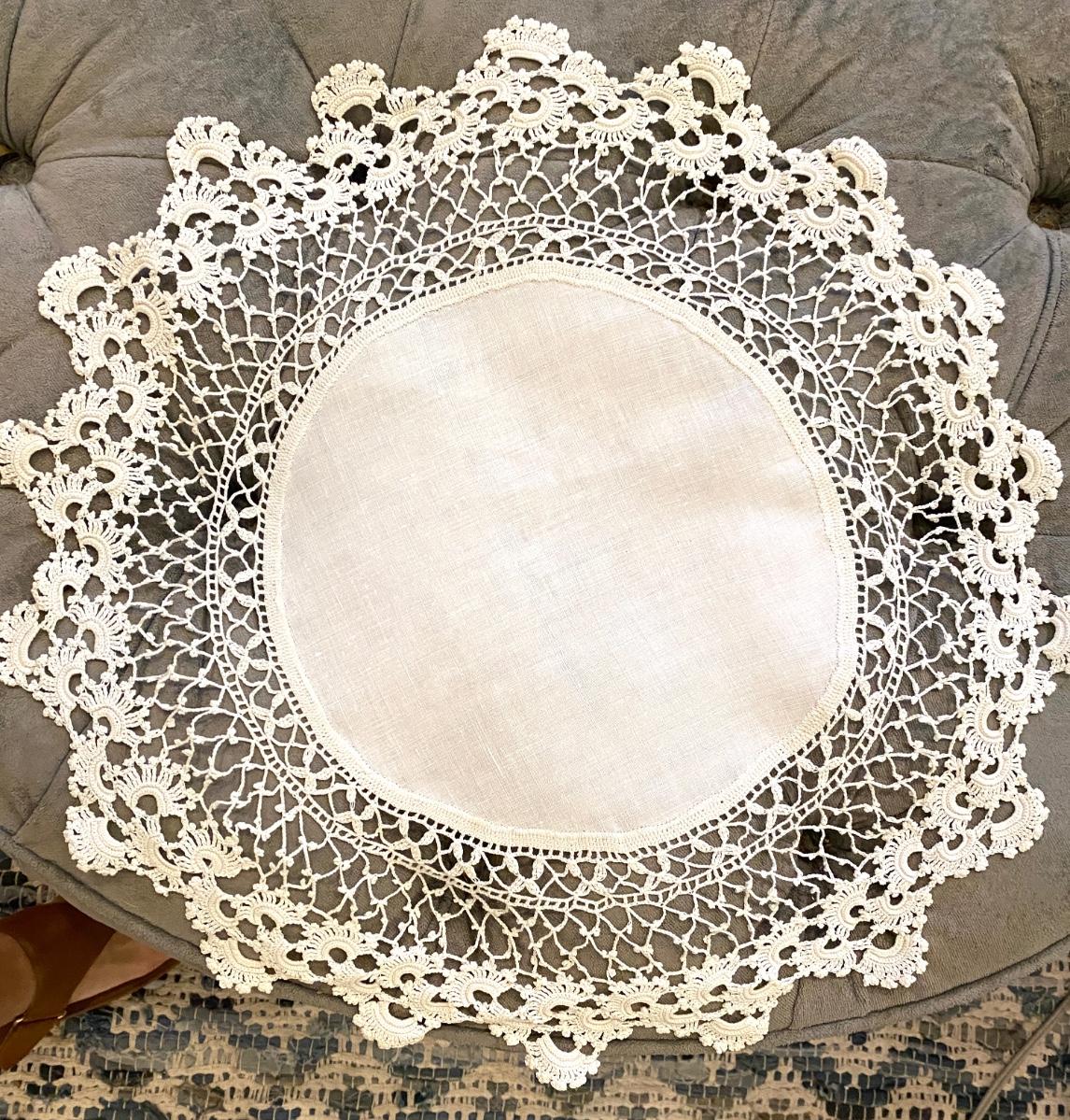 This doily has a wonderful wide crochet scalloped border with sort of half pin wheels around. White , crisp and lovely.