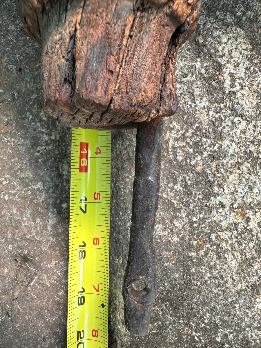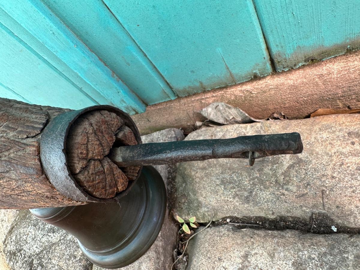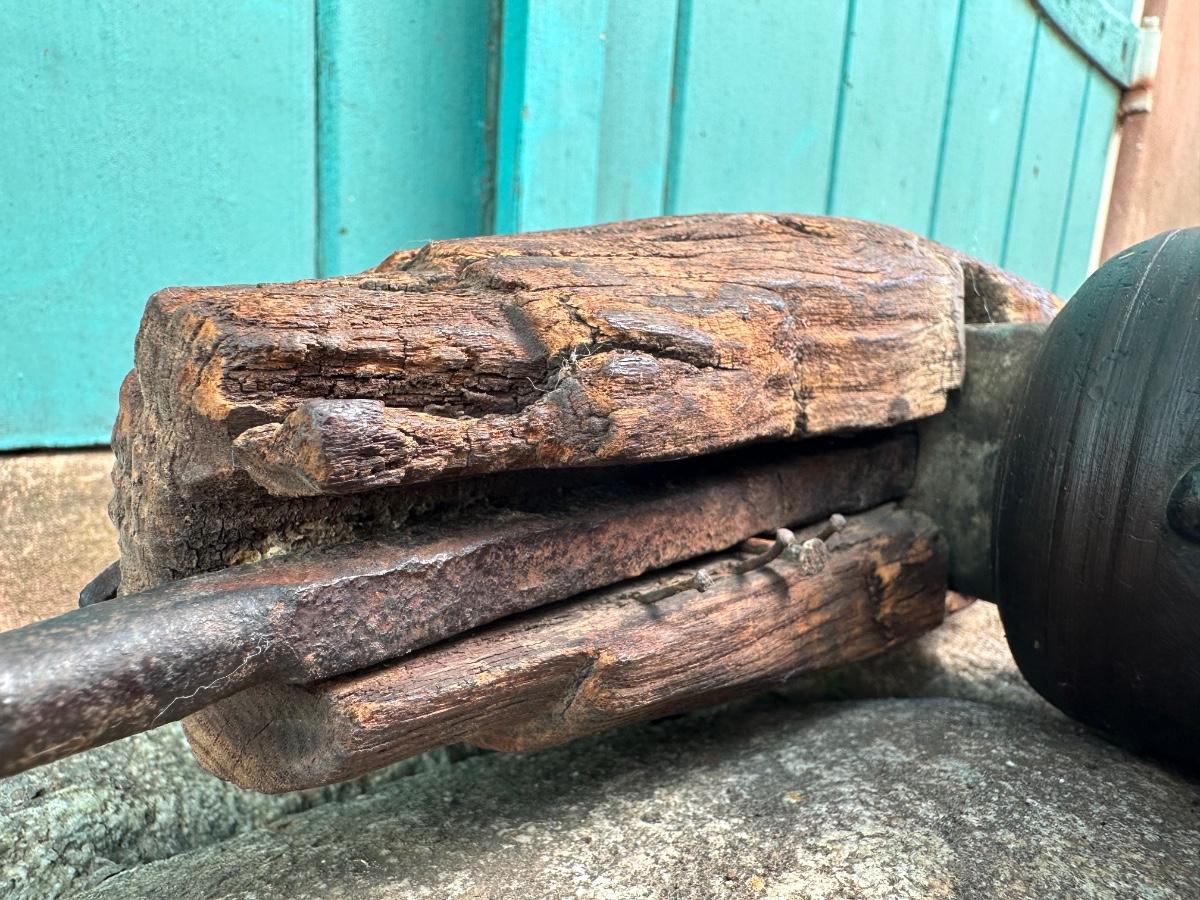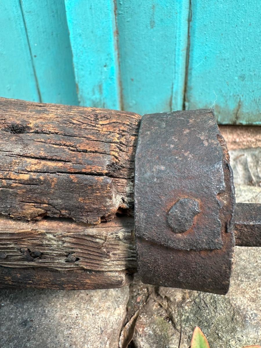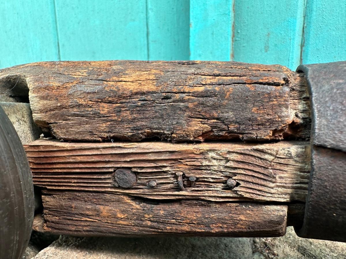 Missing left iron piece on wood and missing piece of wood on bottom left.