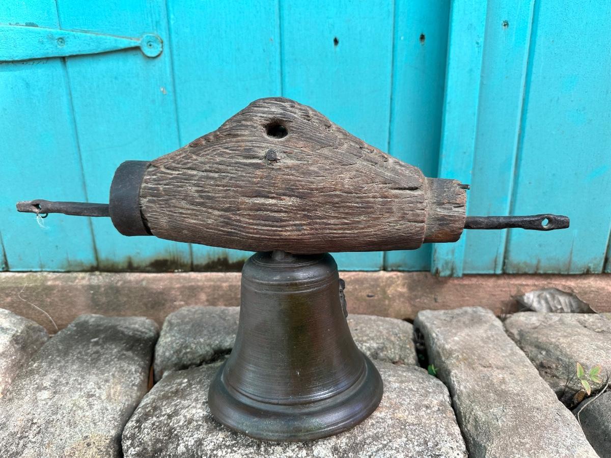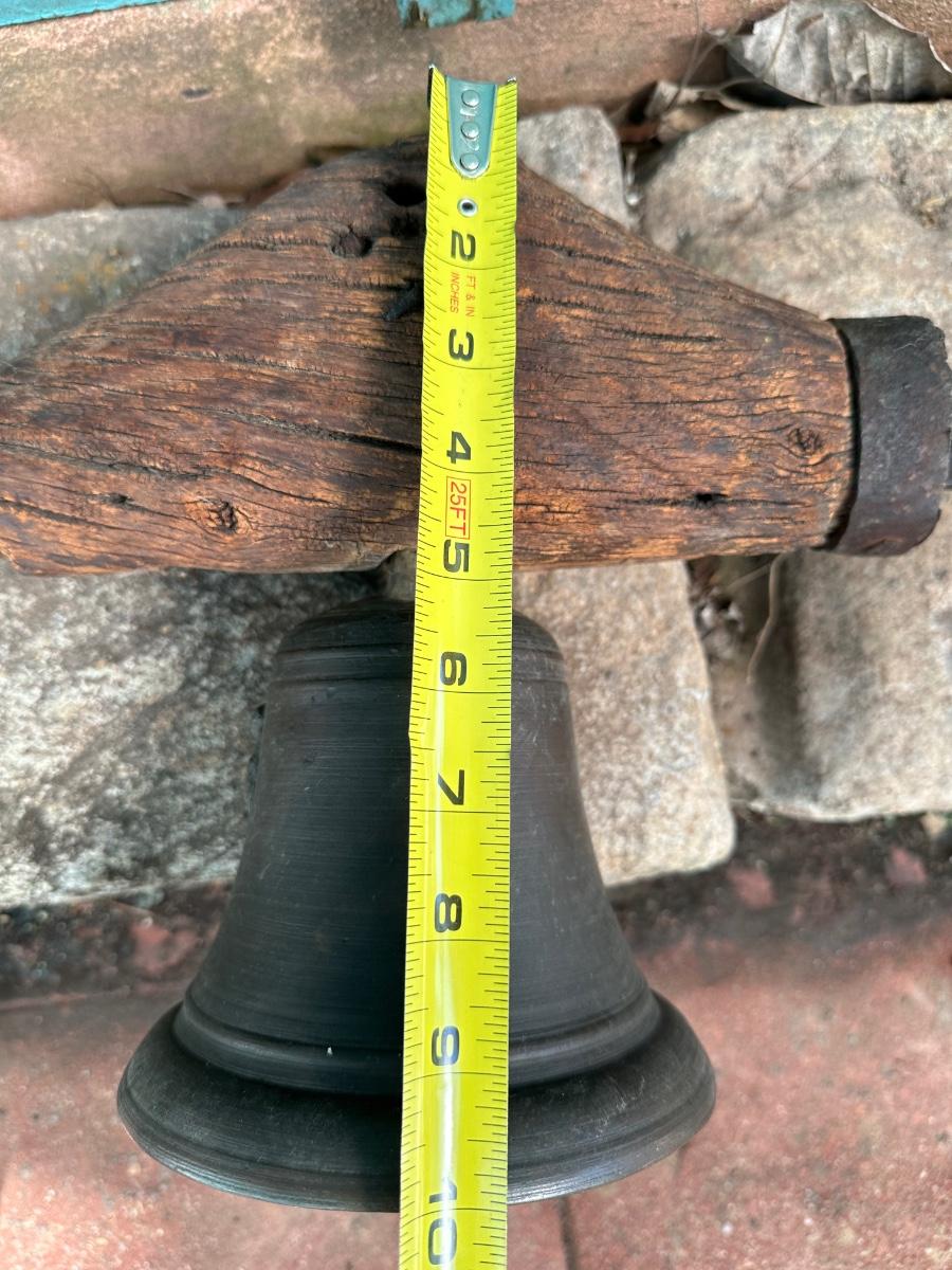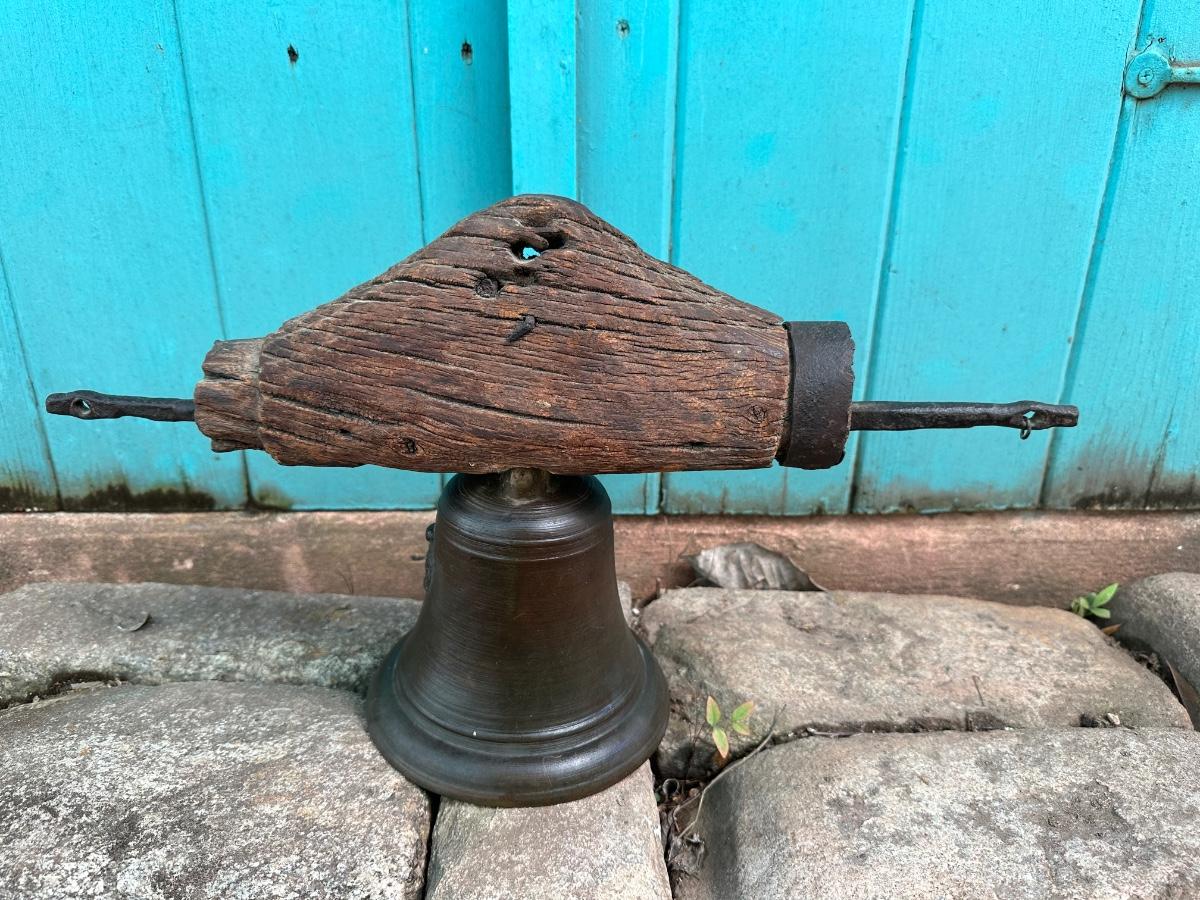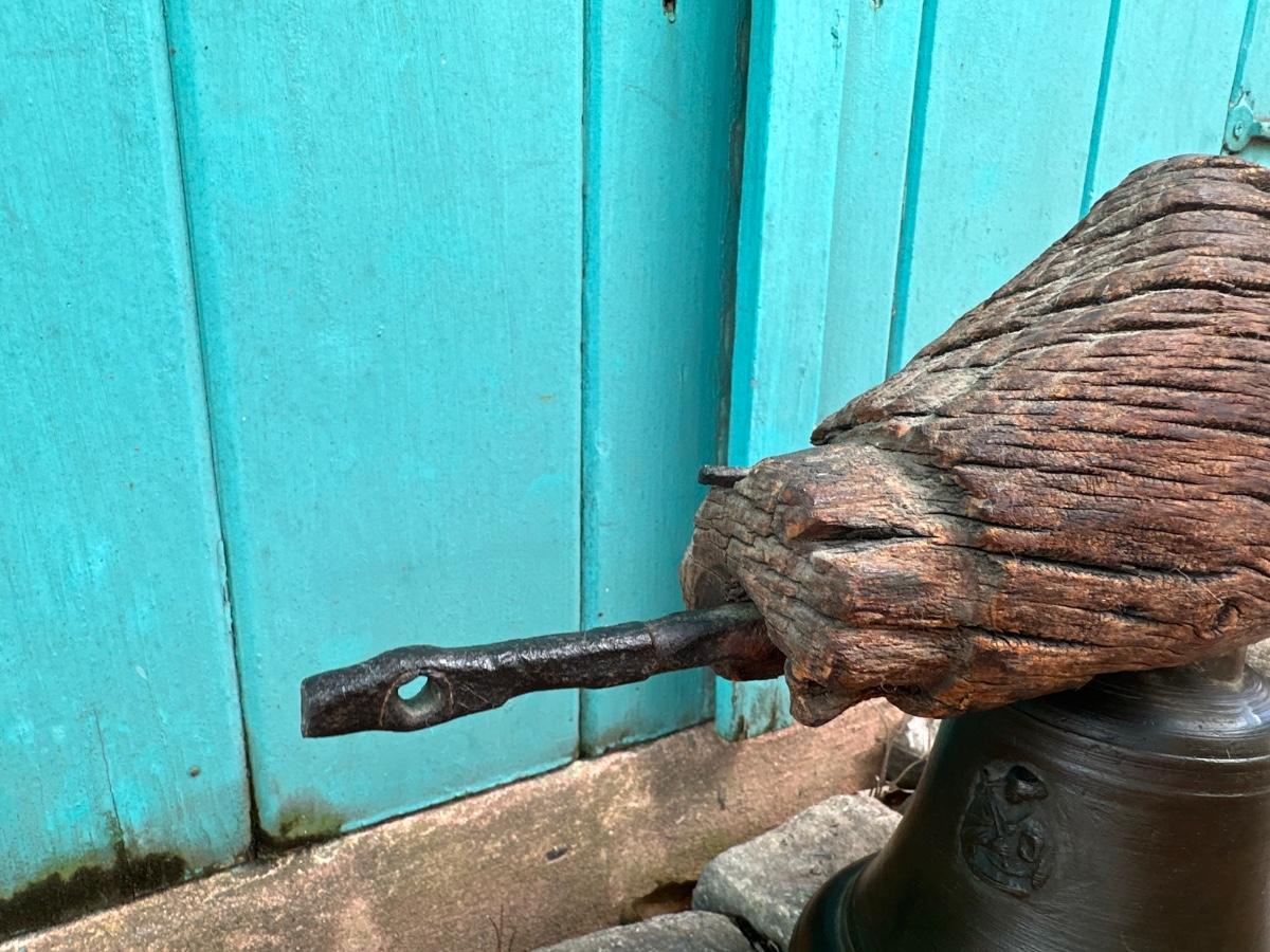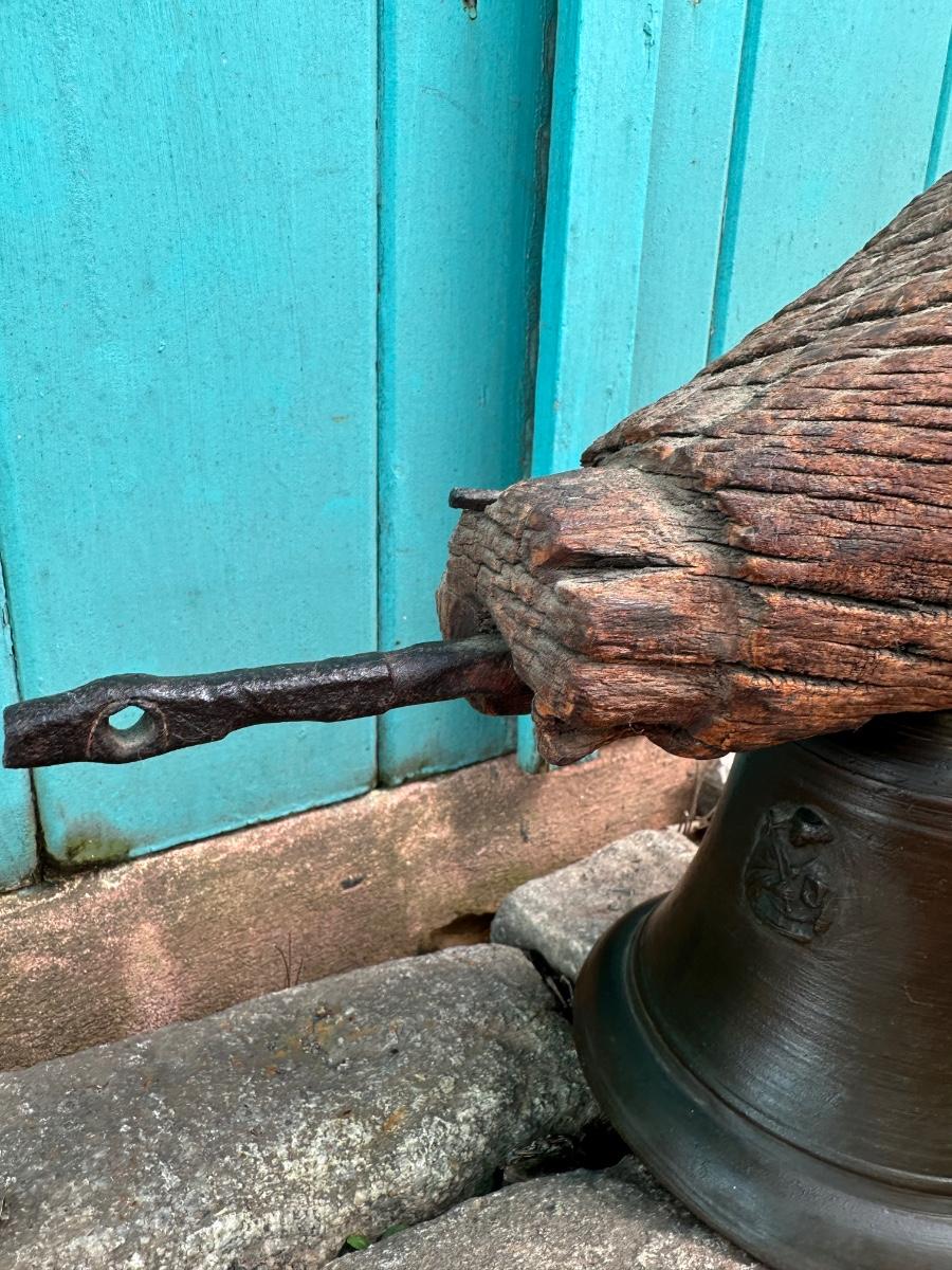 Missing left iron piece on wood and missing piece of wood on bottom left.