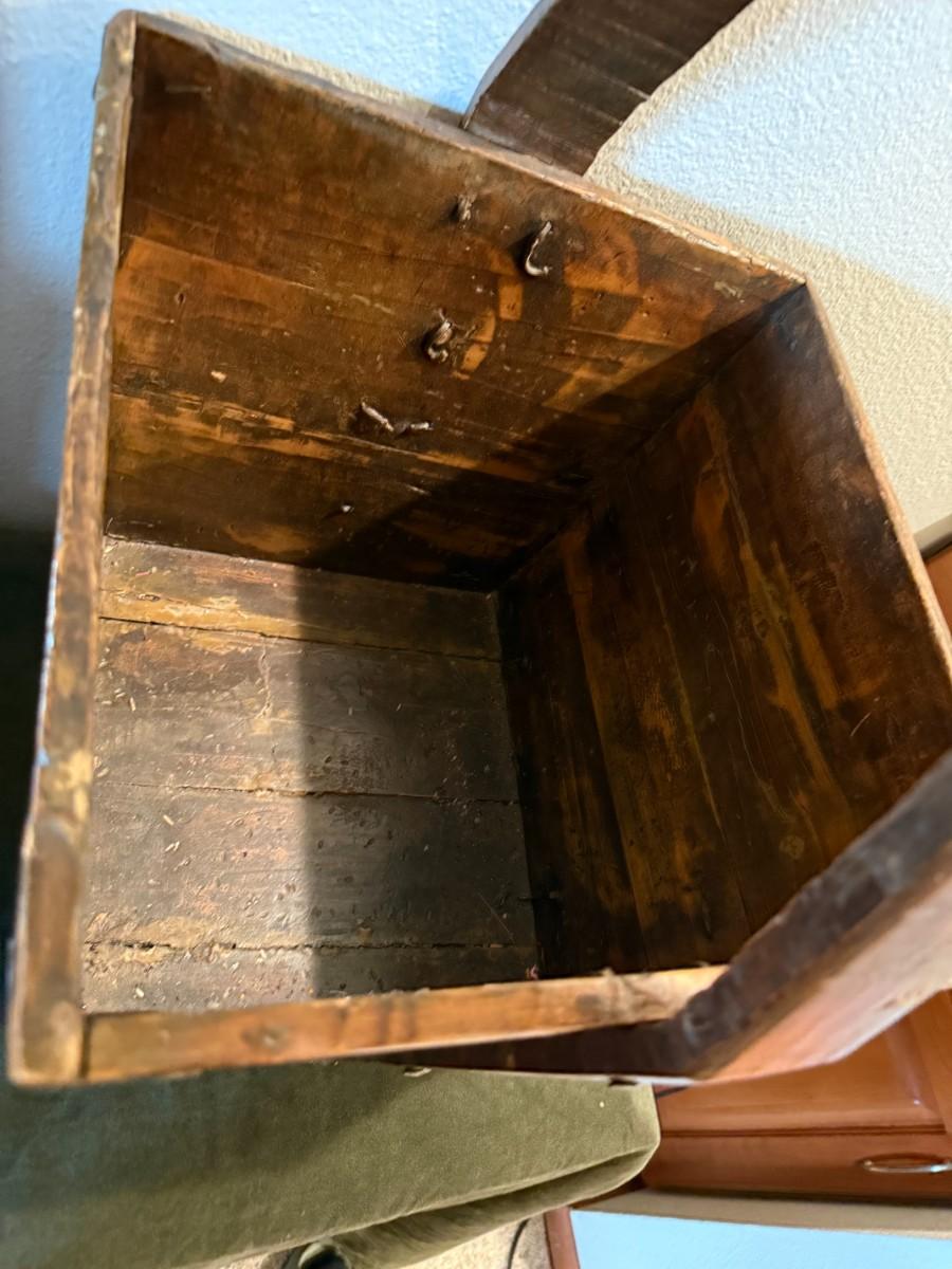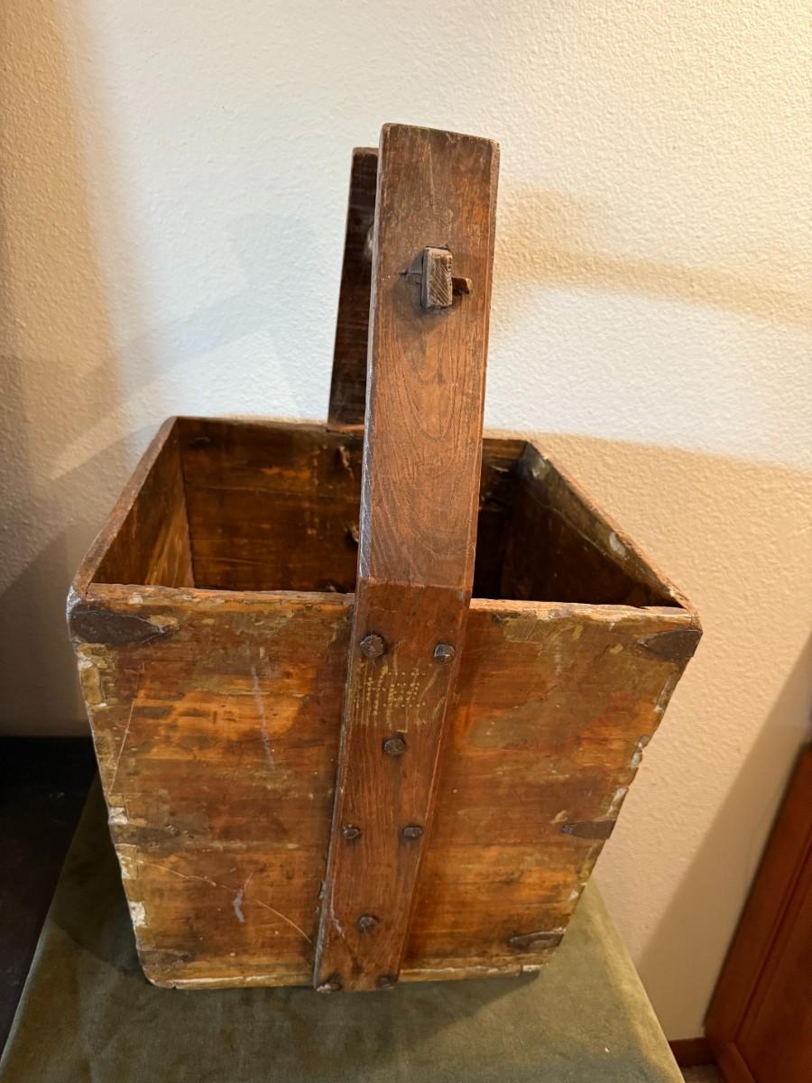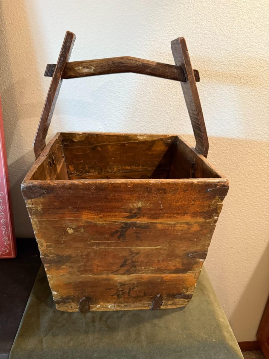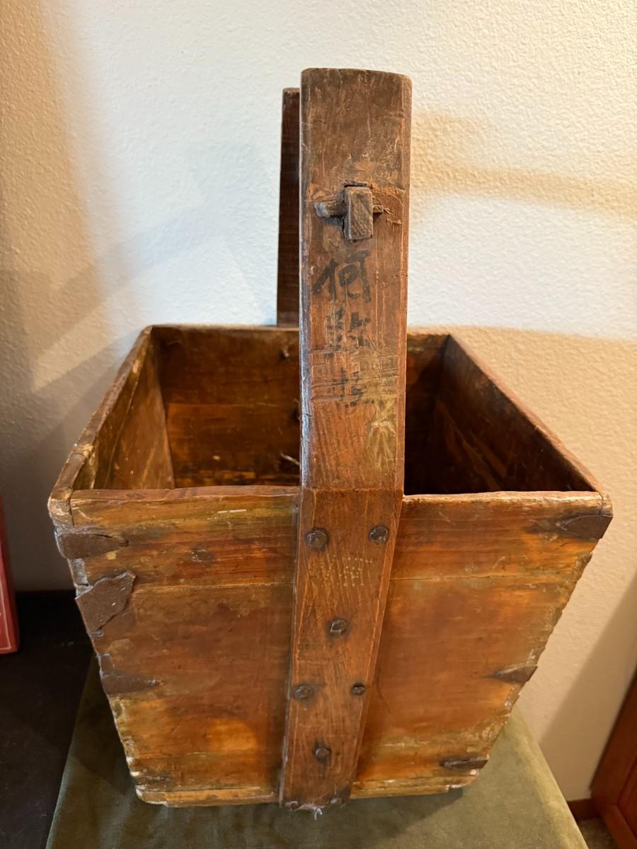 Pre-owned. Large Antique Chinese Elmwood Grain Basket Carrier. 23in Tall | 13.5in x 13.7/8 opening.