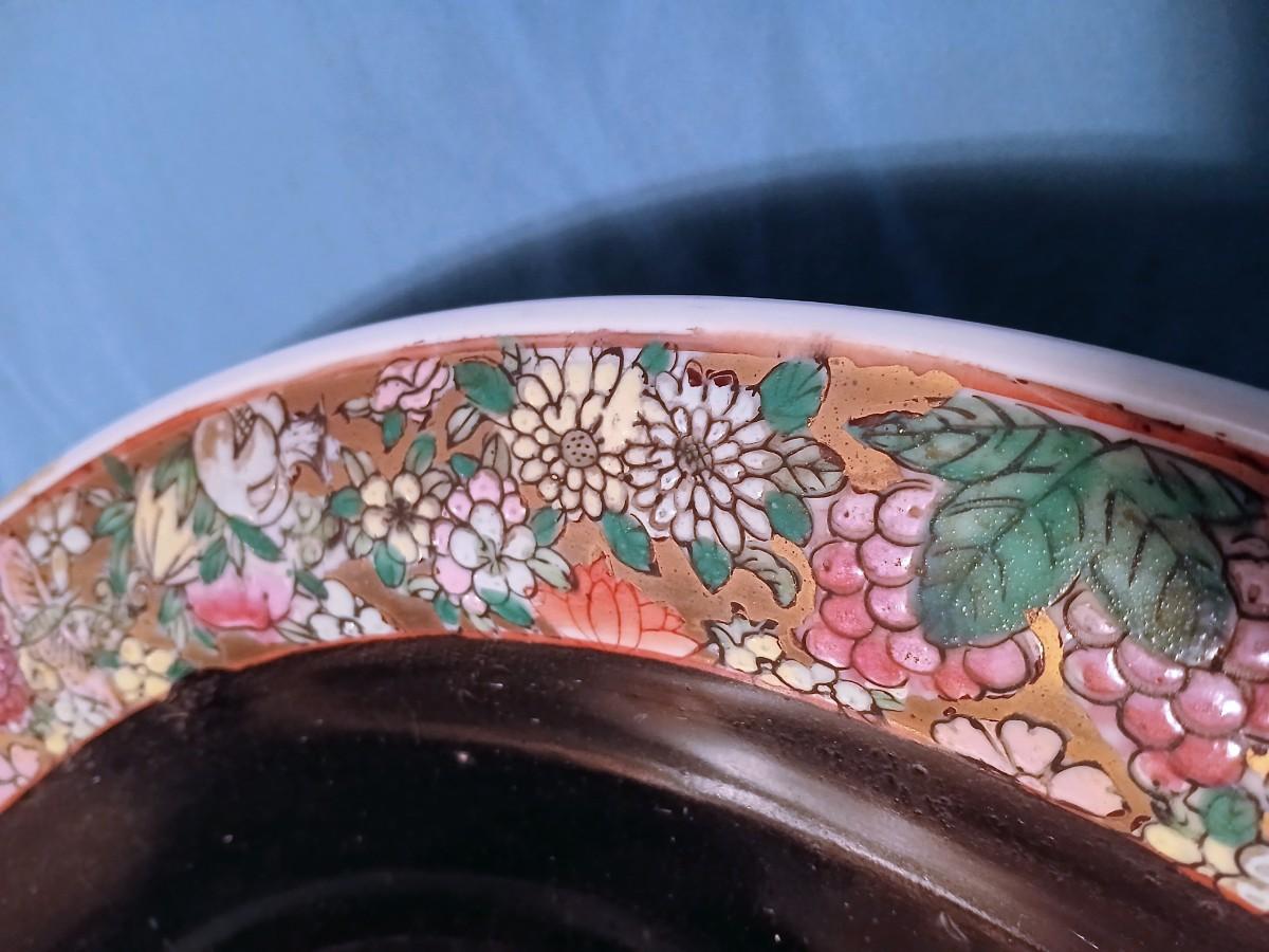 Large Antique Chinese Porcelain Bowl or Charger - Black Glaze w/Multicolor & Gilded Floral Border