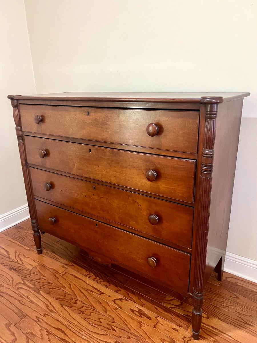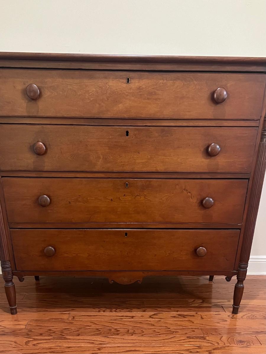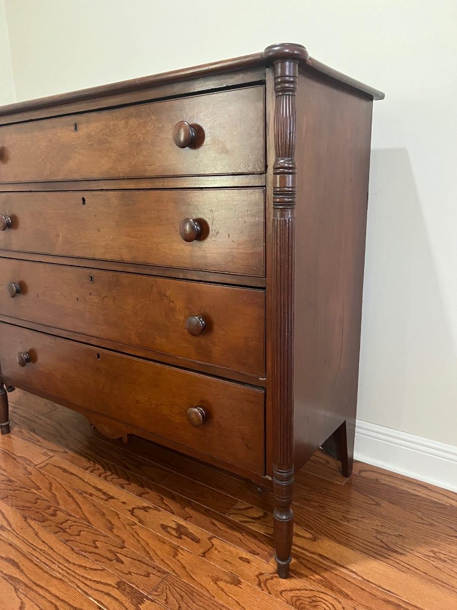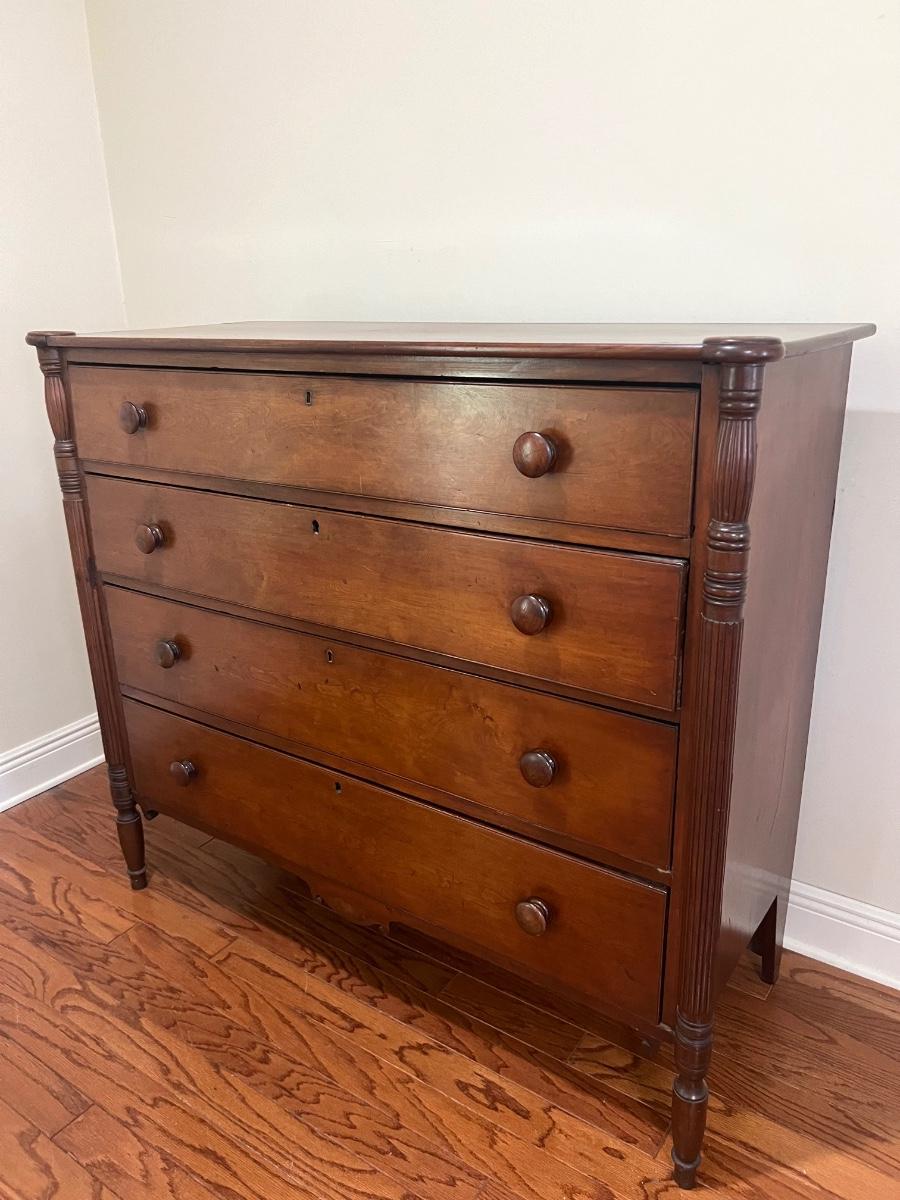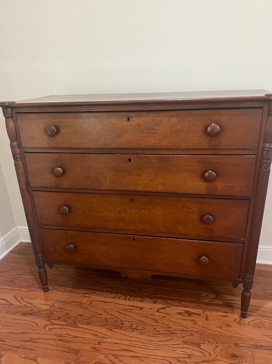 This piece is larger than it looks in the photos! LARGE Antique Dresser with 4 drawers. . Pictures don’t do this piece justice on size or beauty! This piece is solid wood. Measures 44 inches tall, 49 inches wide and 20 inches deep.