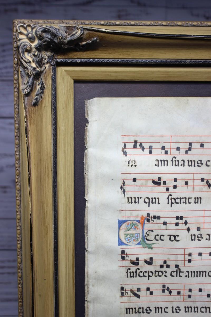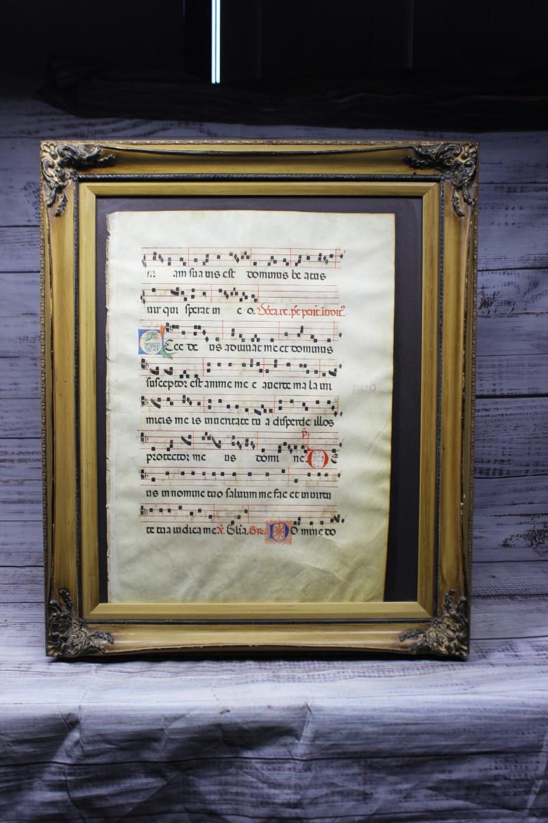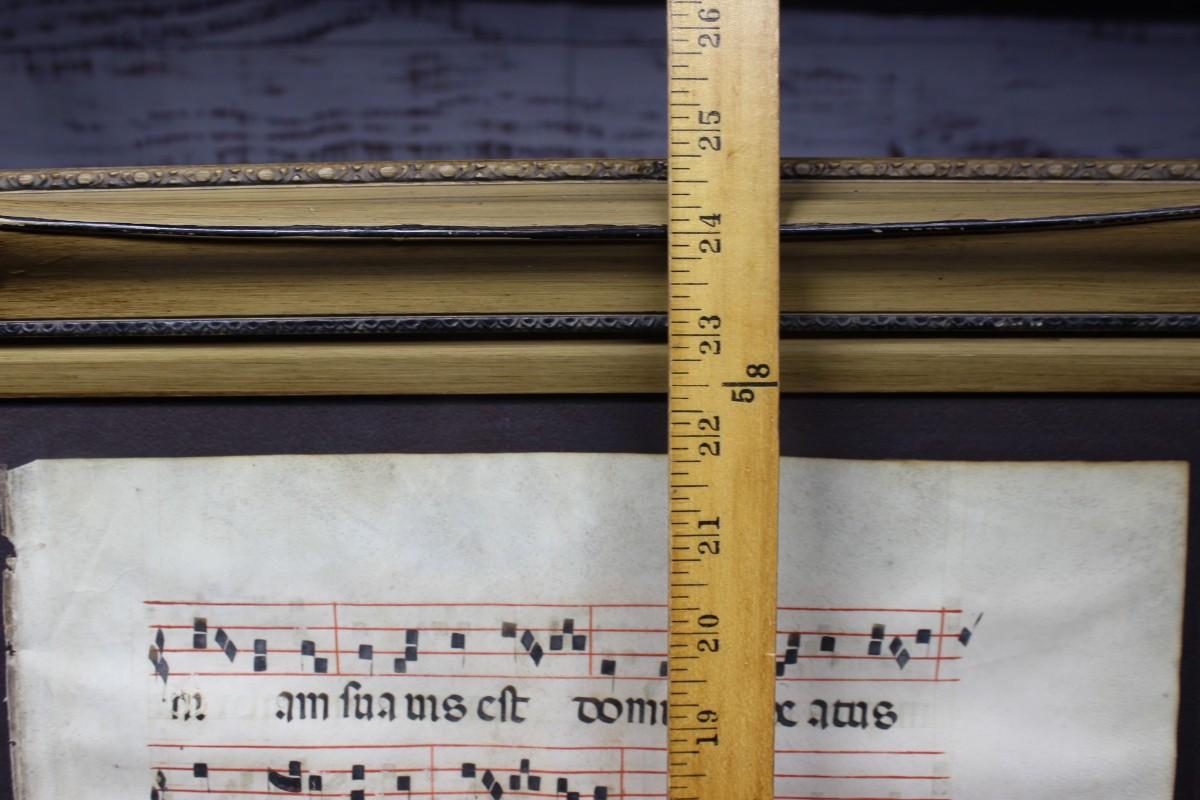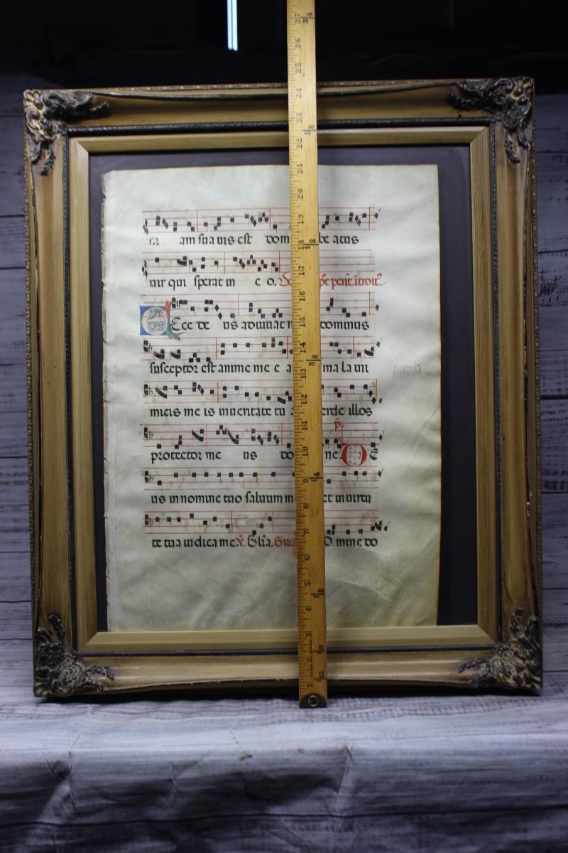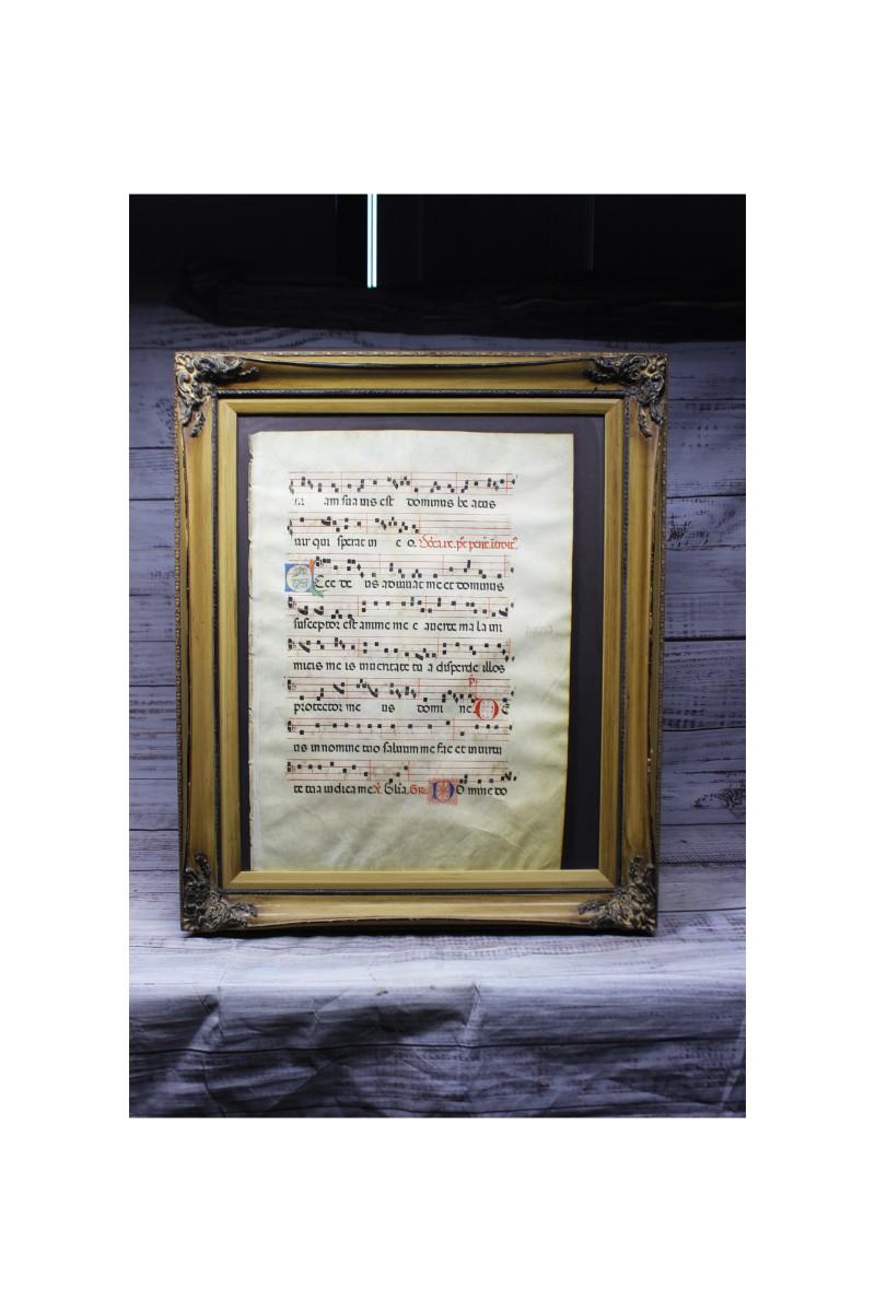 Large Antique Framed Latin Music Religious Chant Sheet, there is no significant damage to the frame or protective glass and is in overall good displayable condition. The music sheet is a little too small for the frame, check pictures for more details and for sizing.