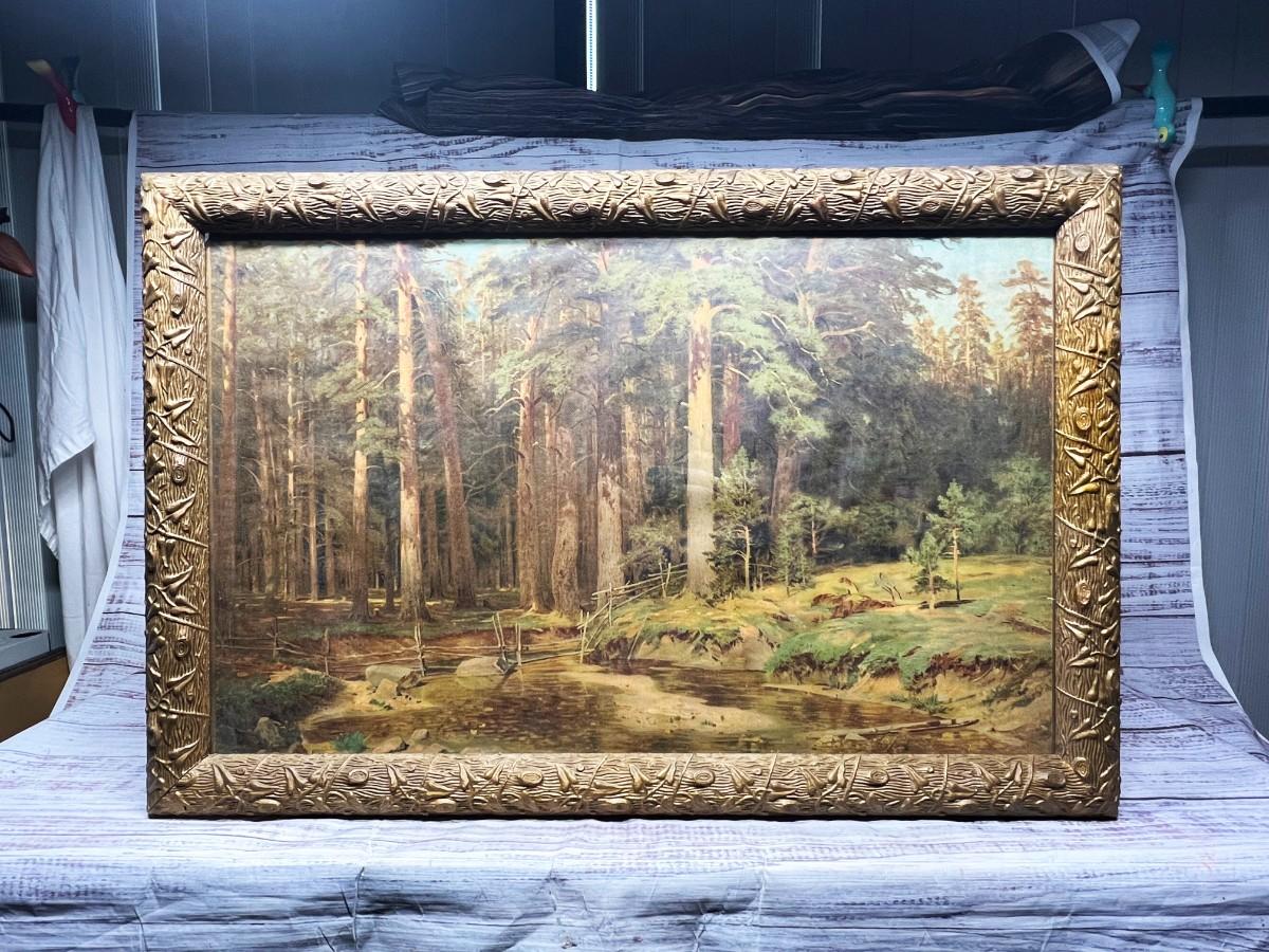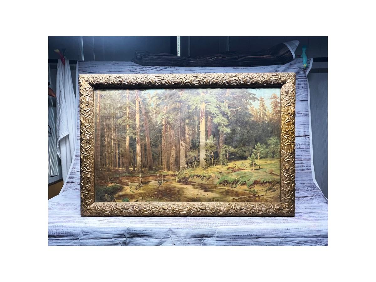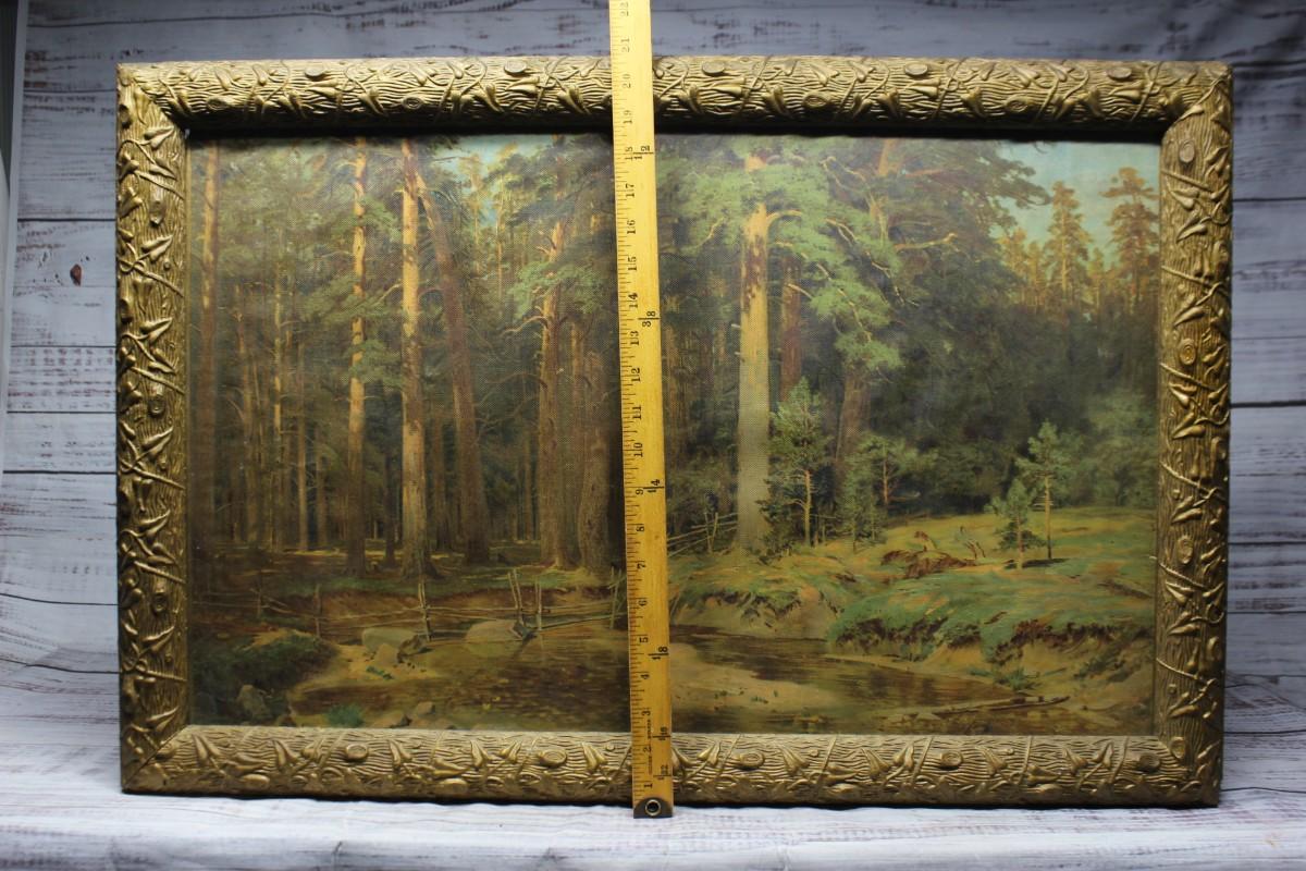 Large Antique Framed Nature Scenery Print of Mast Pine Grove by Ivan Shishkin, there is no significant damage to the frame or the protective glass and is in good displayable condition, Check pictures for more details and for sizing.