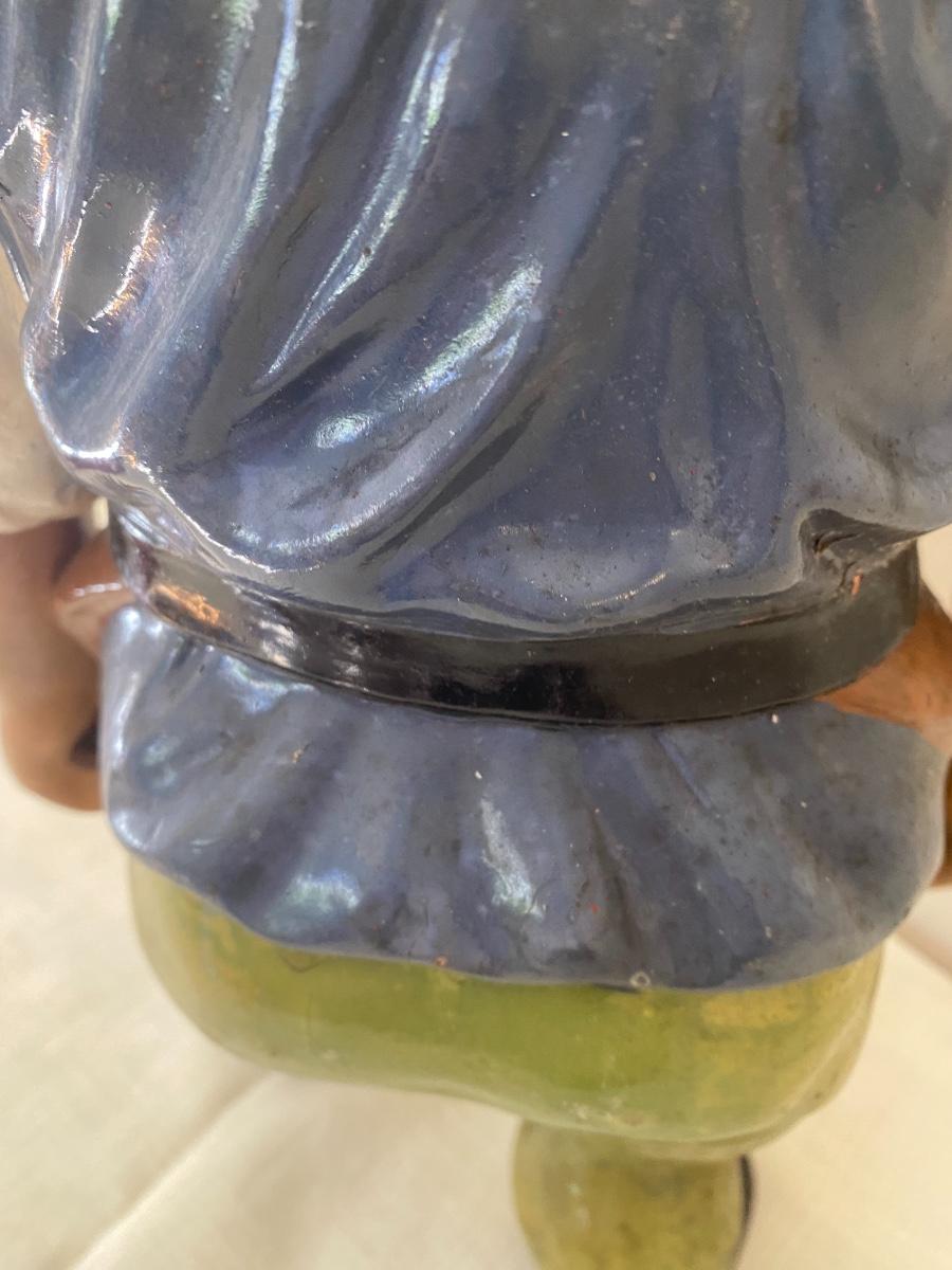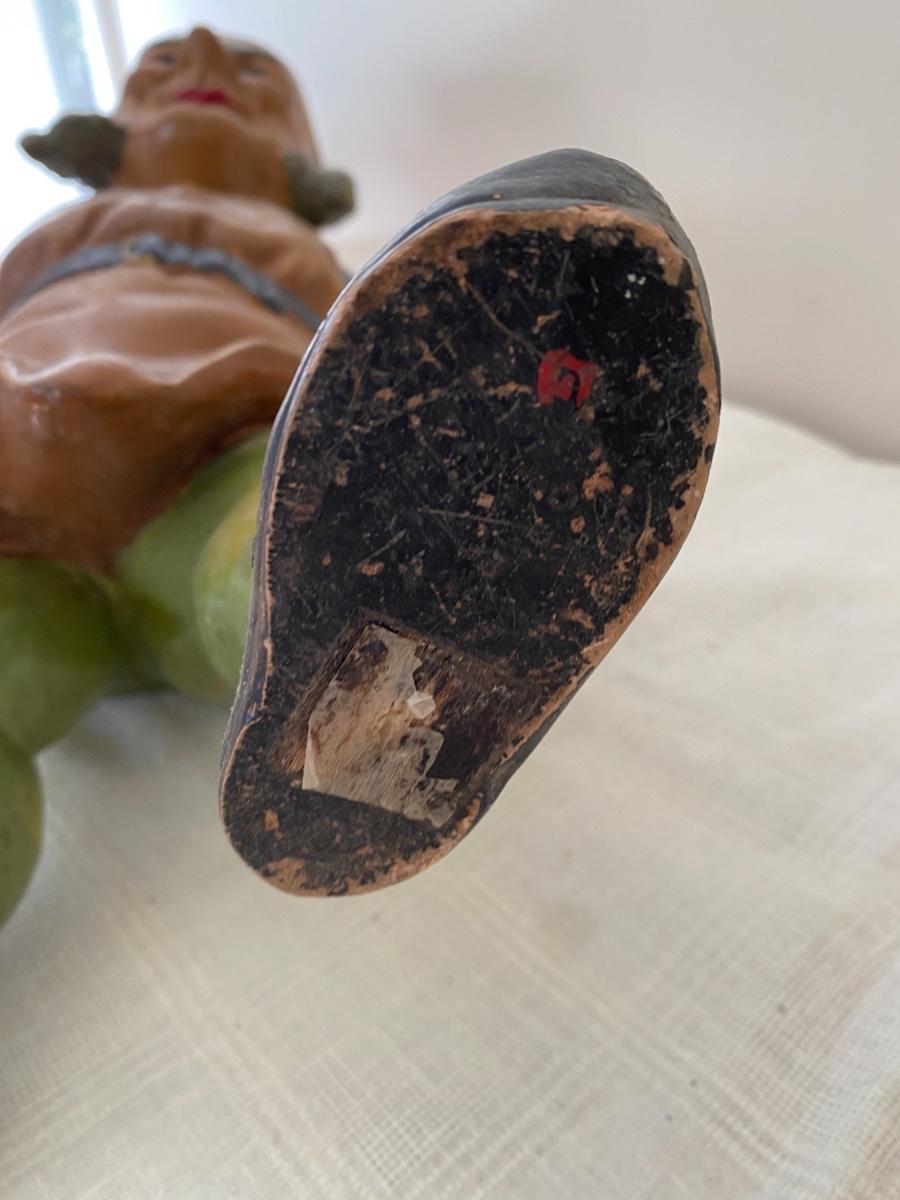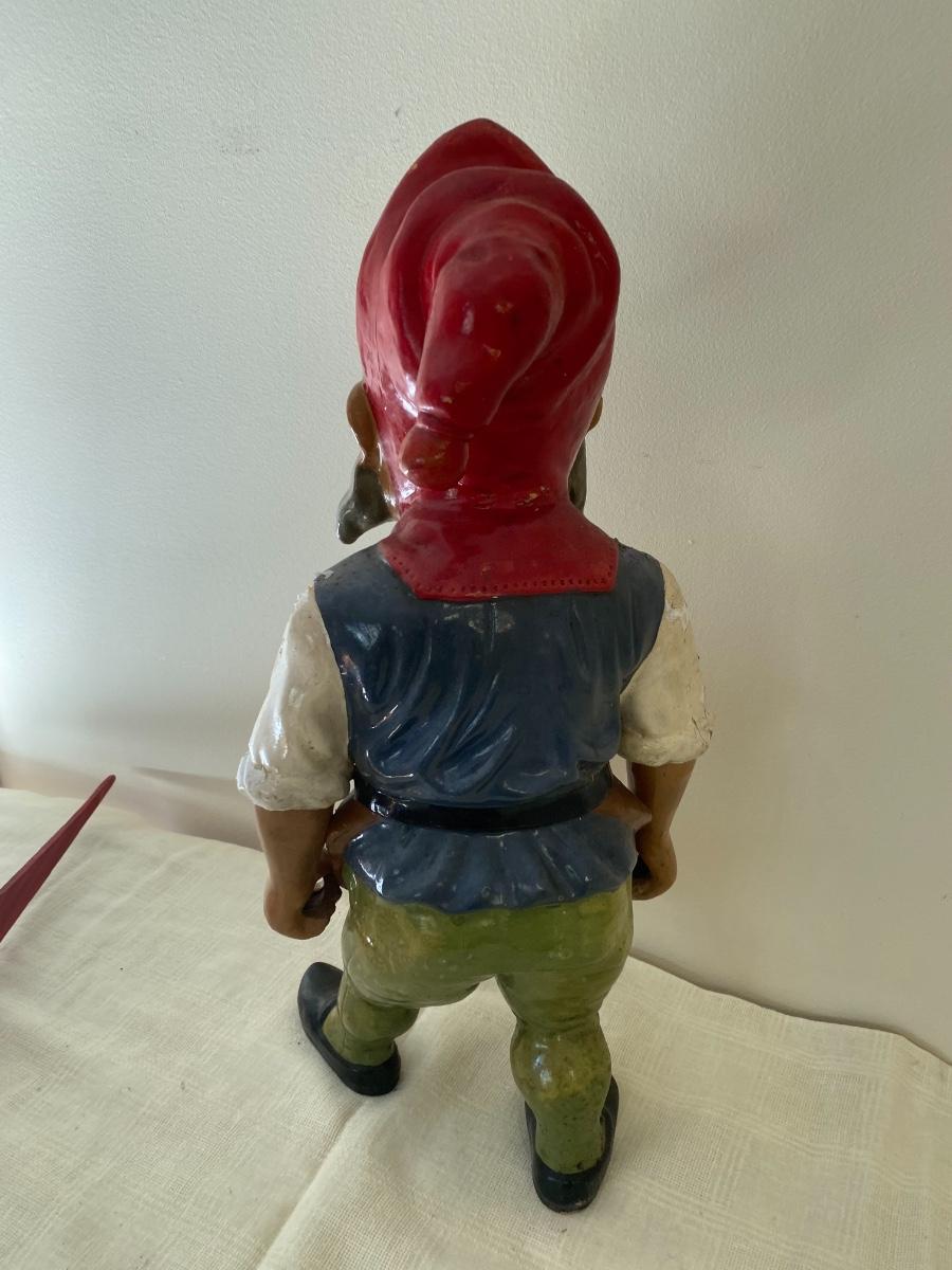 Large Antique German garden gnome with wheelbarrow .The paint is chipping. As is. Stamped West Germany on the bottom. In the kitchen on the counter behind the sink. If shipped, then the item will be packed and shipped by UPS at cost to the buyer.