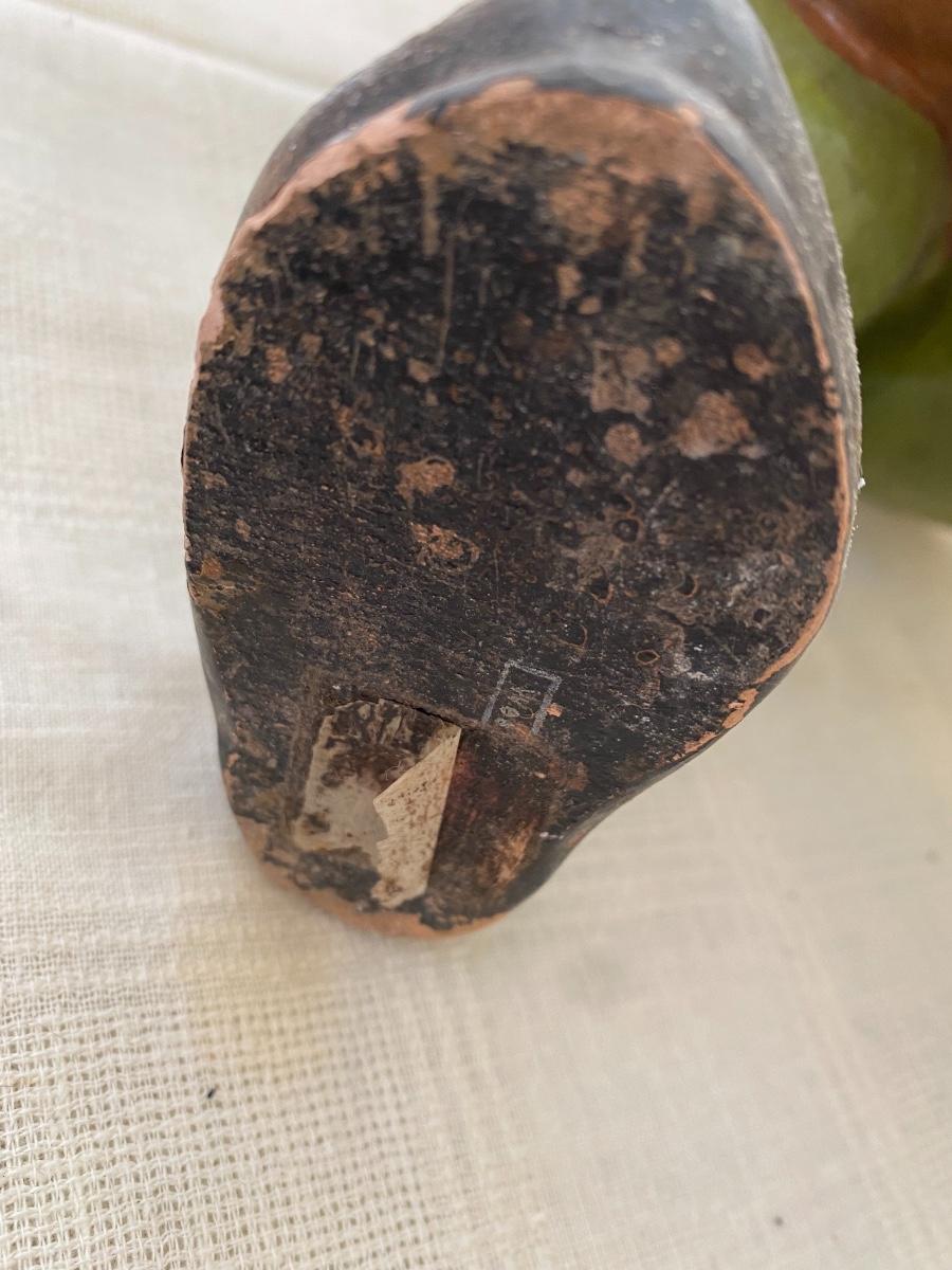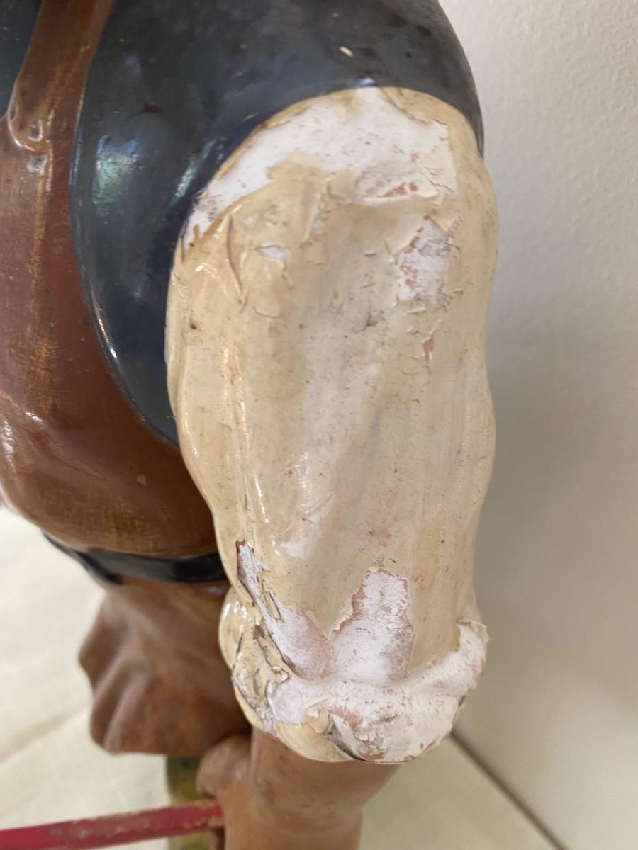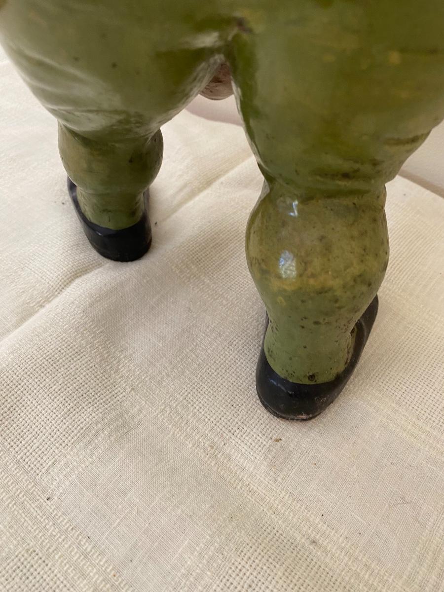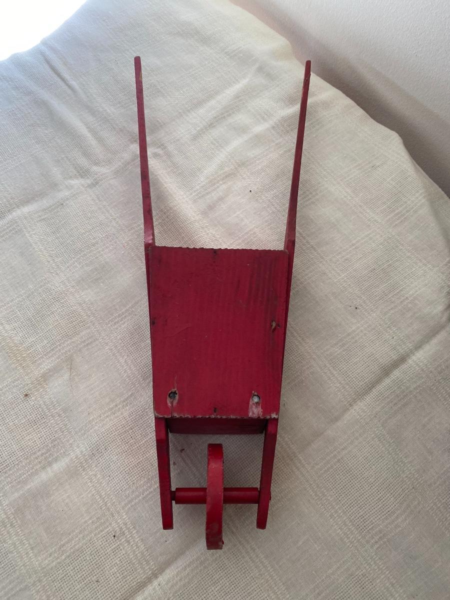 Large Antique German garden gnome with wheelbarrow .The paint is chipping. As is. Stamped West Germany on the bottom. In the kitchen on the counter behind the sink. If shipped, then the item will be packed and shipped by UPS at cost to the buyer.