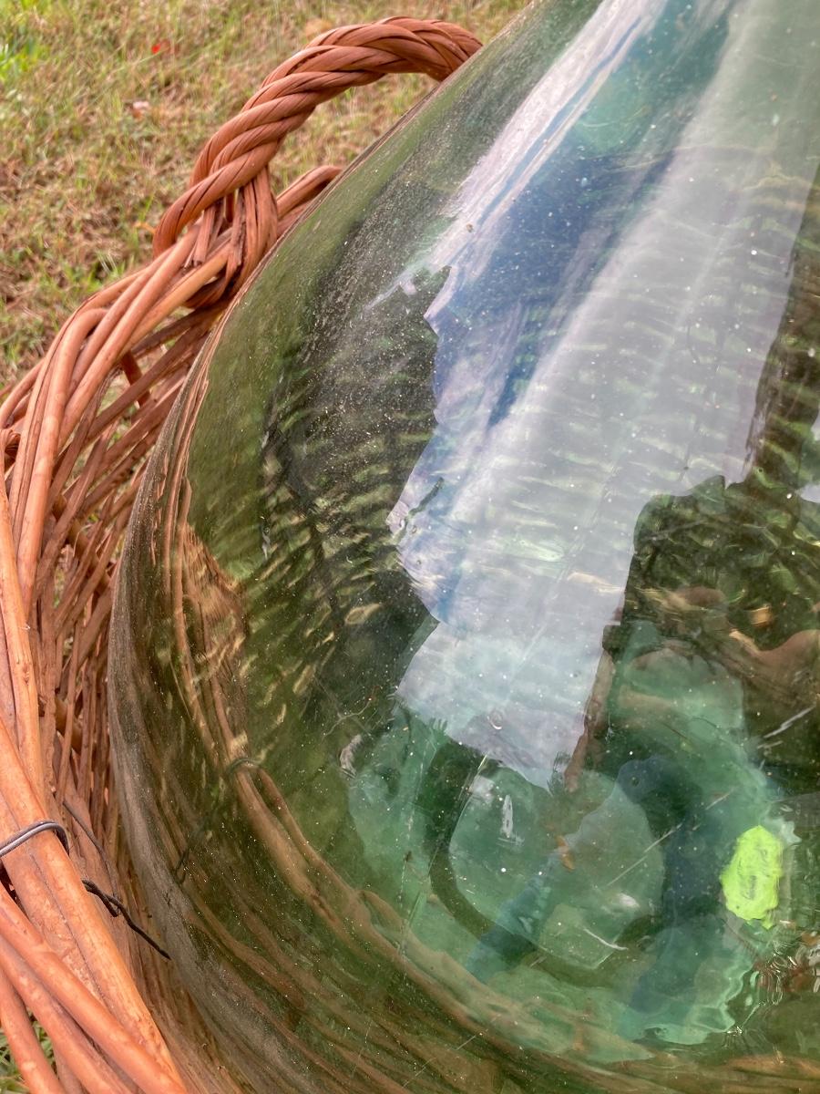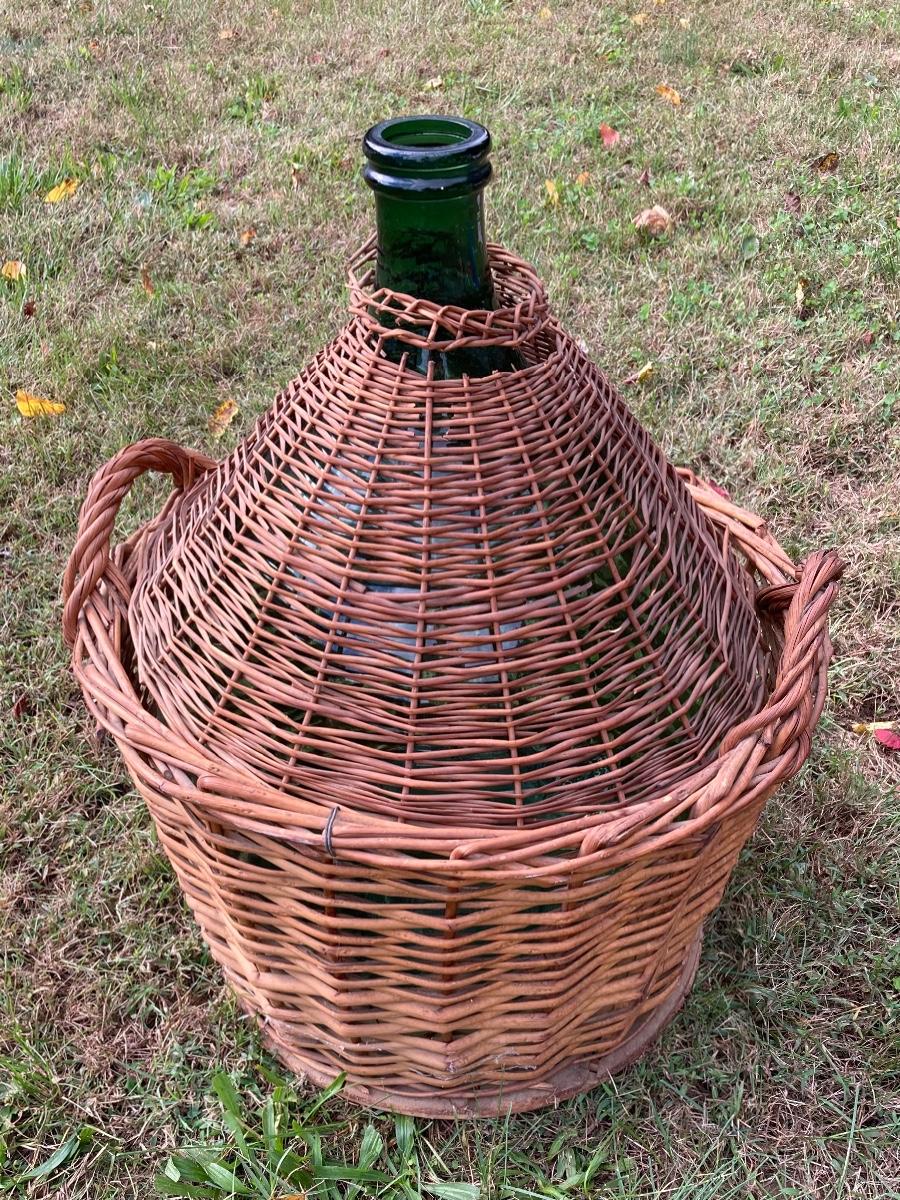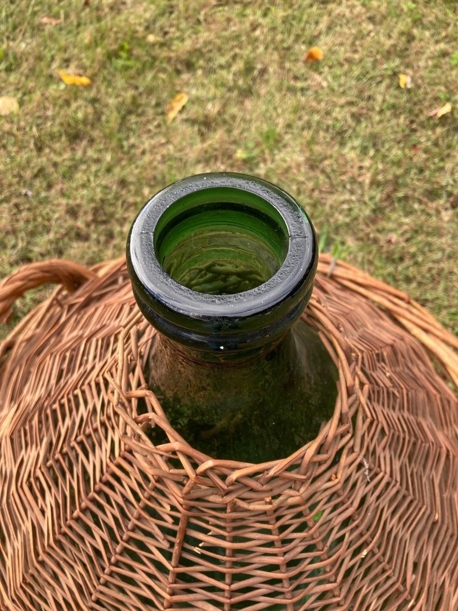 Large Antique Green Glass 26” Demijohn Vessel with Wicker “Crate”