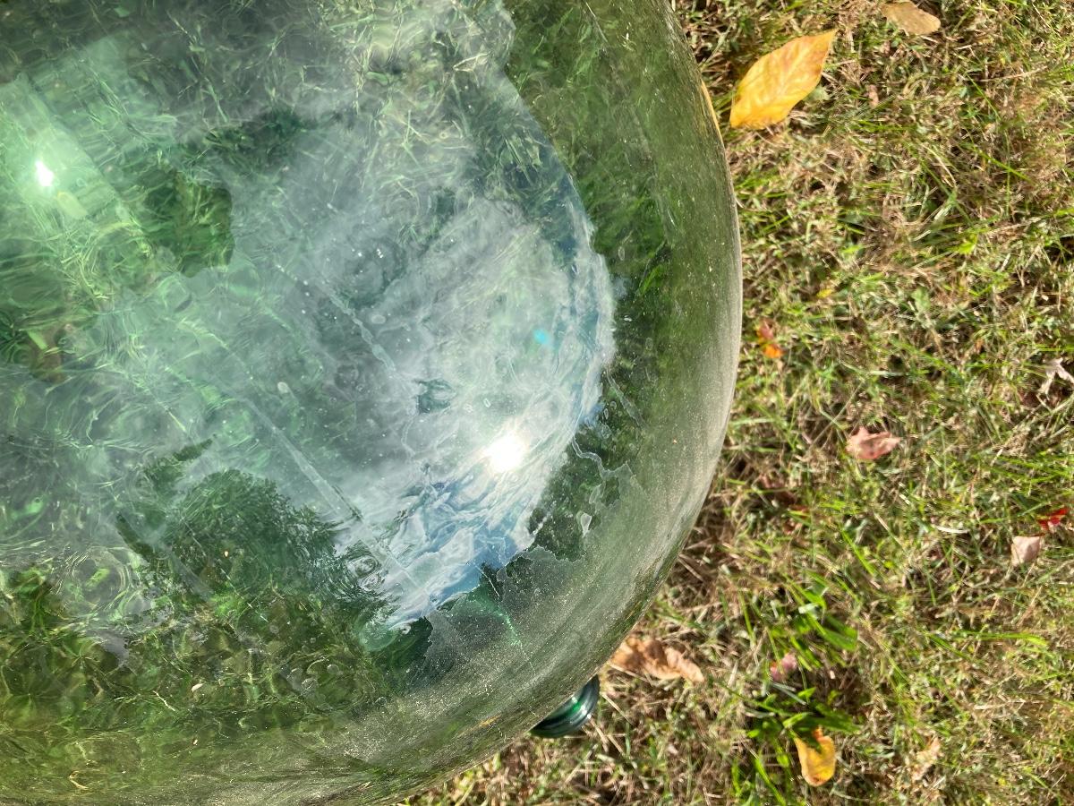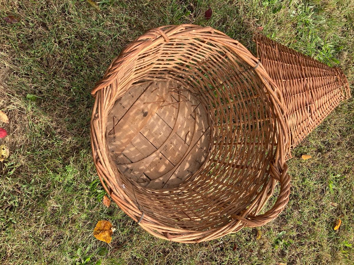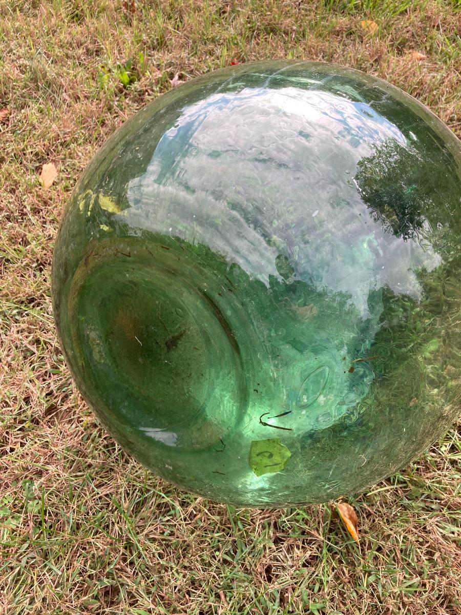 Large Antique Green Glass 26” Demijohn Vessel with Wicker “Crate”