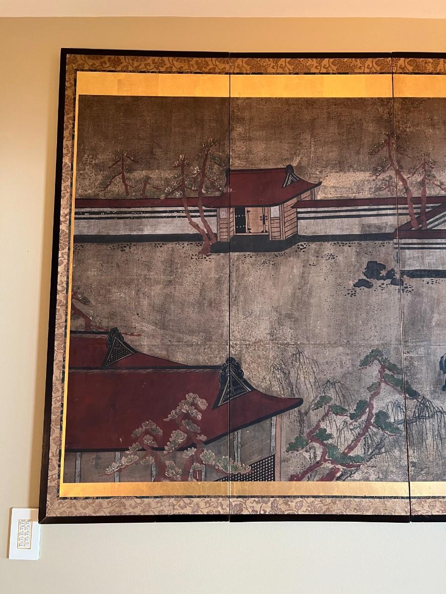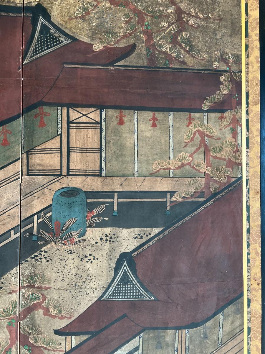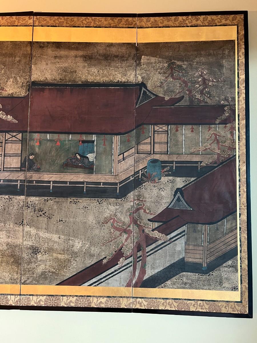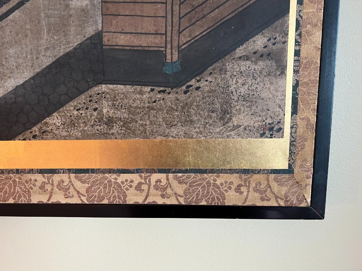 Antique Japanese hand painted 6 panel framed scroll depicting an interior palace or estate walled courtyard scene. In good condition, with some signs of aging, as shown.