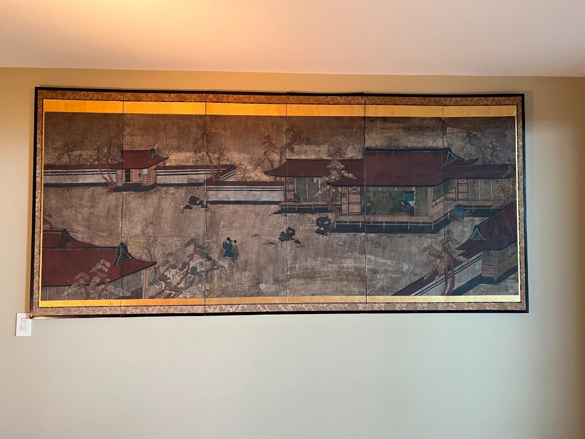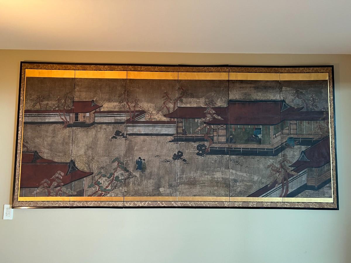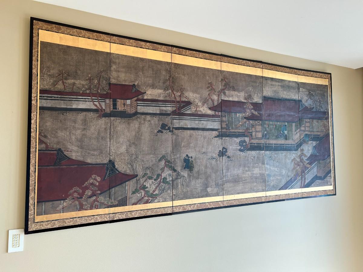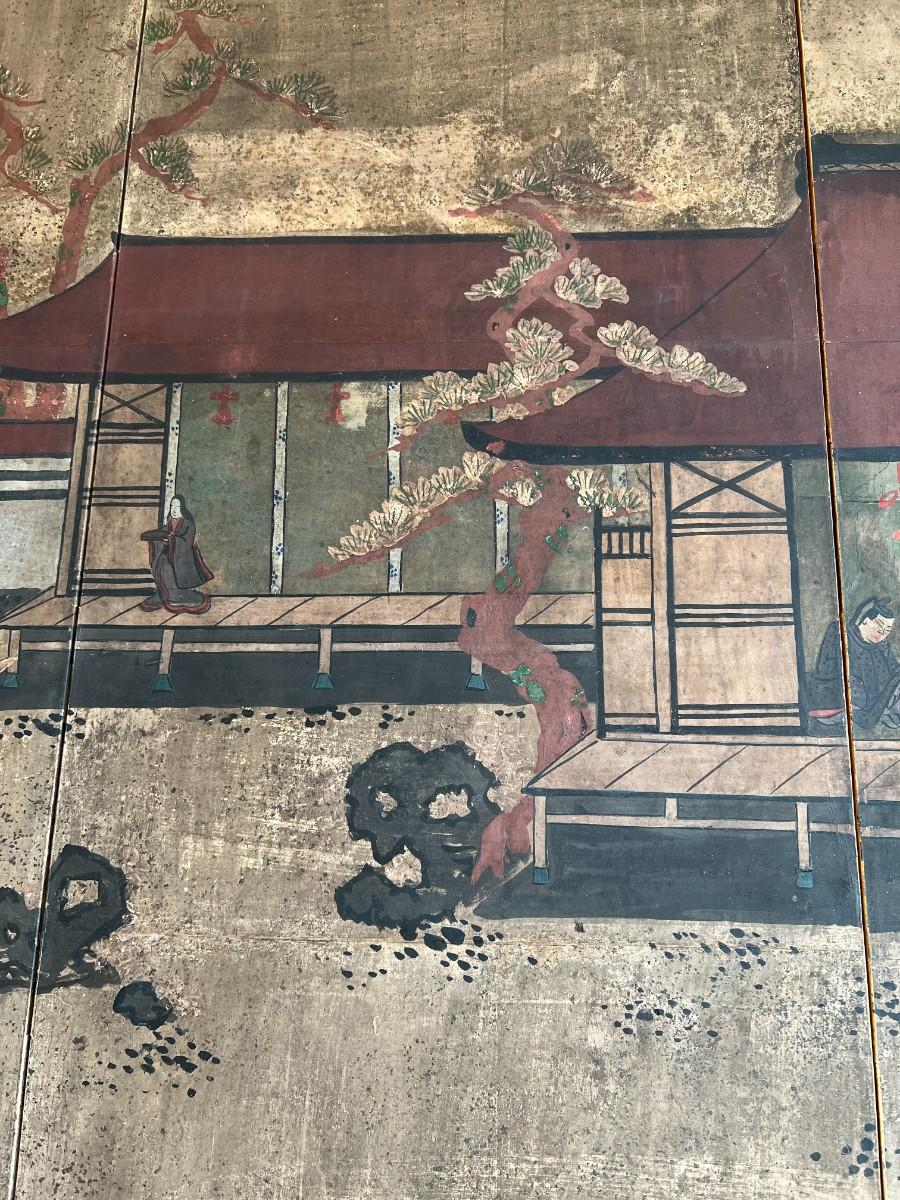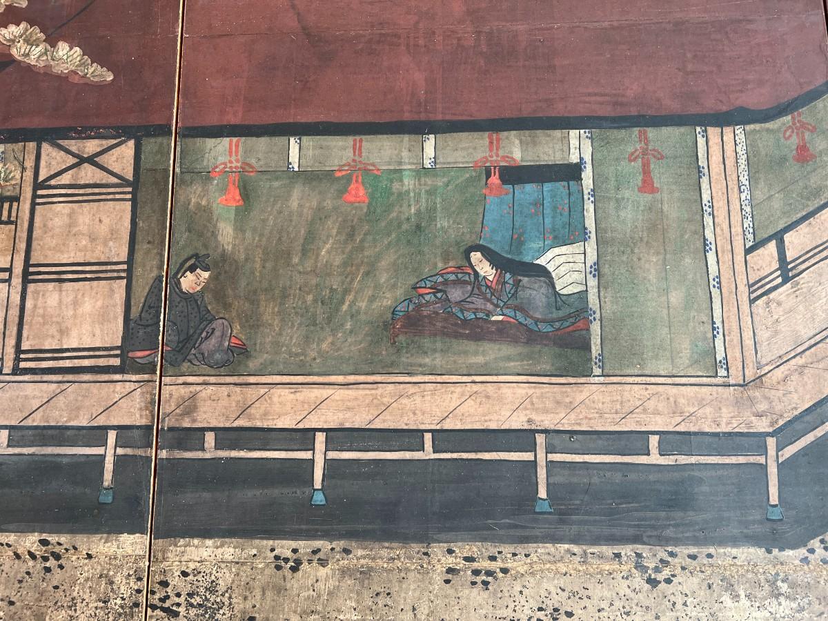 Antique Japanese hand painted 6 panel framed scroll depicting an interior palace or estate walled courtyard scene. In good condition, with some signs of aging, as shown.