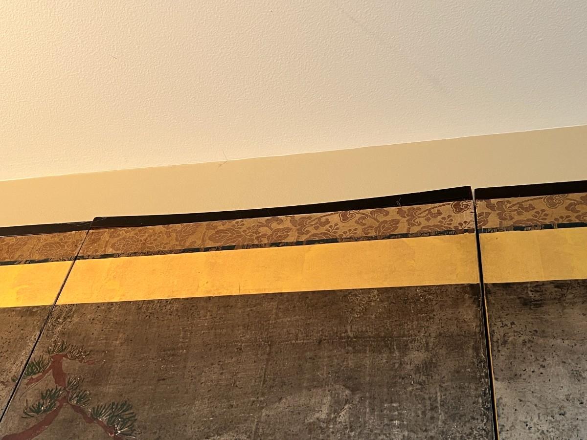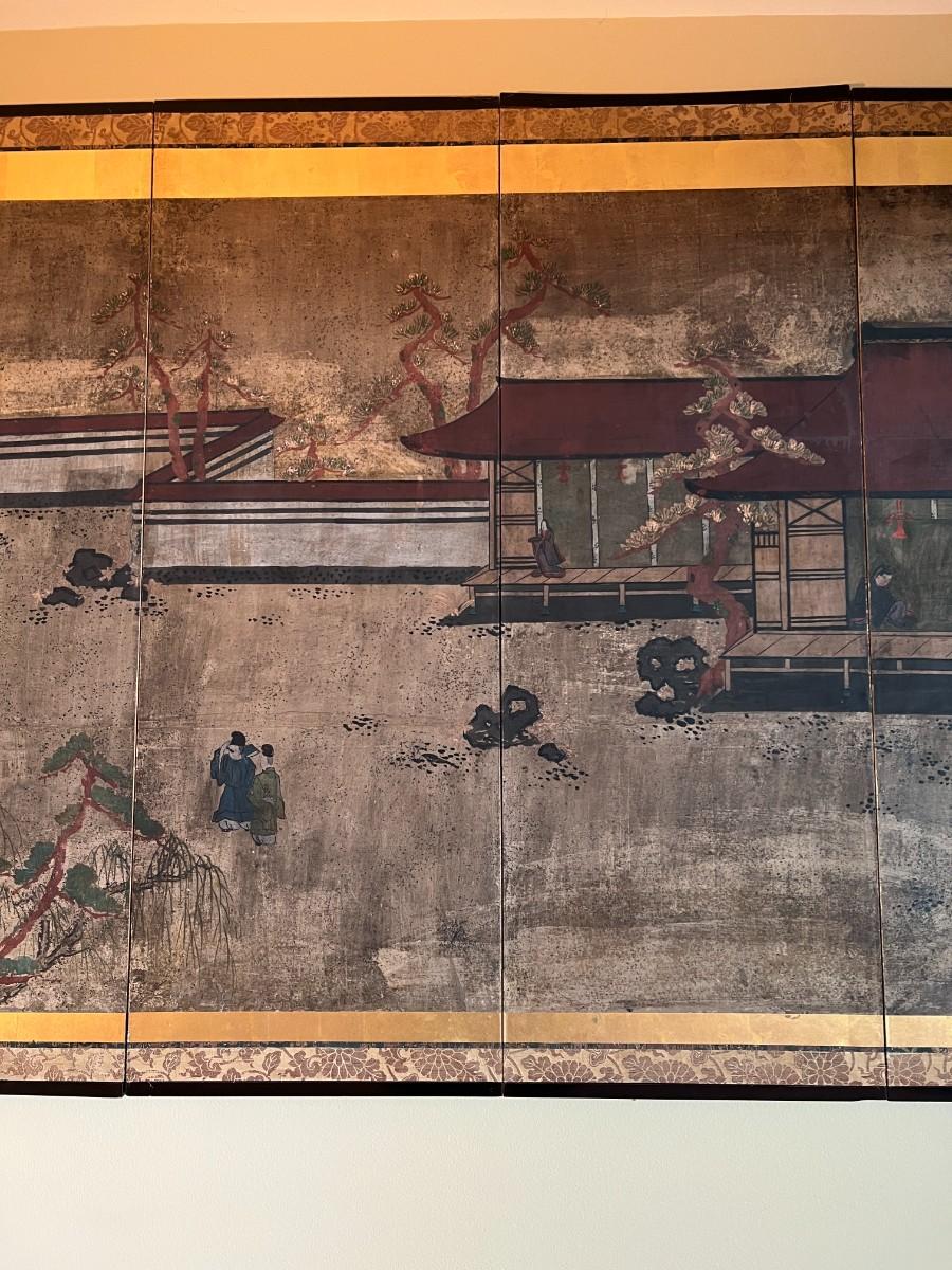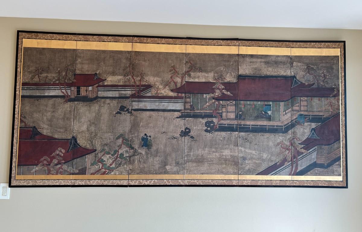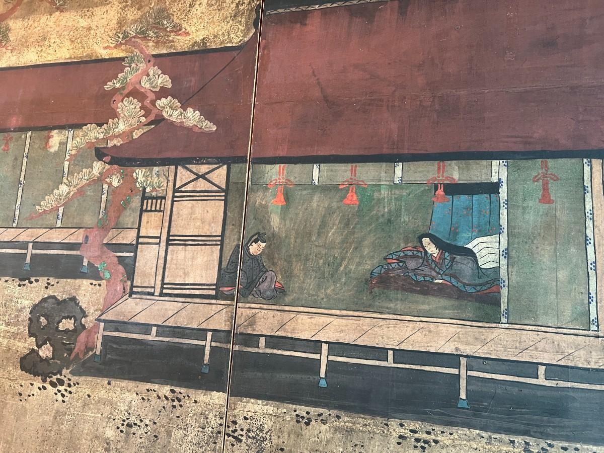 Antique Japanese hand painted 6 panel framed scroll depicting an interior palace or estate walled courtyard scene. In good condition, with some signs of aging, as shown.
