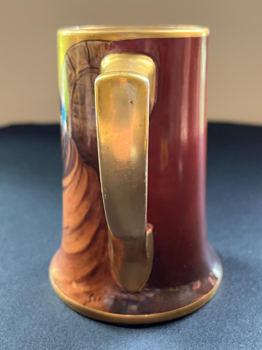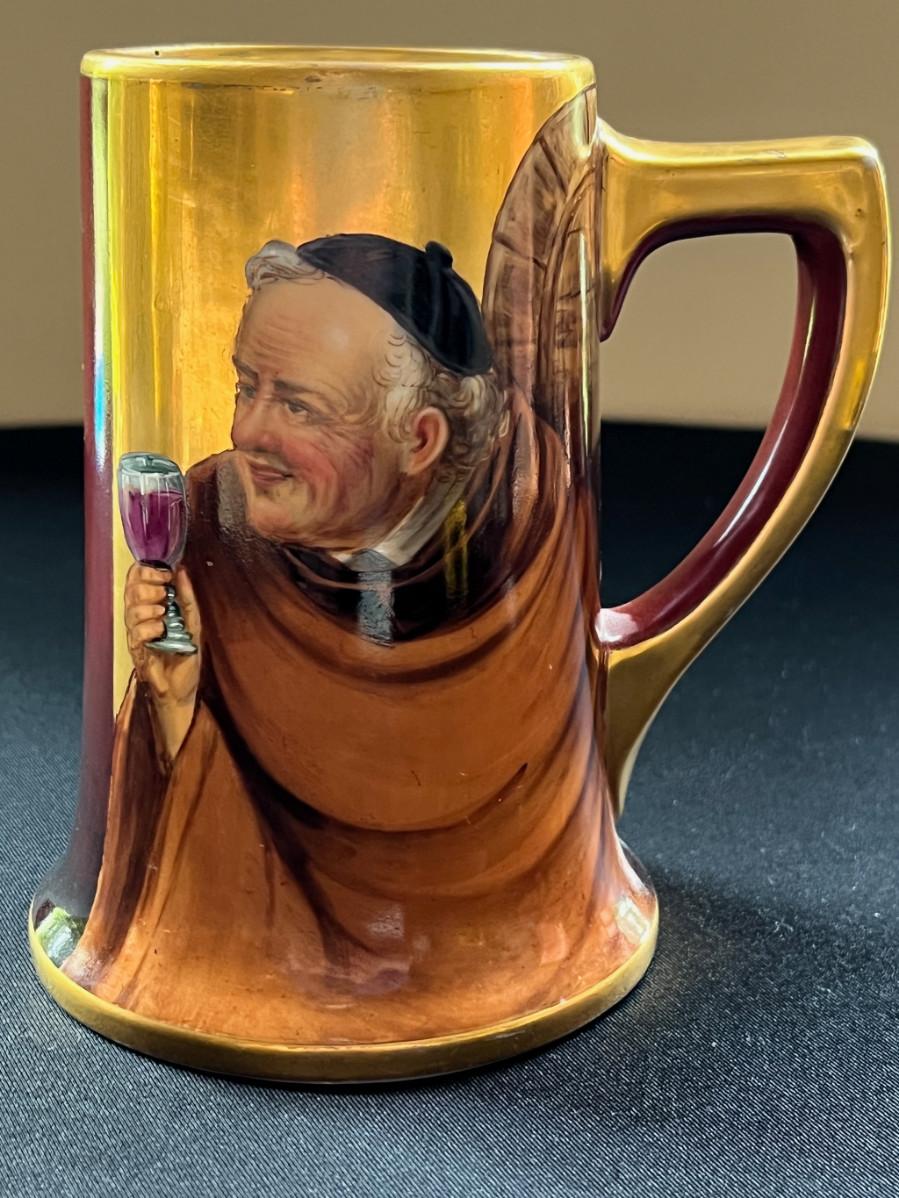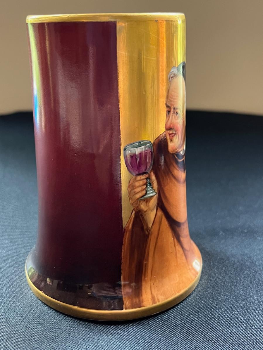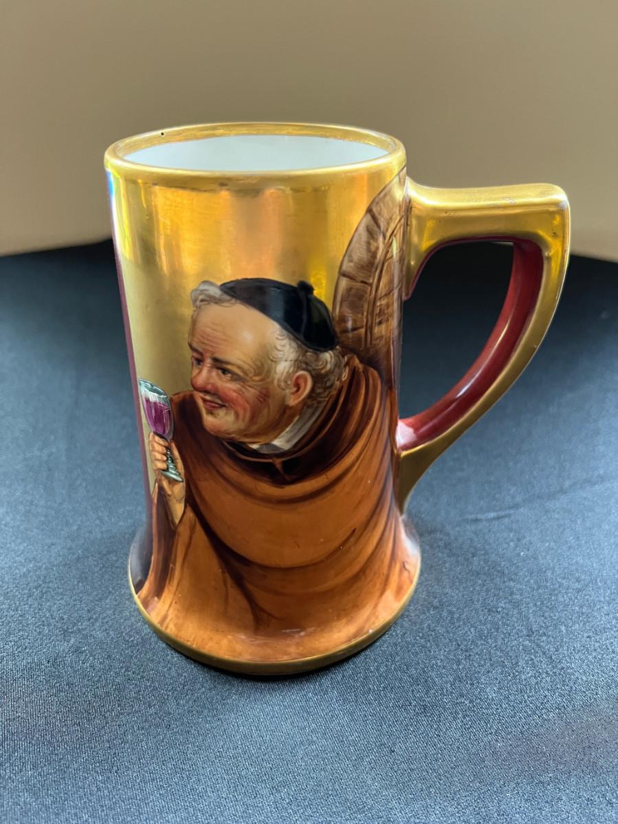 The subject item is an antique Limoges six inch stein with a heavy gold finish over-laying an oxblood red glaze and decorated with a smiling monk holding a glass of wine. Signed under the handle.