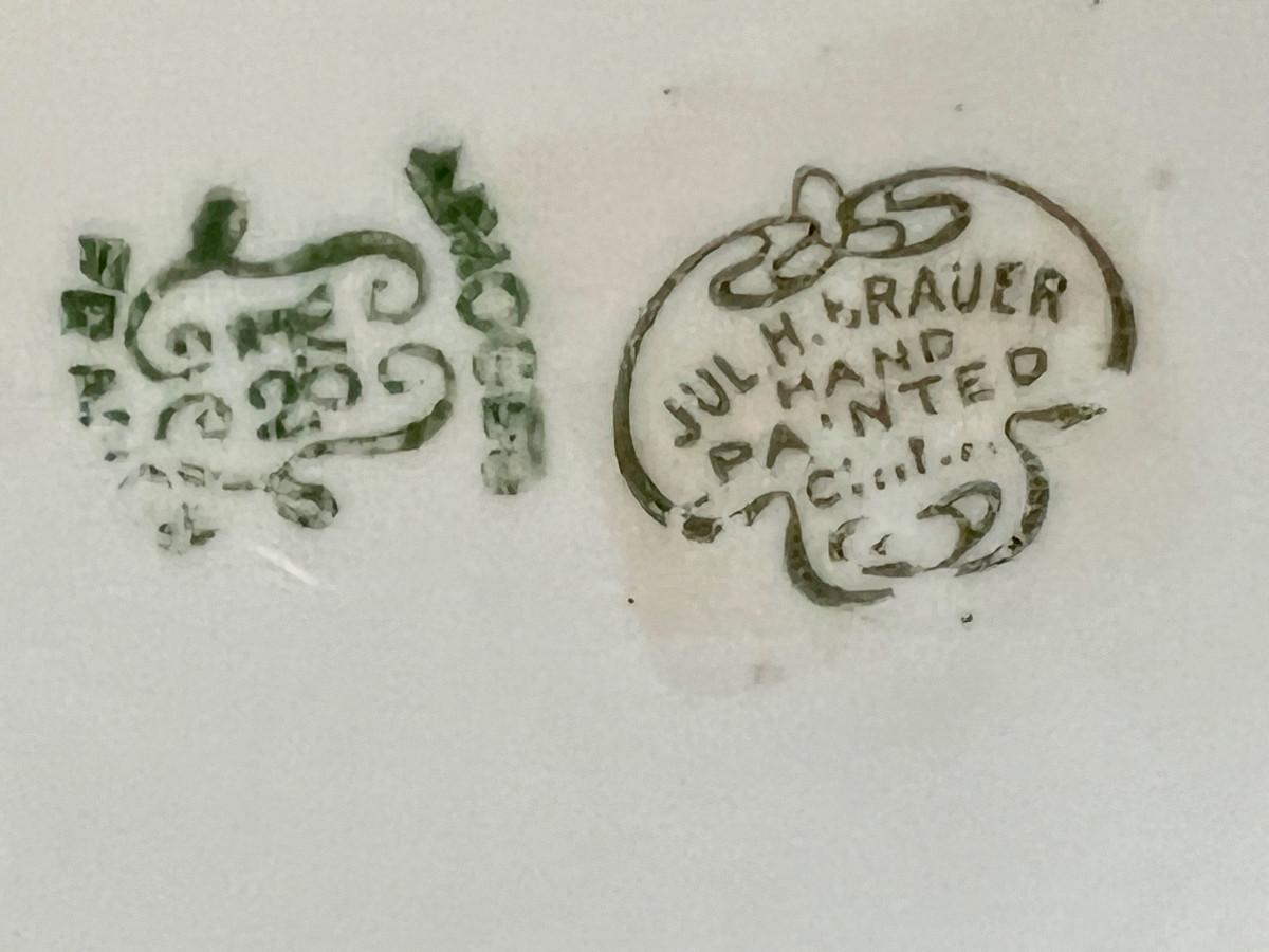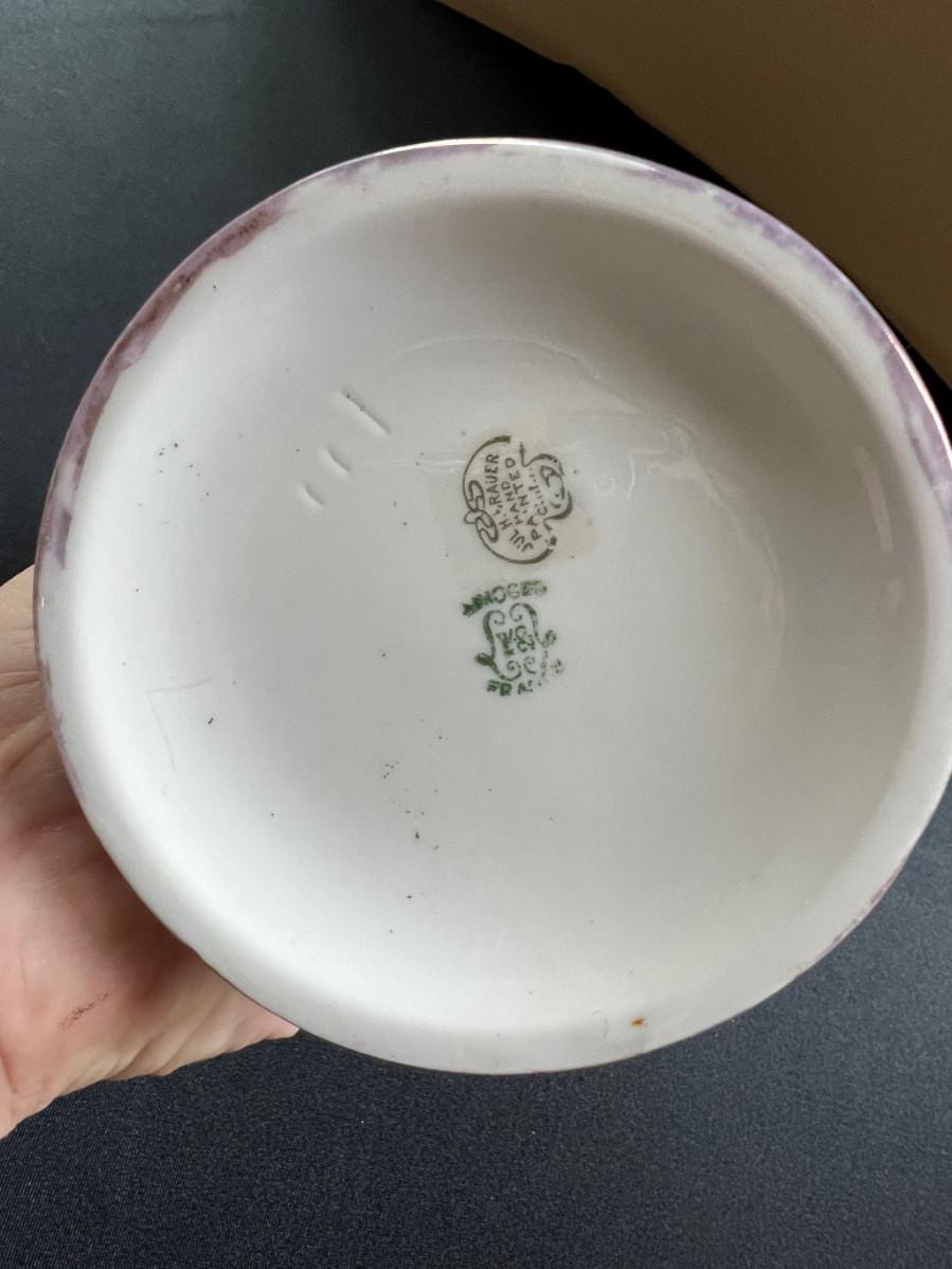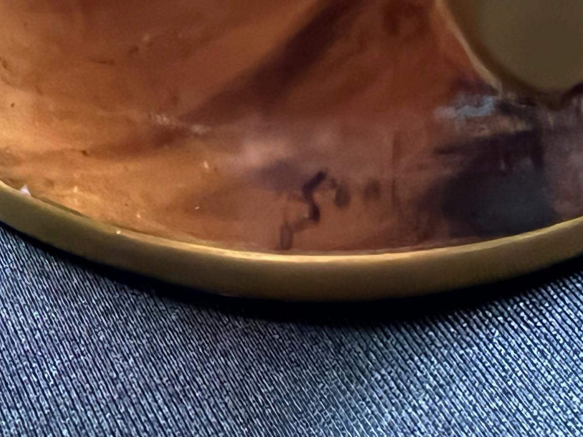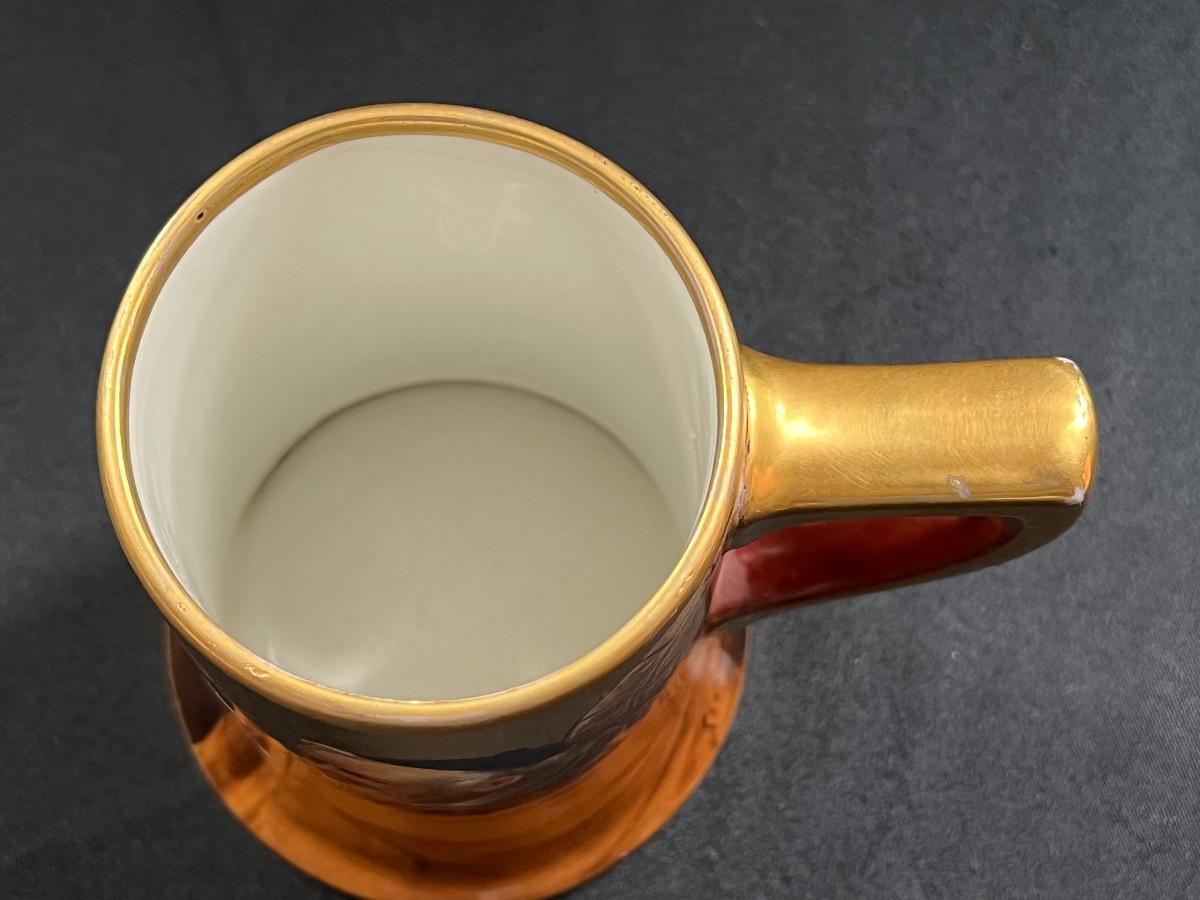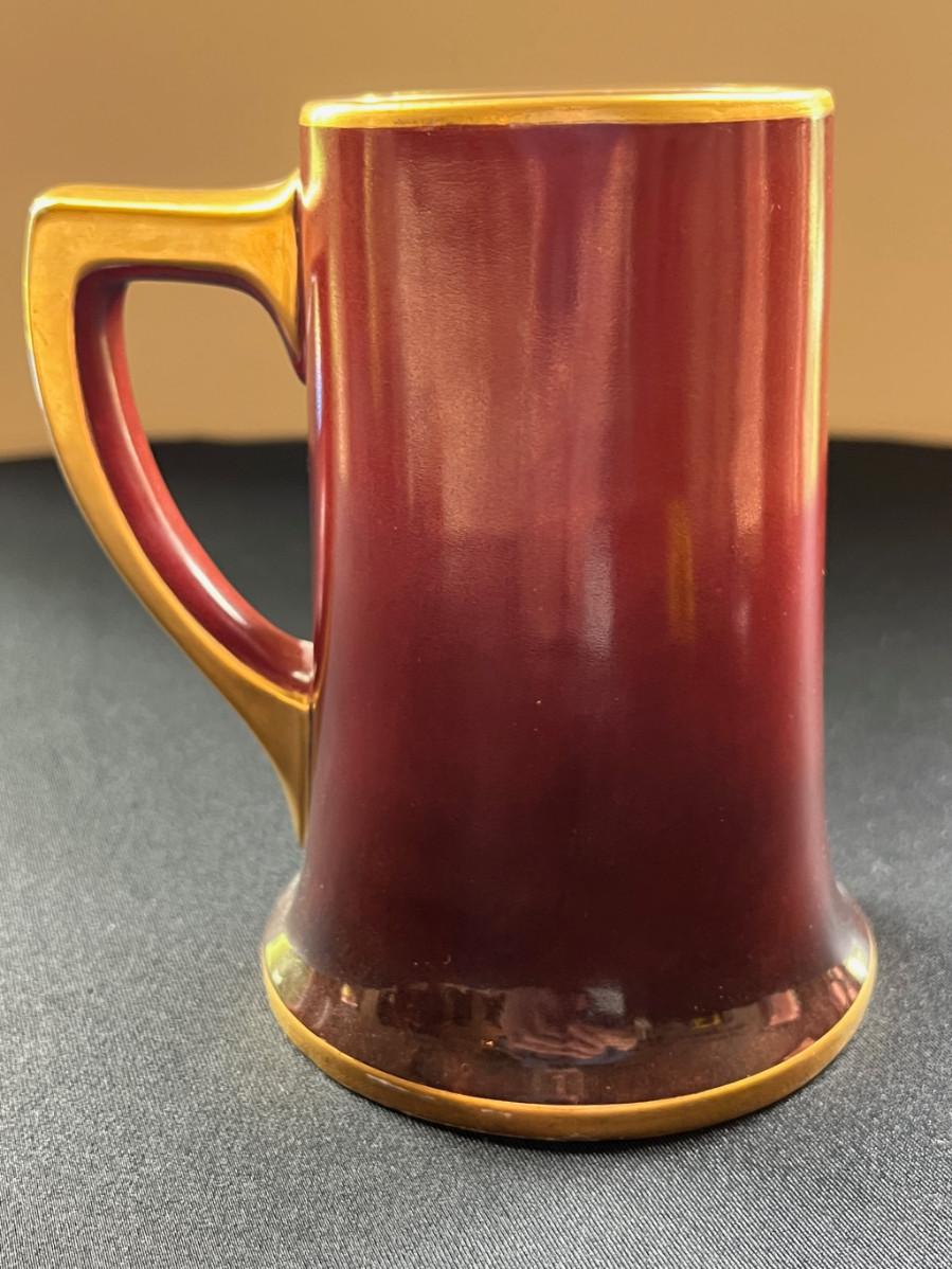 The subject item is an antique Limoges six inch stein with a heavy gold finish over-laying an oxblood red glaze and decorated with a smiling monk holding a glass of wine. Signed under the handle.