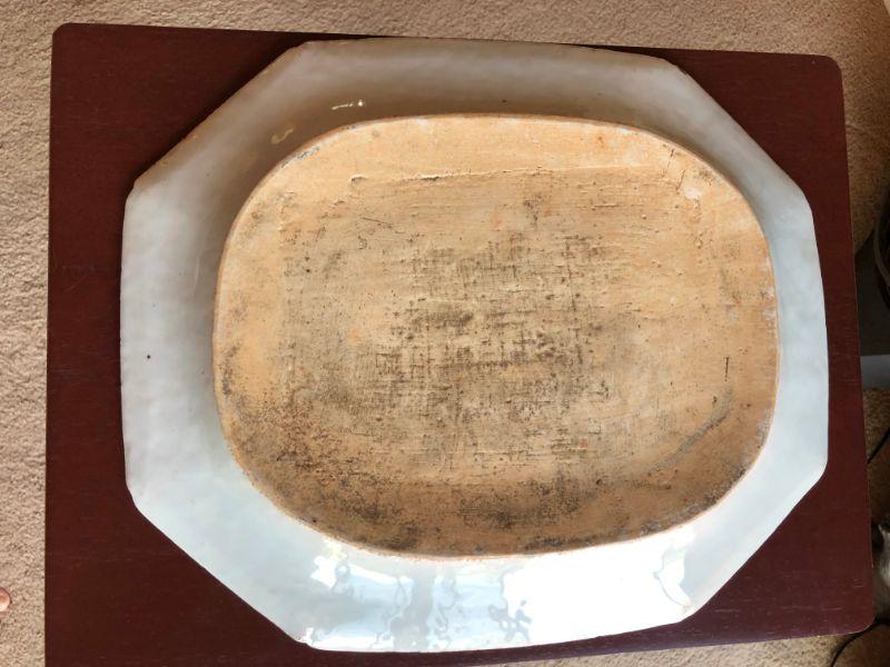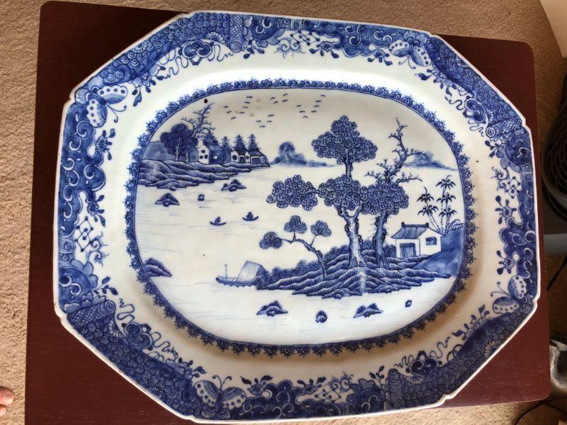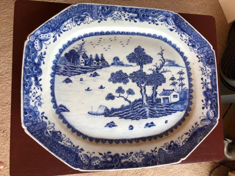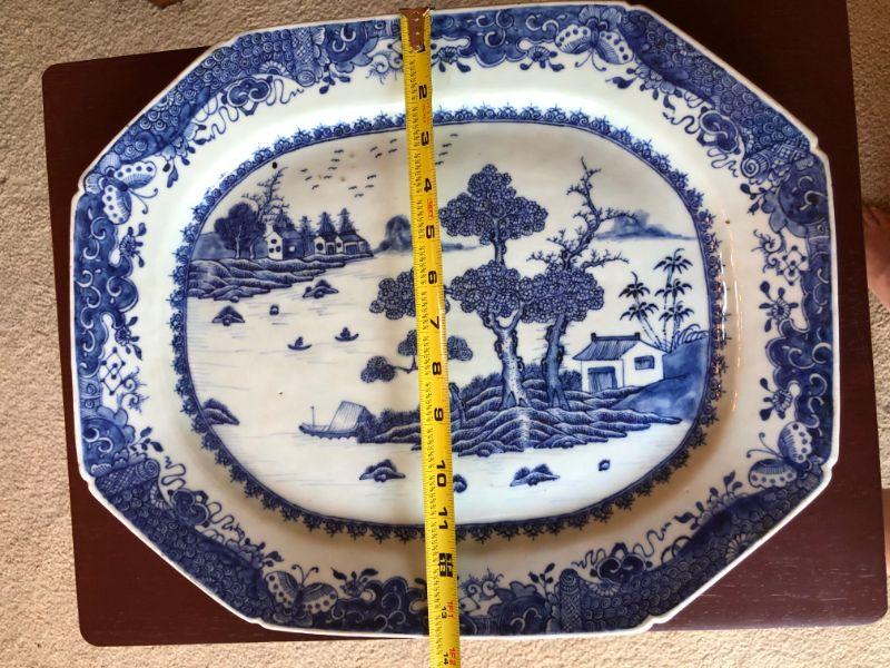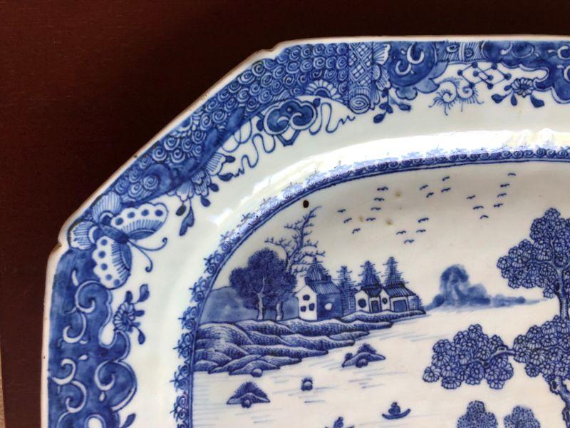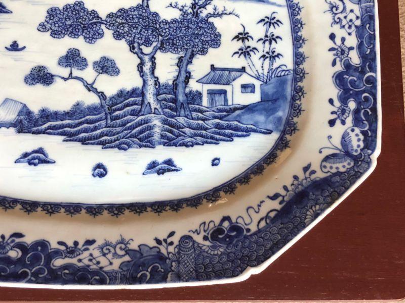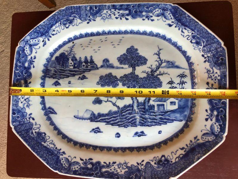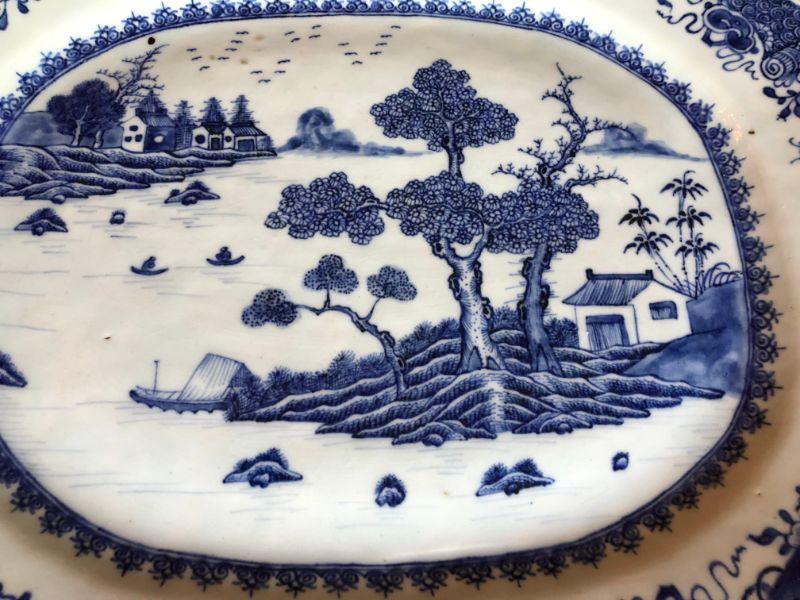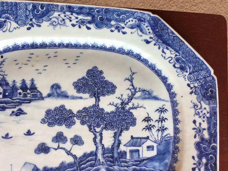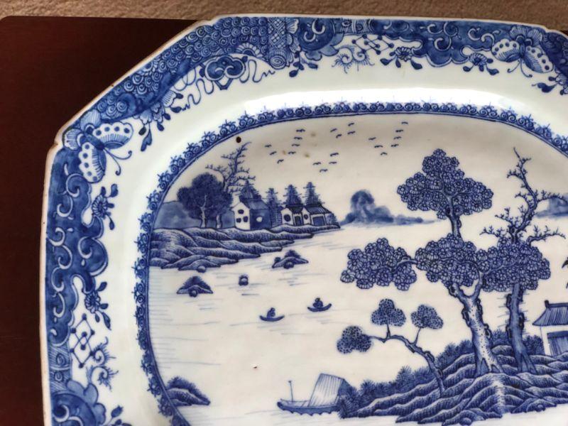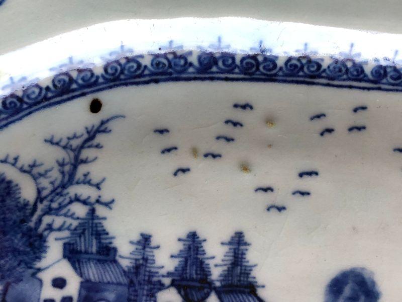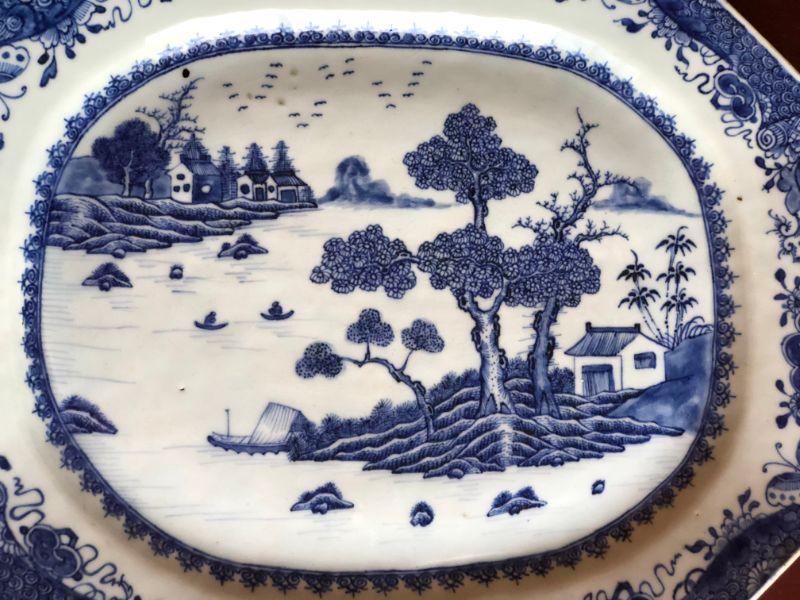 Beautiful and detailed Nanking blue and white porcelain platter. A family heirloom of an English family, likely dating from the 1800s. The river scene features boats, pagodas, and trees and nature. In very good condition, with some visible imperfections in the glaze in places (some pits and rough spots on the edges, likely from the time of glazing).