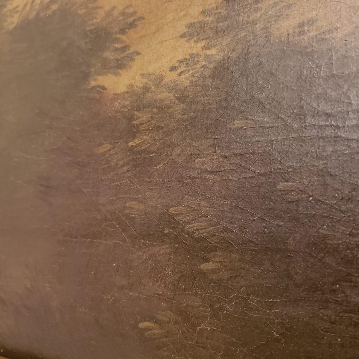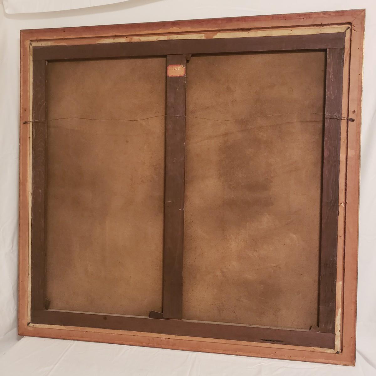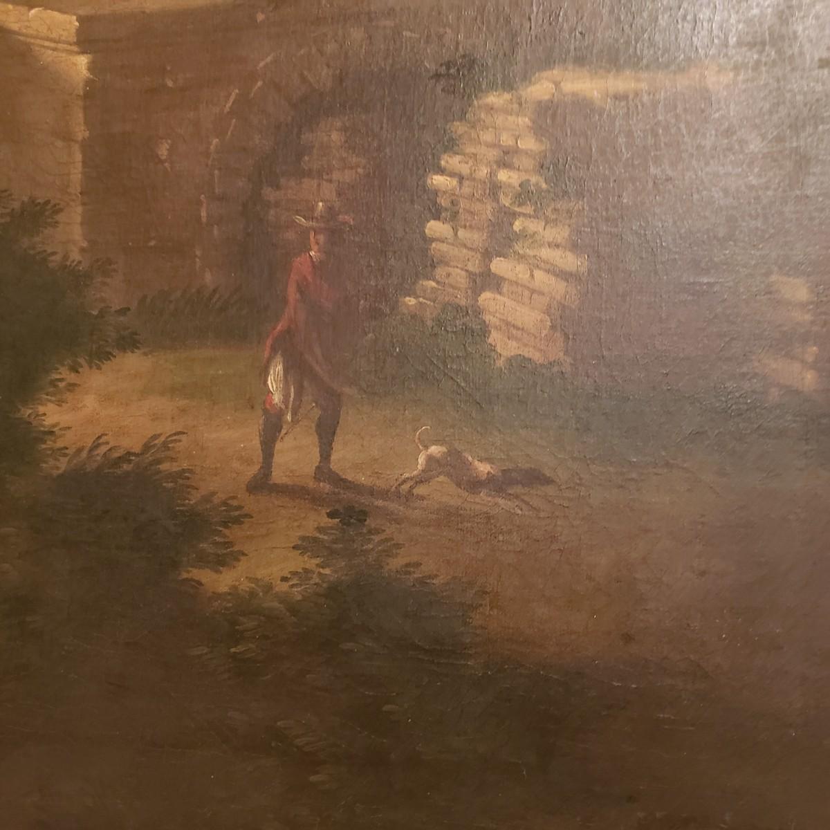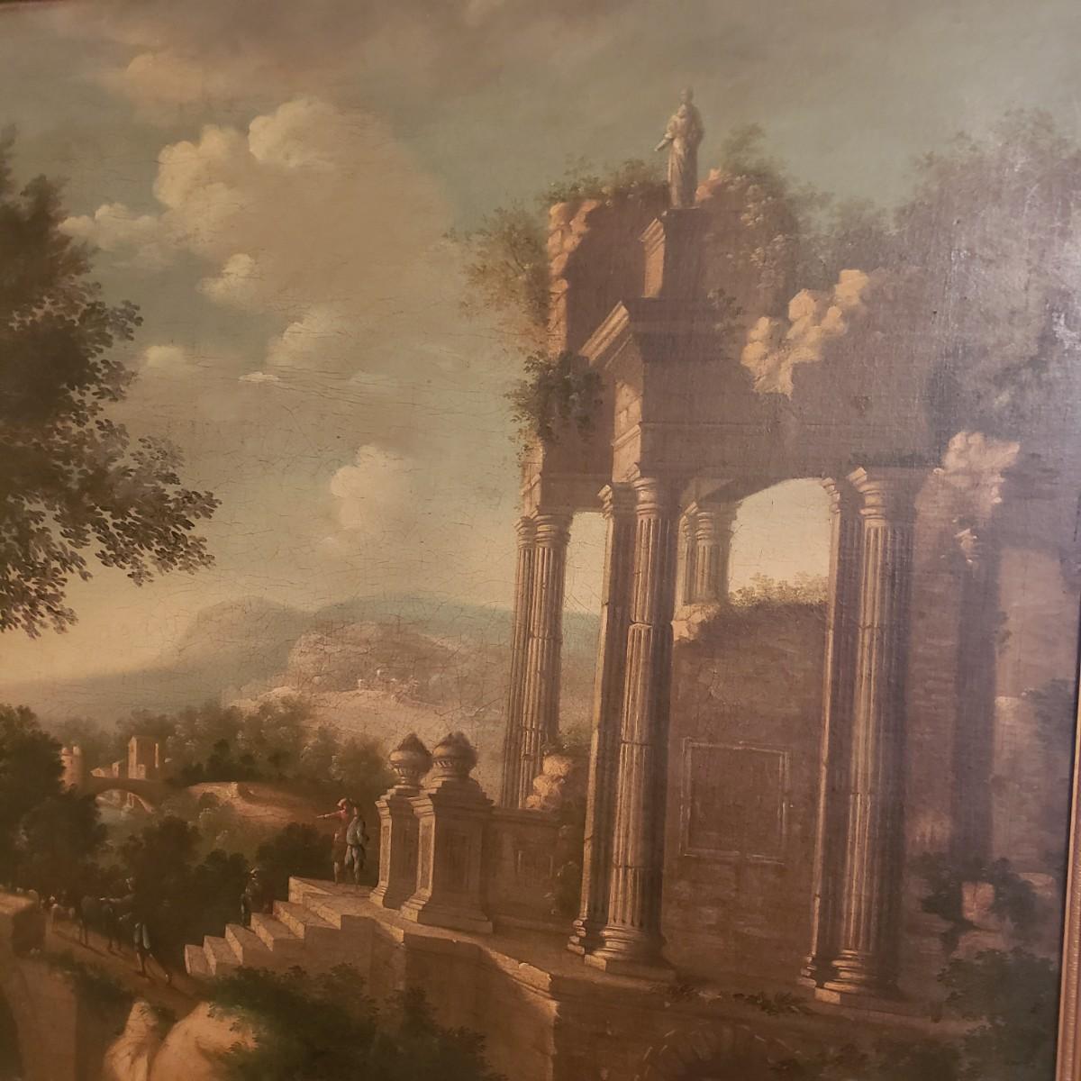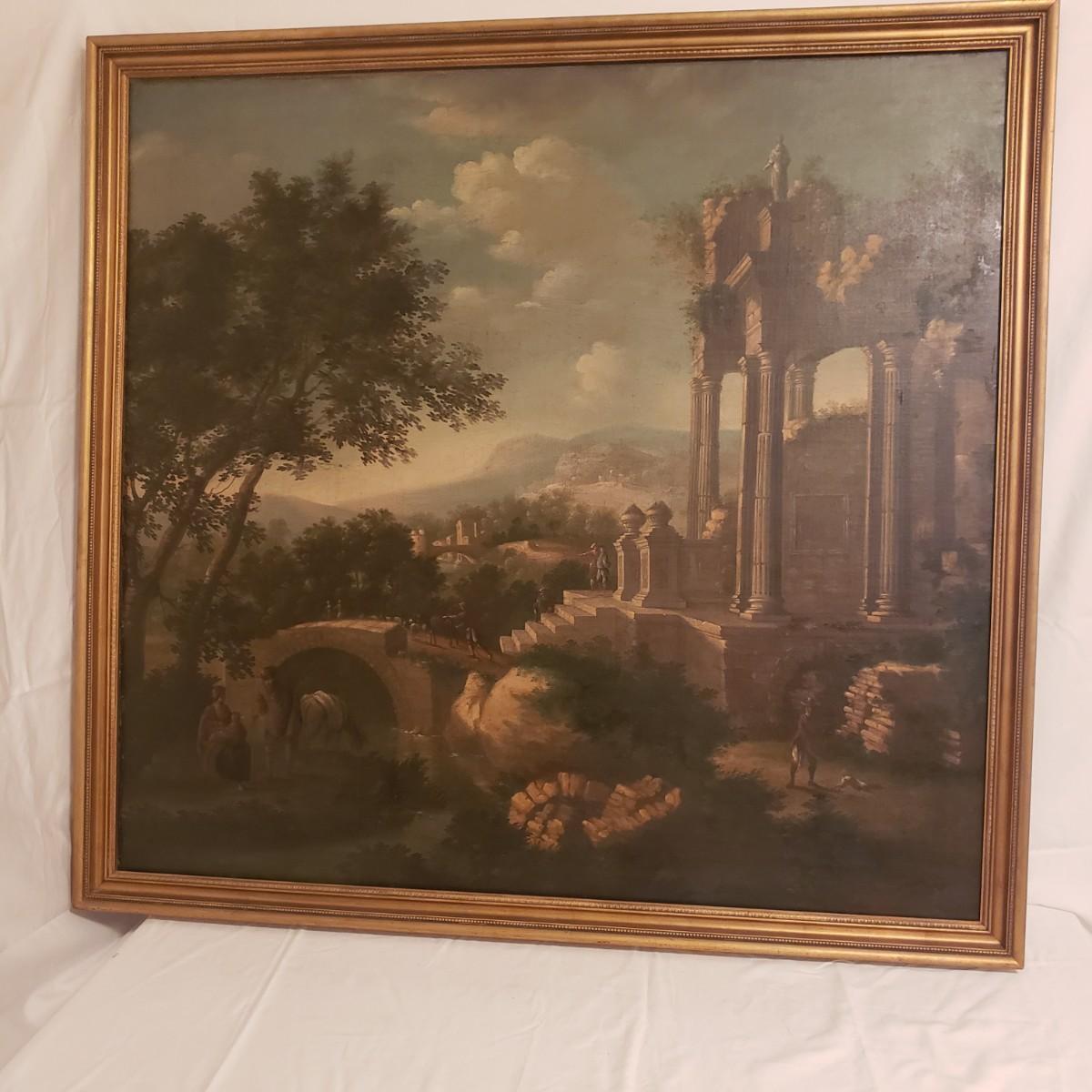 This large painting measures 47" x 45"H. The painting appears to be a landscape with Roman or European ruins. Due to it's age, the paint is crackly, see pictures. This piece is in a wooden frame without glass. The painting is held into the frame with bent nails. Please see photos for details.