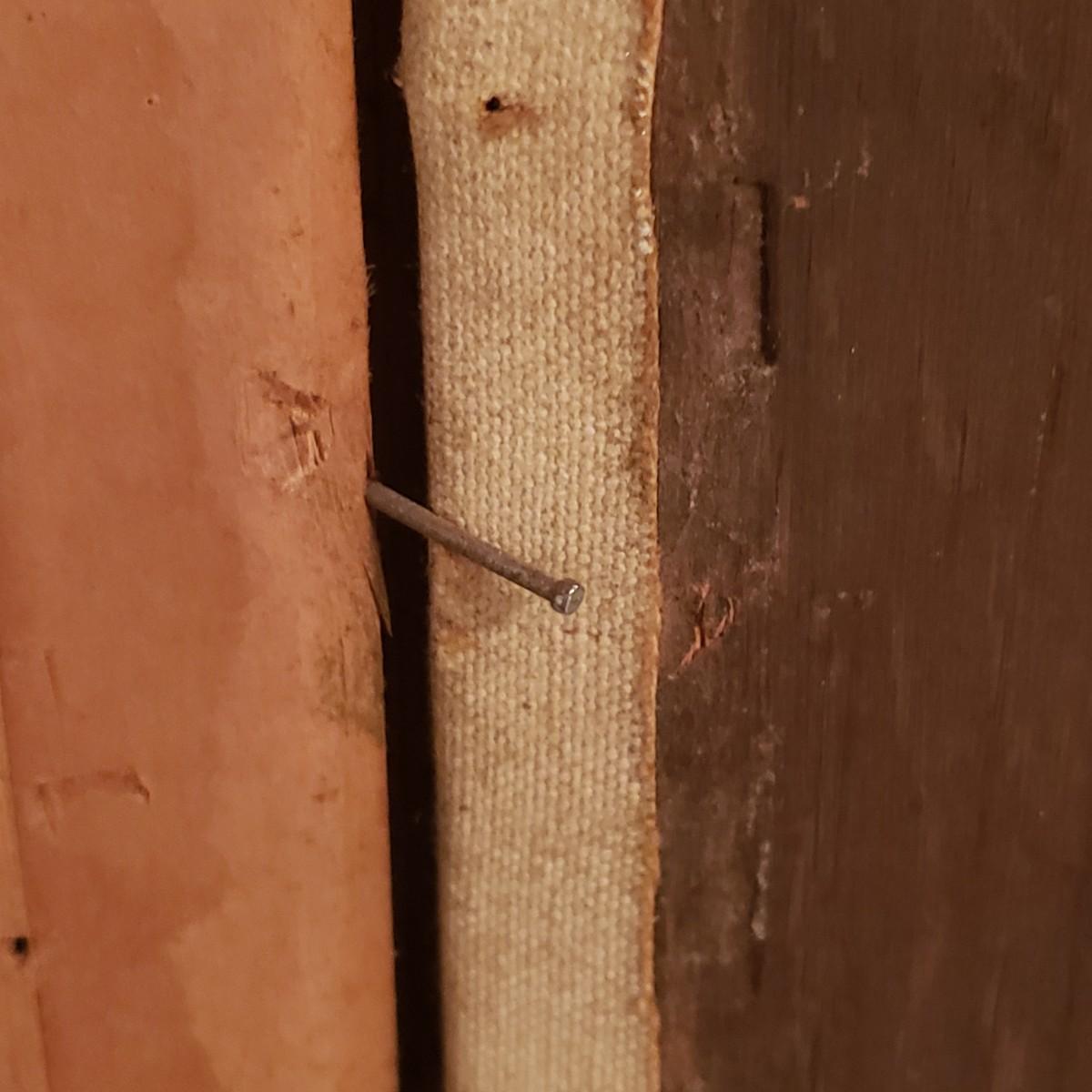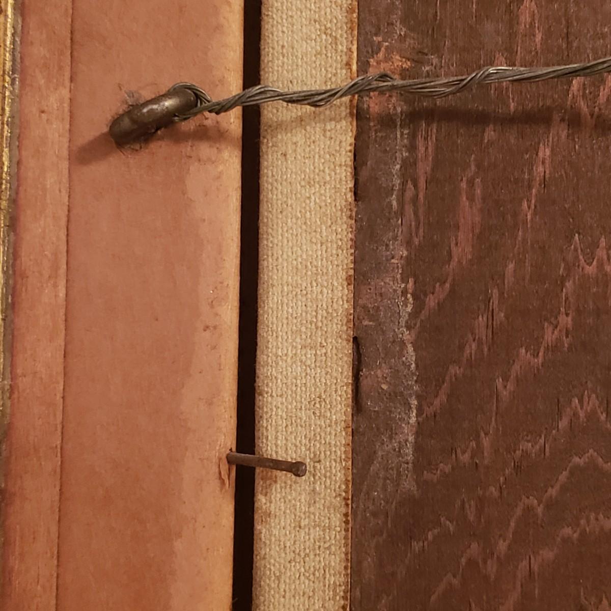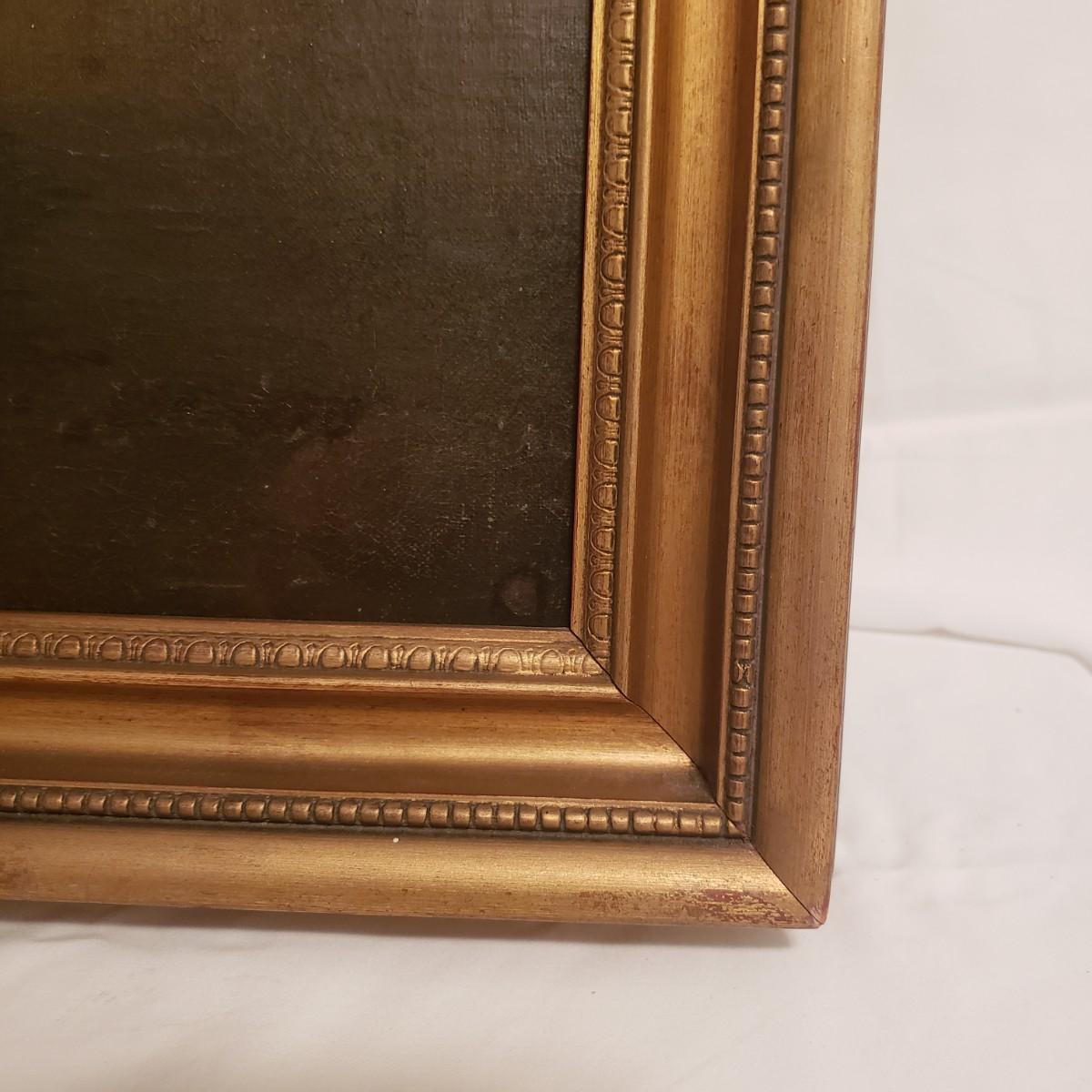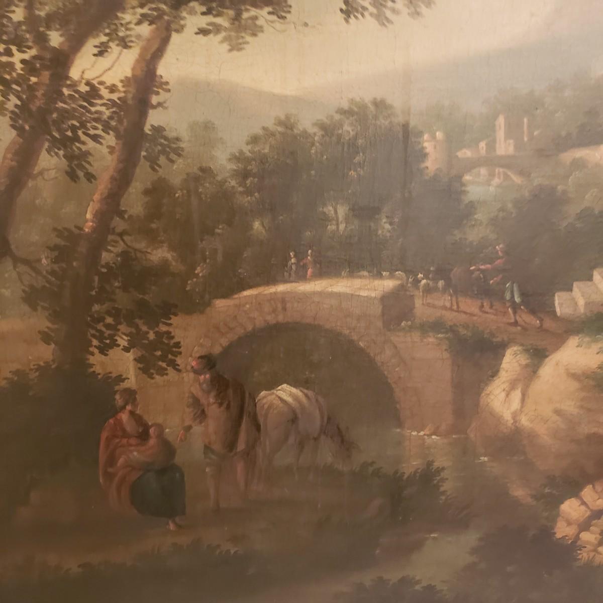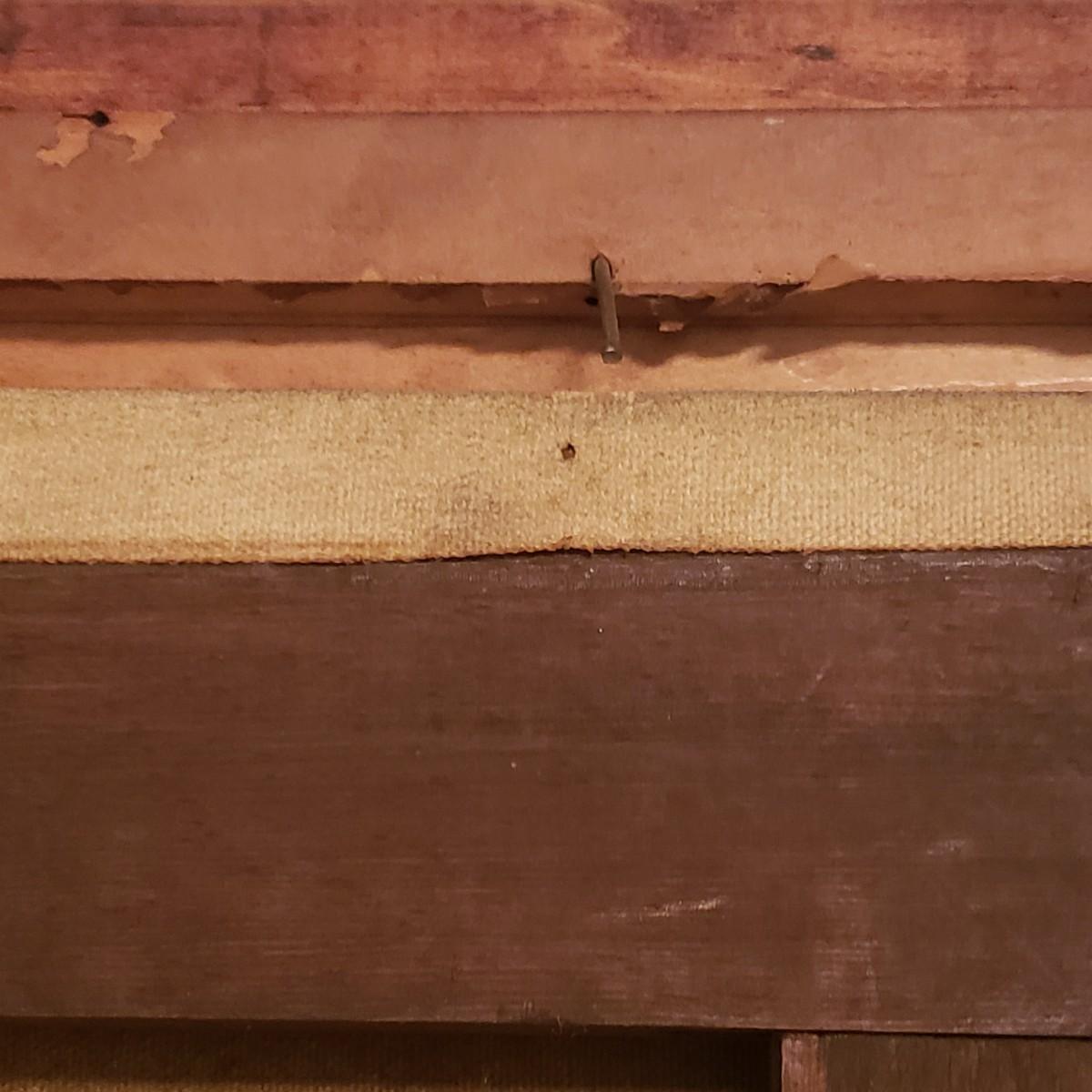 This large painting measures 47" x 45"H. The painting appears to be a landscape with Roman or European ruins. Due to it's age, the paint is crackly, see pictures. This piece is in a wooden frame without glass. The painting is held into the frame with bent nails. Please see photos for details.