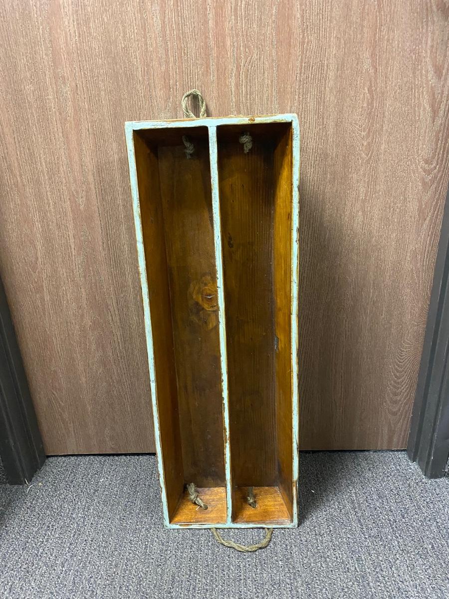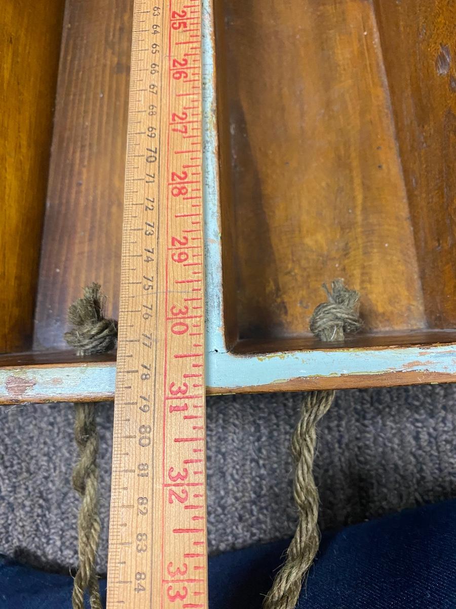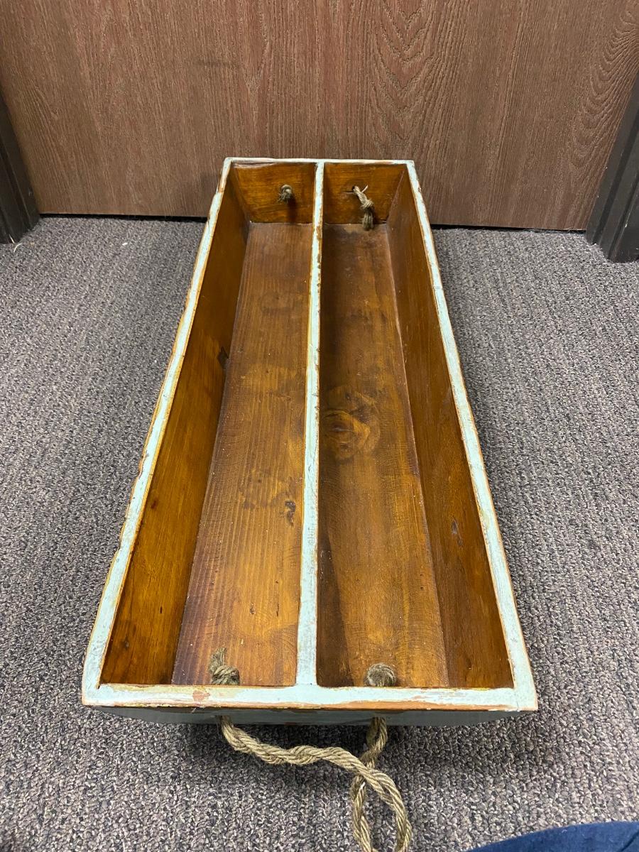 Large Antique Patina Worn Paint Shabby Chic Wood Tray with Rope Handles. Good condition. About 31" length.