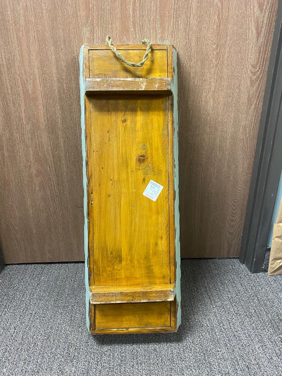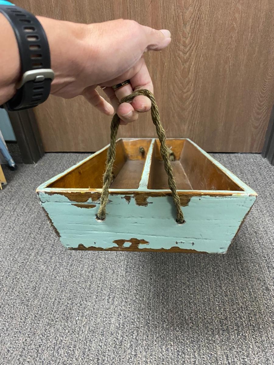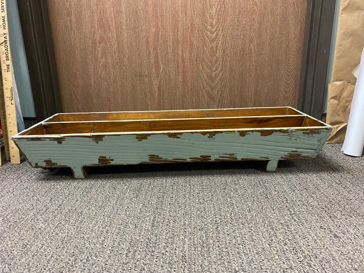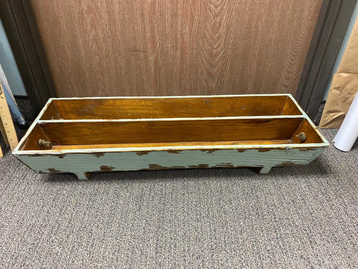Large Antique Patina Worn Paint Shabby Chic Wood Tray with Rope Handles. Good condition. About 31" length.