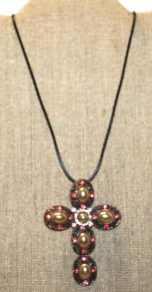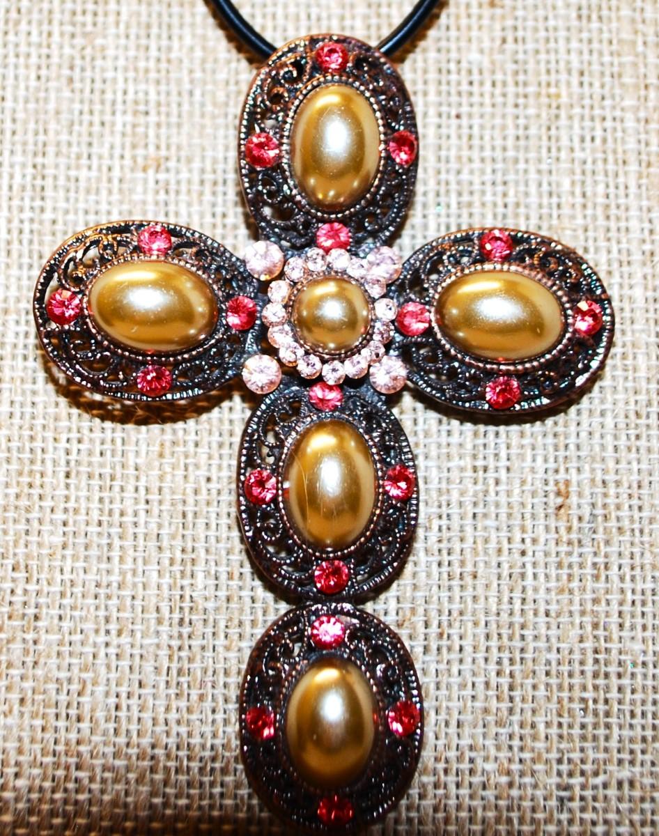 Large Antique Style Cross PENDANT (3" x 2¼" ) with Half Pearls & Orange and Clear Accents Stone on a Black Rope Necklace 20" L