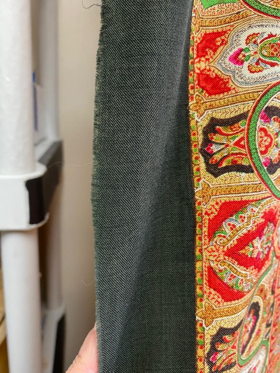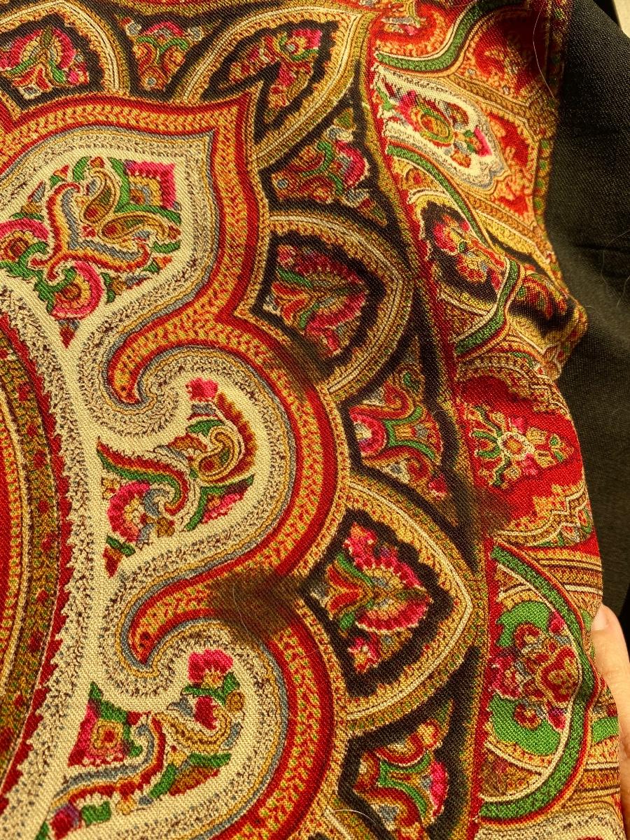 Beautiful large paisley piece of material. Super soft fine material, believe it is actually an antique Kashmir shawl or wrap. Great for a vintage boho wall hanging. One small hole near the center. About 5' size. Ornate design.