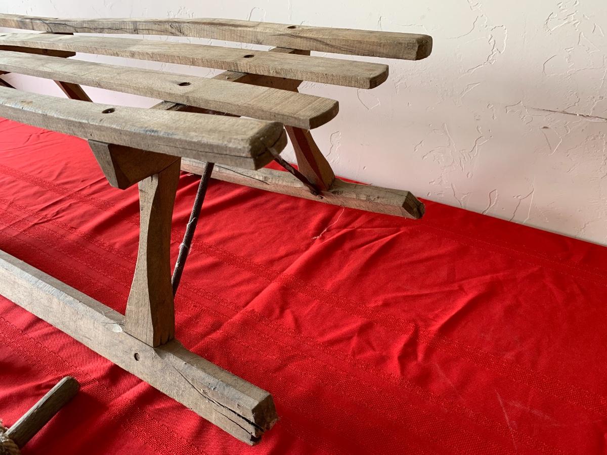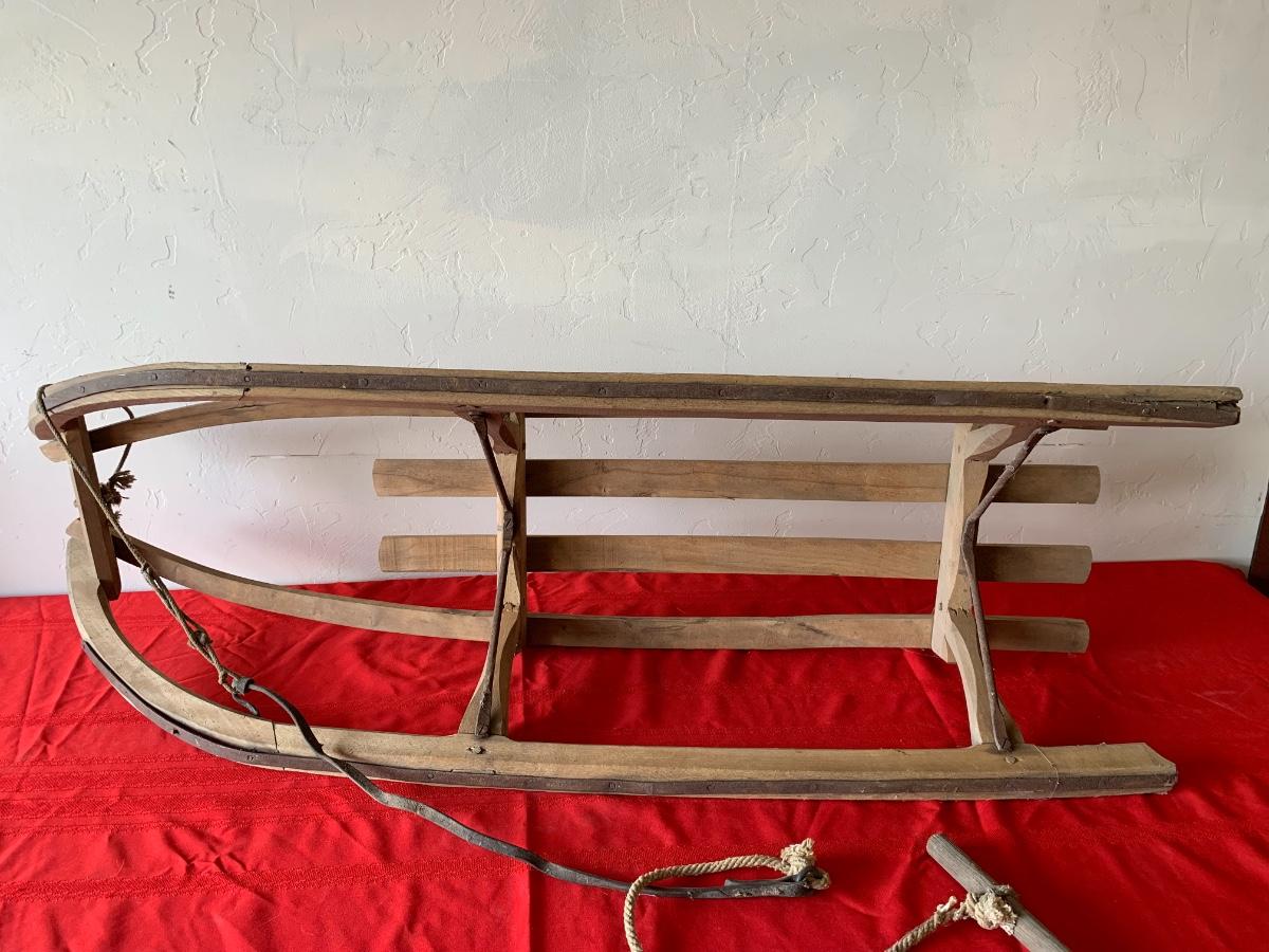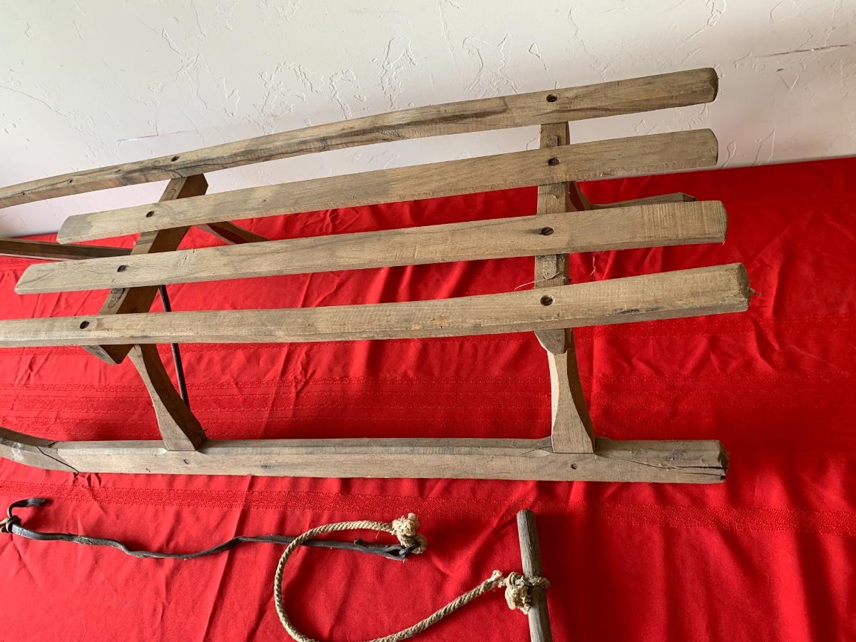 Larger size slatted wood sled with iron under runners and braces. Includes a rope and leather pull - 48” L x 12” W