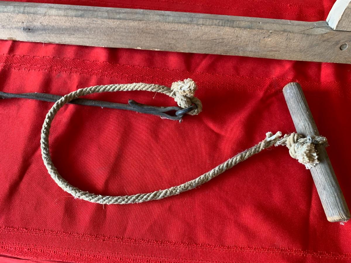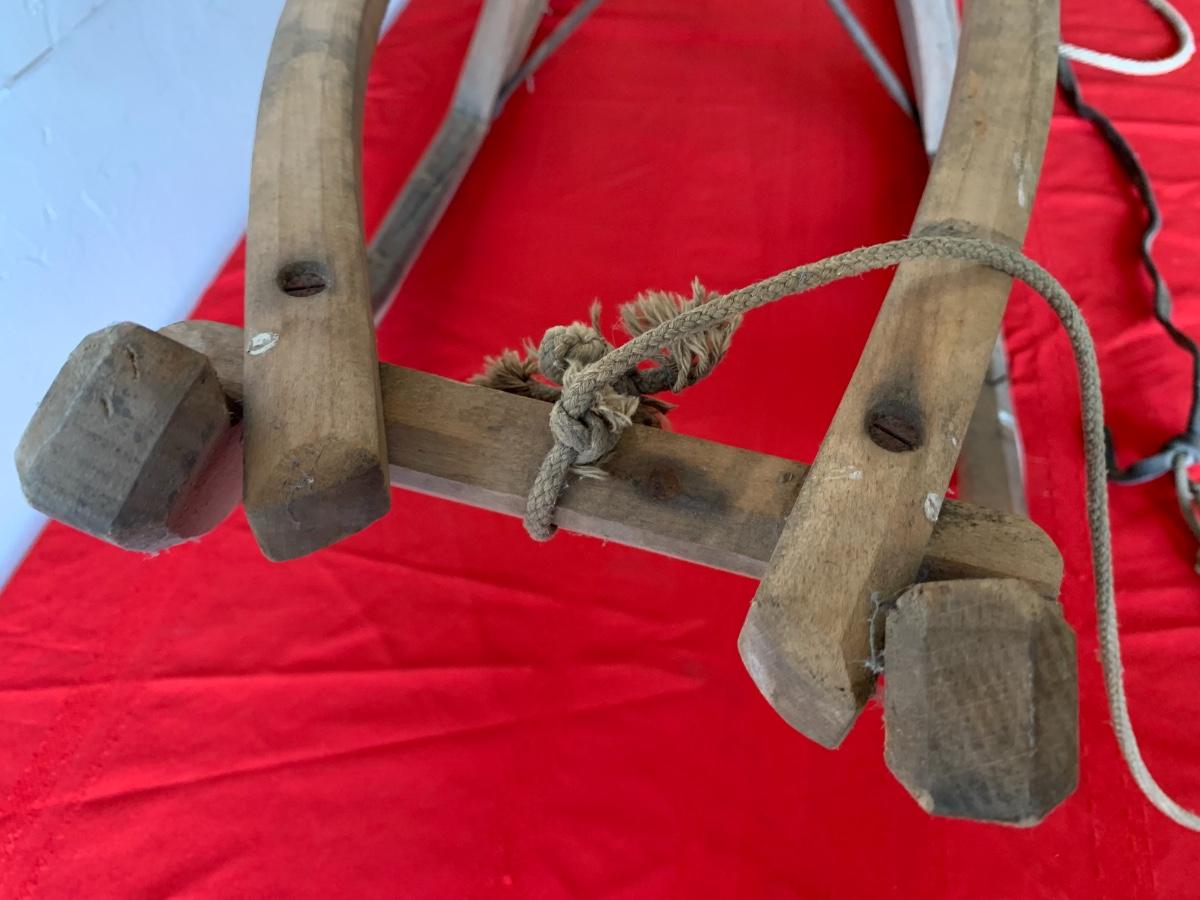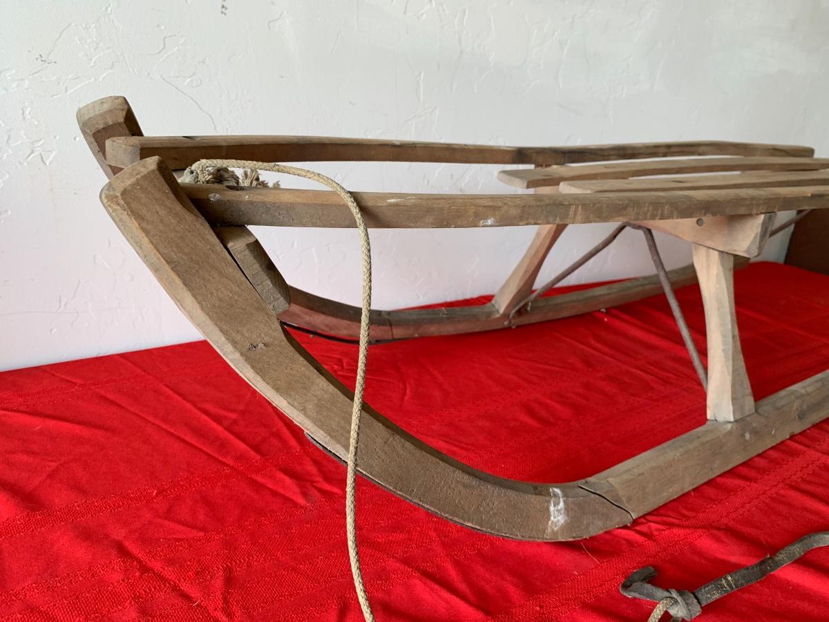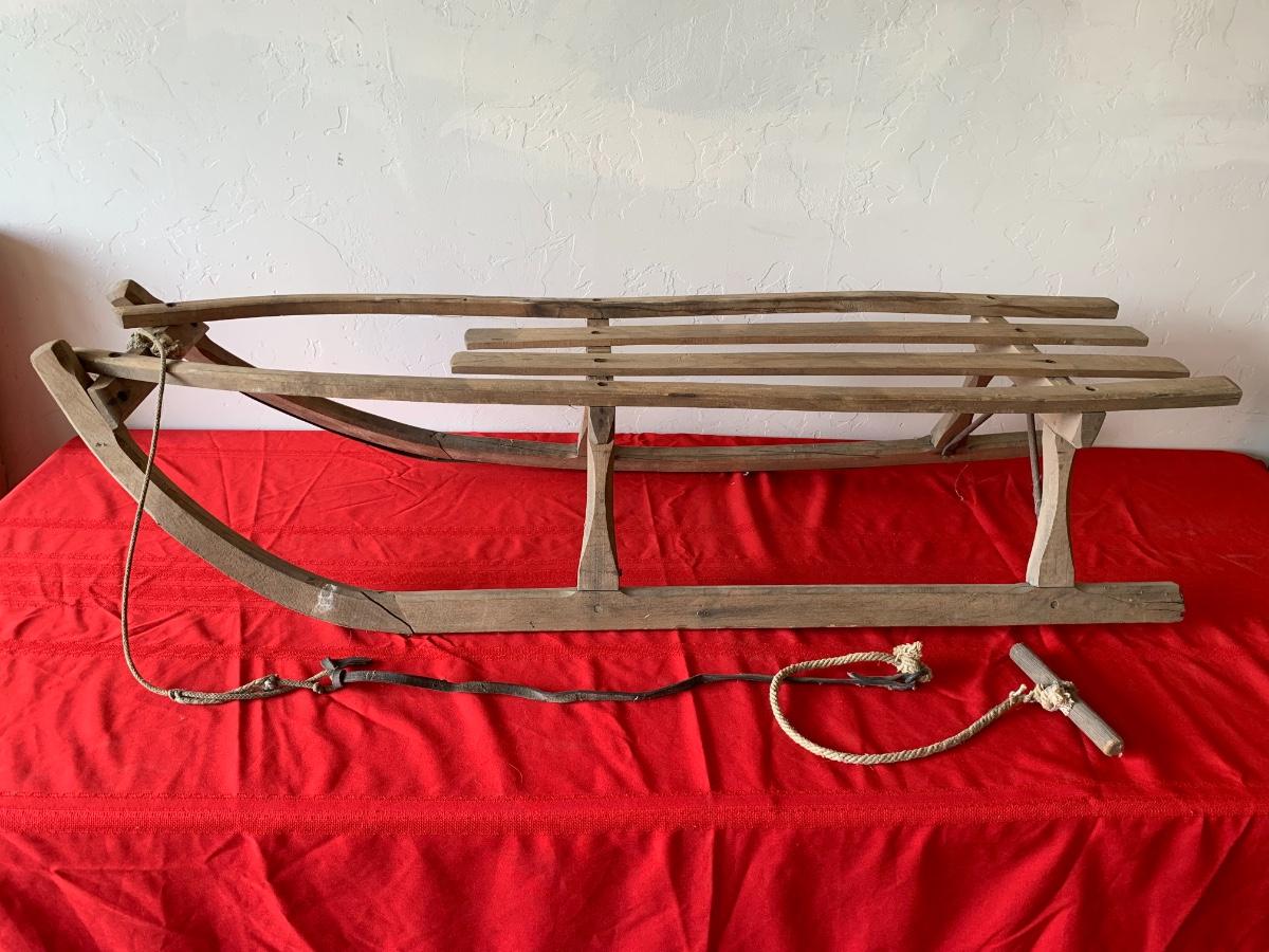 Larger size slatted wood sled with iron under runners and braces. Includes a rope and leather pull - 48” L x 12” W