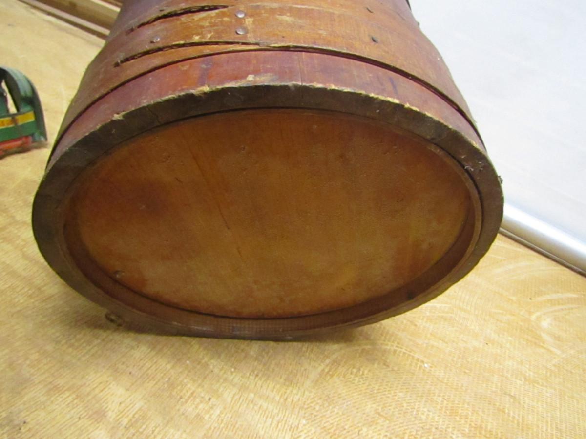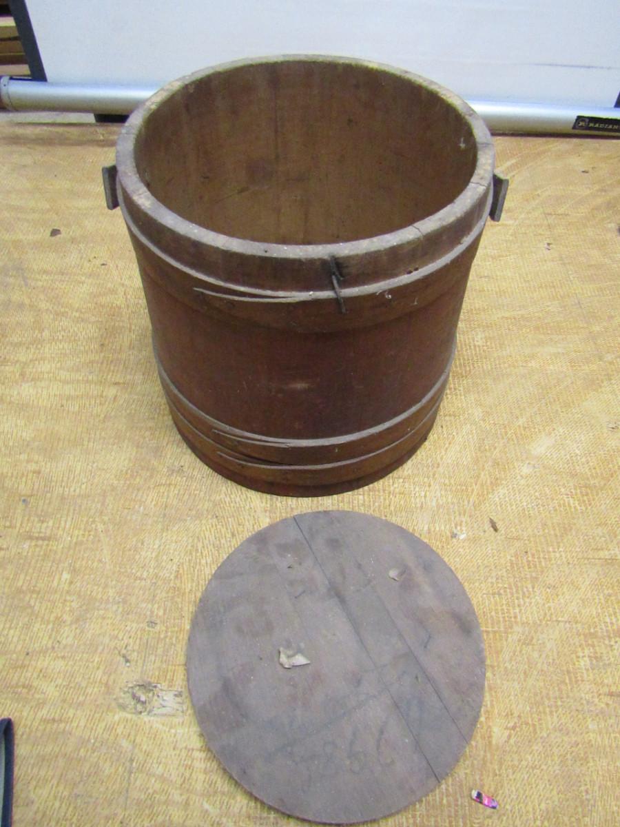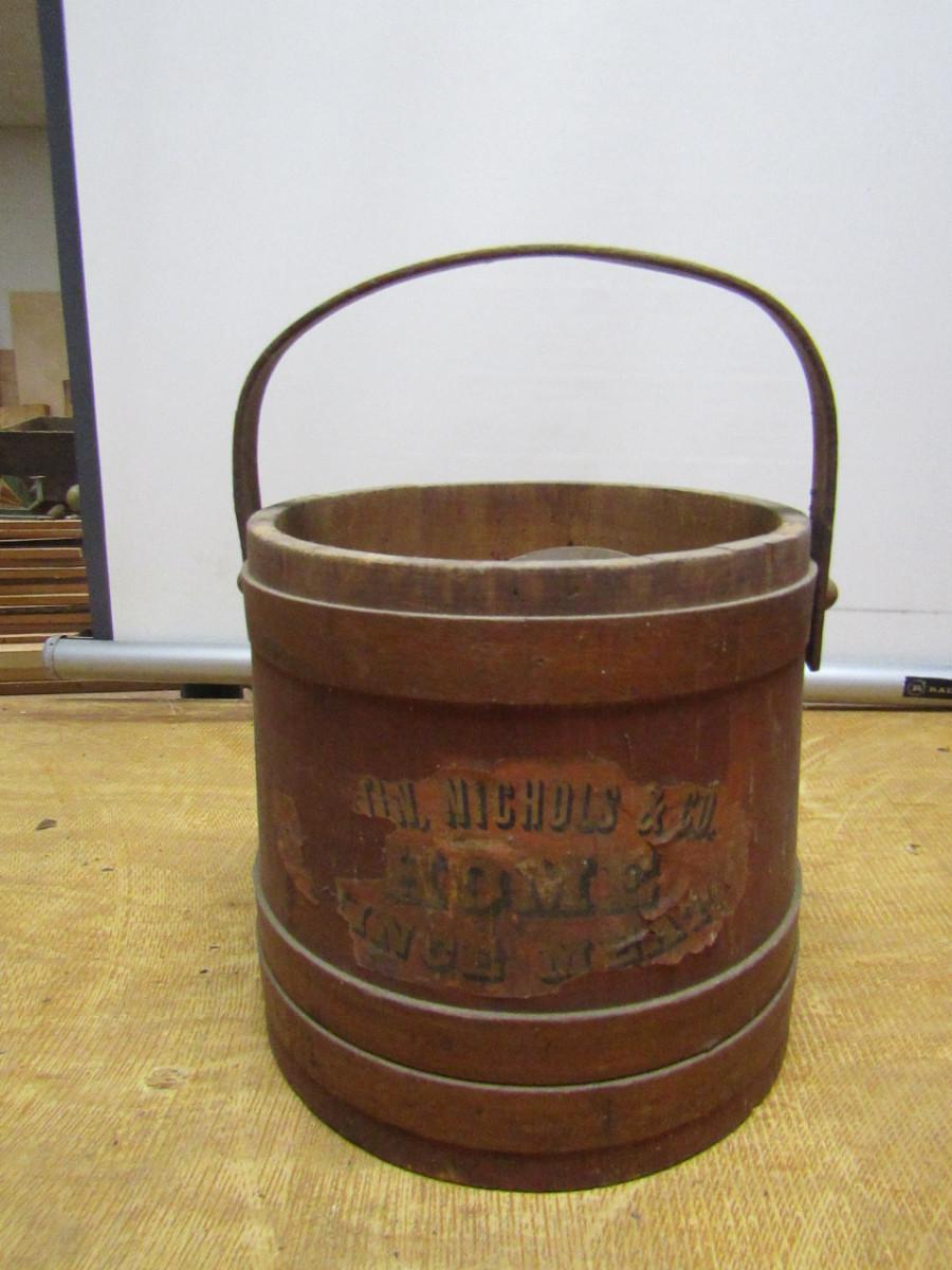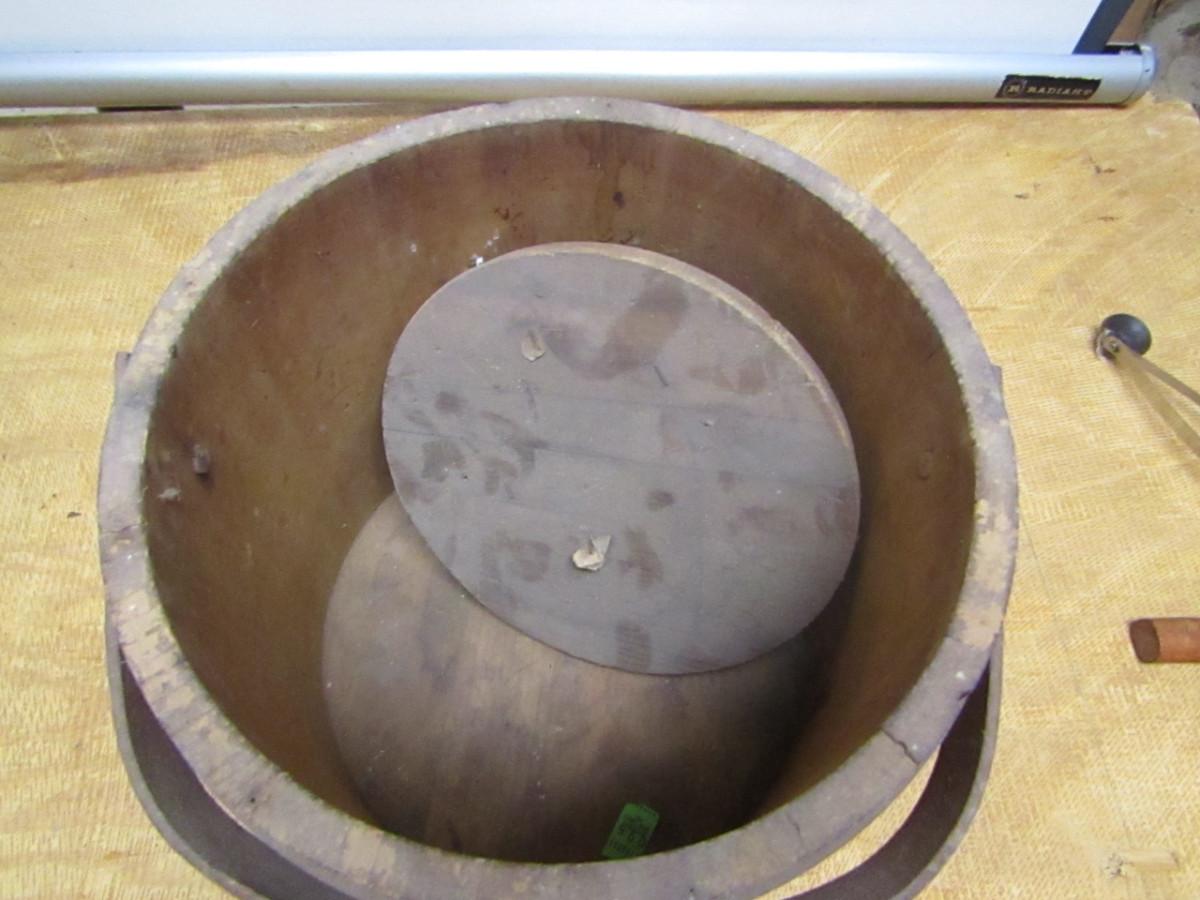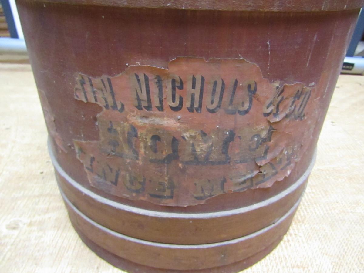 Large, Antique Wooden Mince Meat Pail- Approx 9 3/4" in Diameter, 12" Tall. Stored in non-climatized basement so expect item may need to be cleaned from dust, insects, etc.
