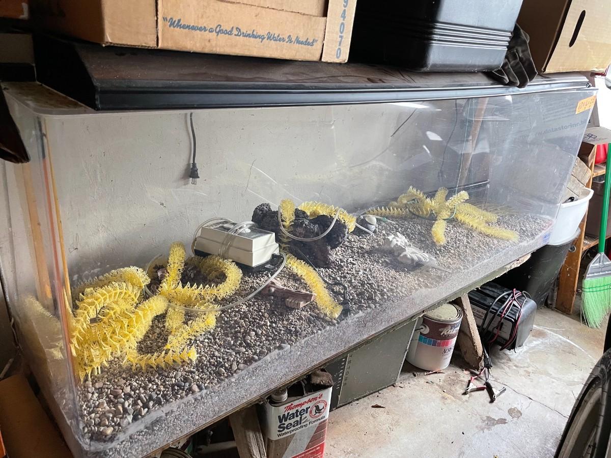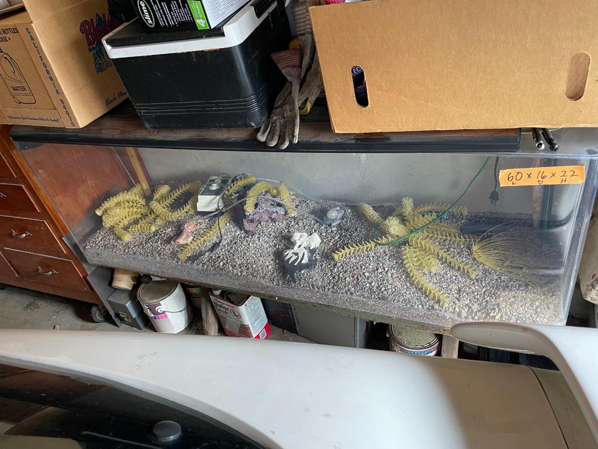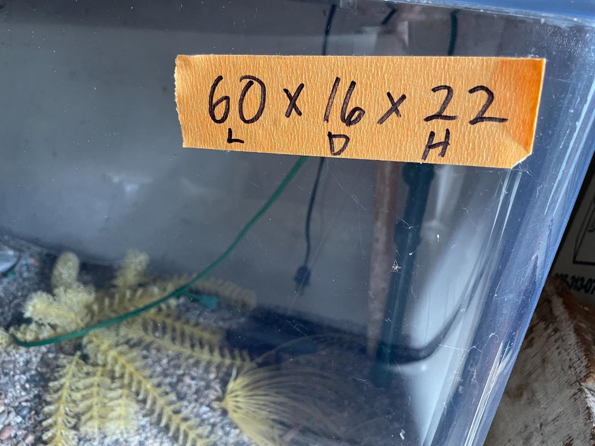 Large Acrylic Aquarium - 100 Gallon? Includes: Hood Light, air pump, artificial plants, gravel, heater, Bubble submarine, and lava rock. Heater, Light and Pumps not tested.