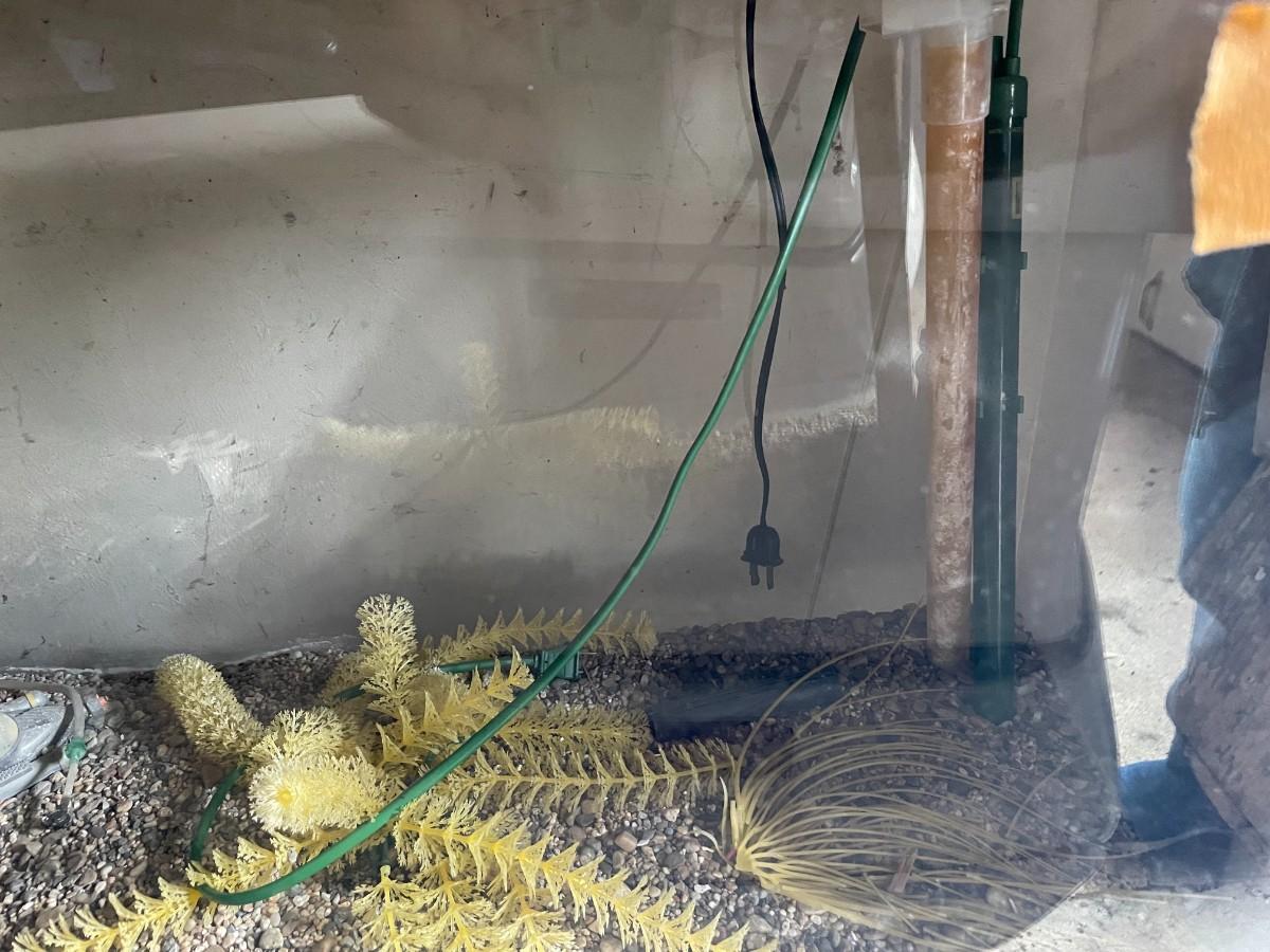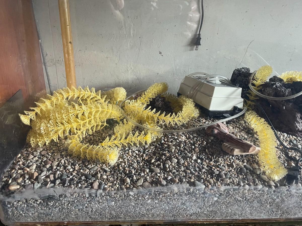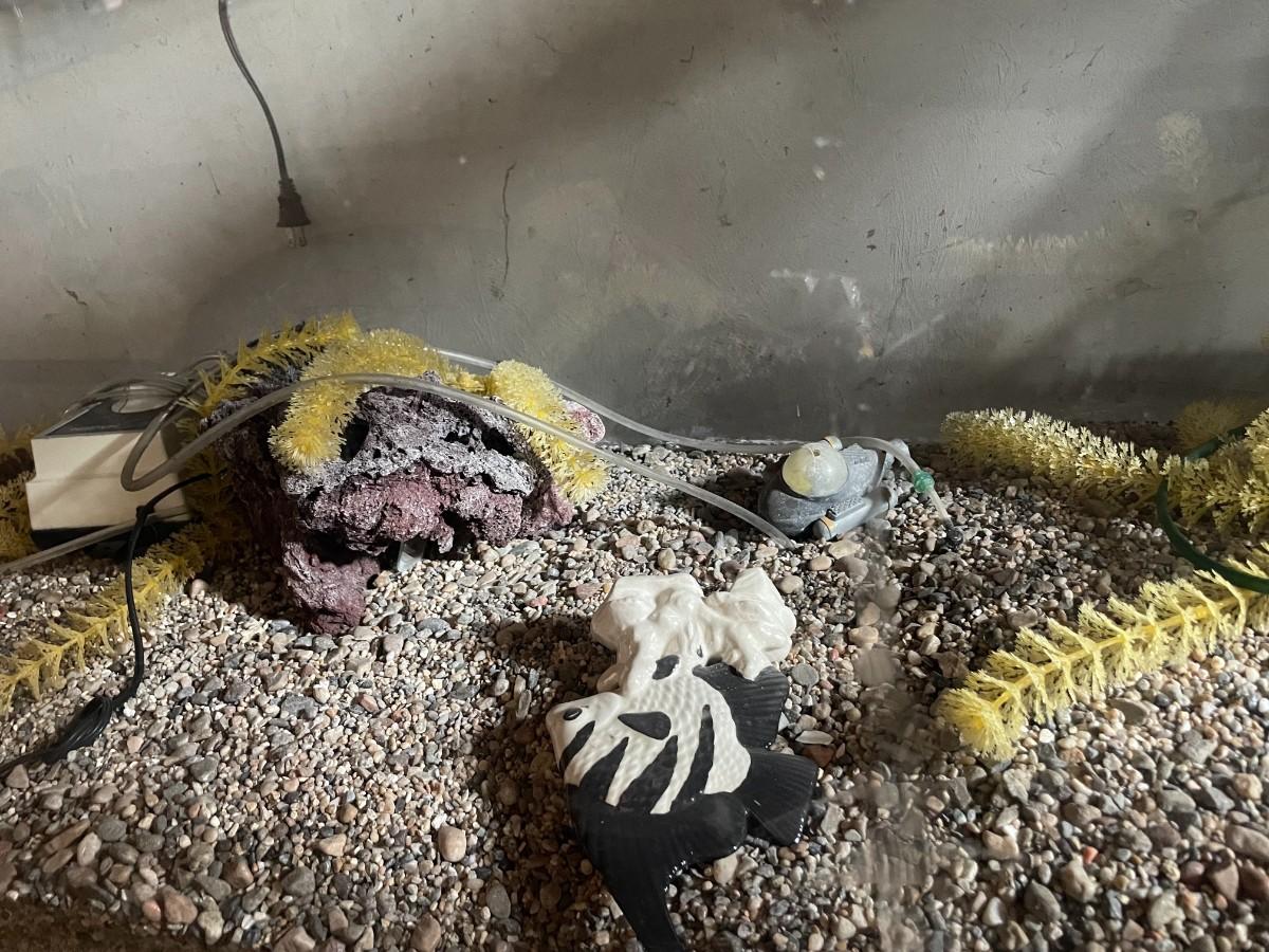 Large Acrylic Aquarium - 100 Gallon? Includes: Hood Light, air pump, artificial plants, gravel, heater, Bubble submarine, and lava rock. Heater, Light and Pumps not tested.