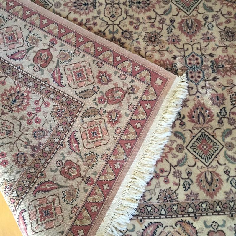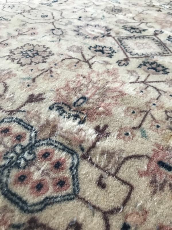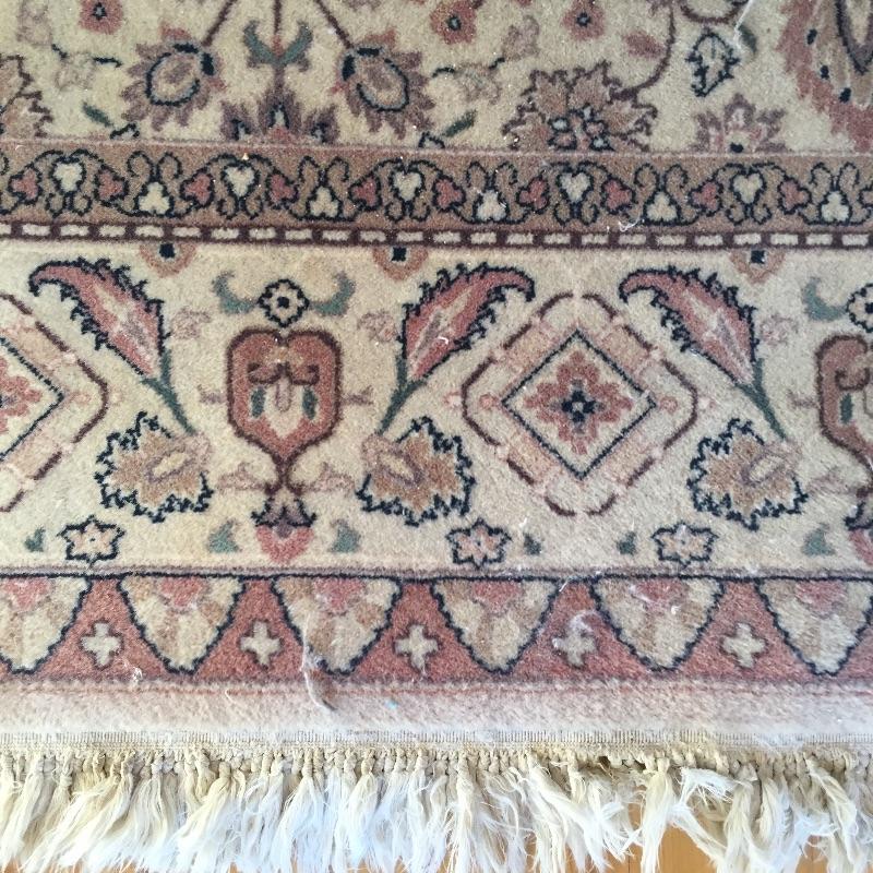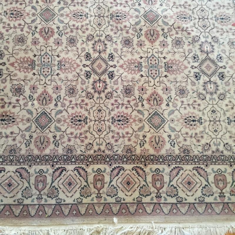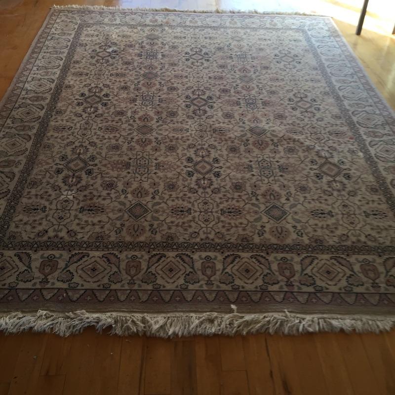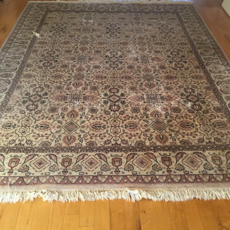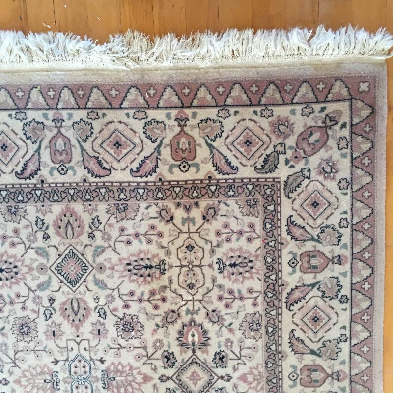 Large area rug in light pinks, blues and beige. Keep your feet warm this winter with this lovely large area rug. Rug measures 92” x 124”. Has a few places where it is piling in middle. See pix. Not too noticble. Comes from a home with cats.