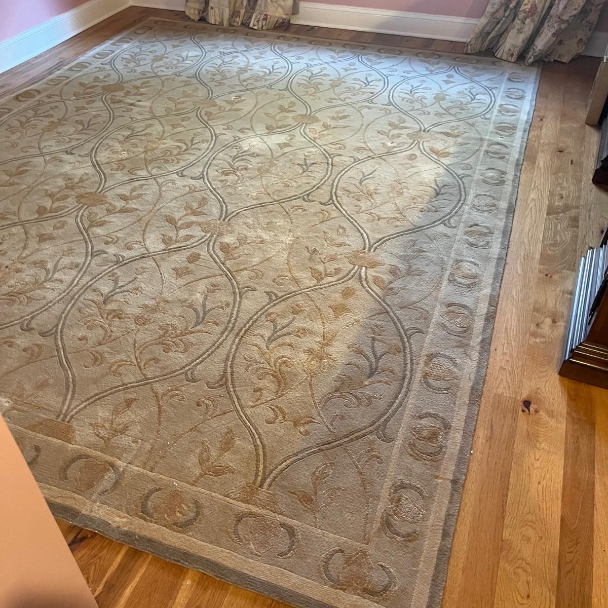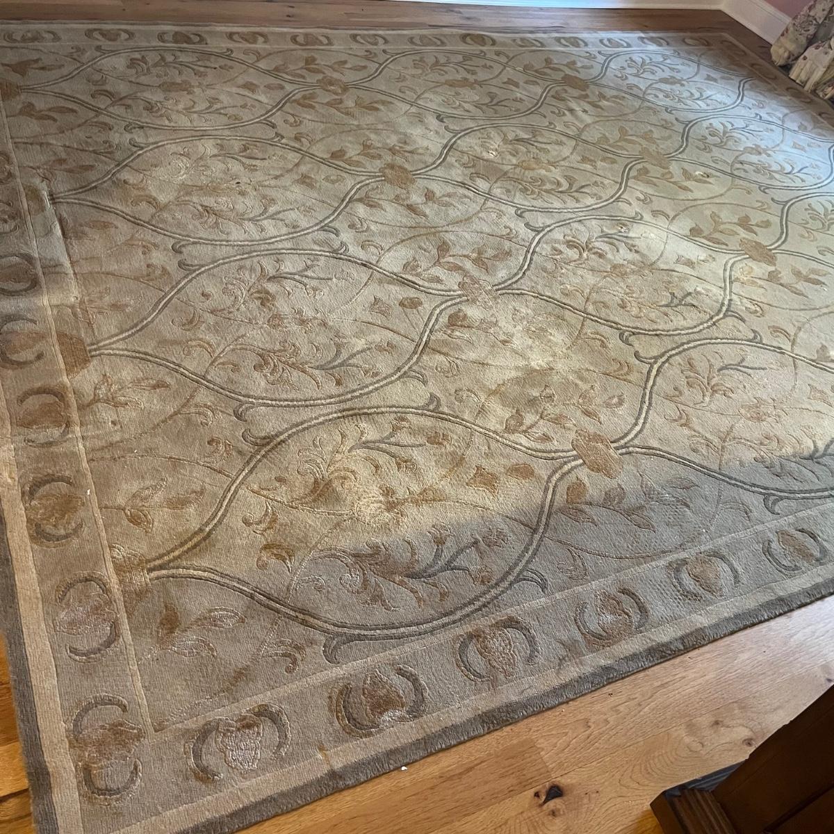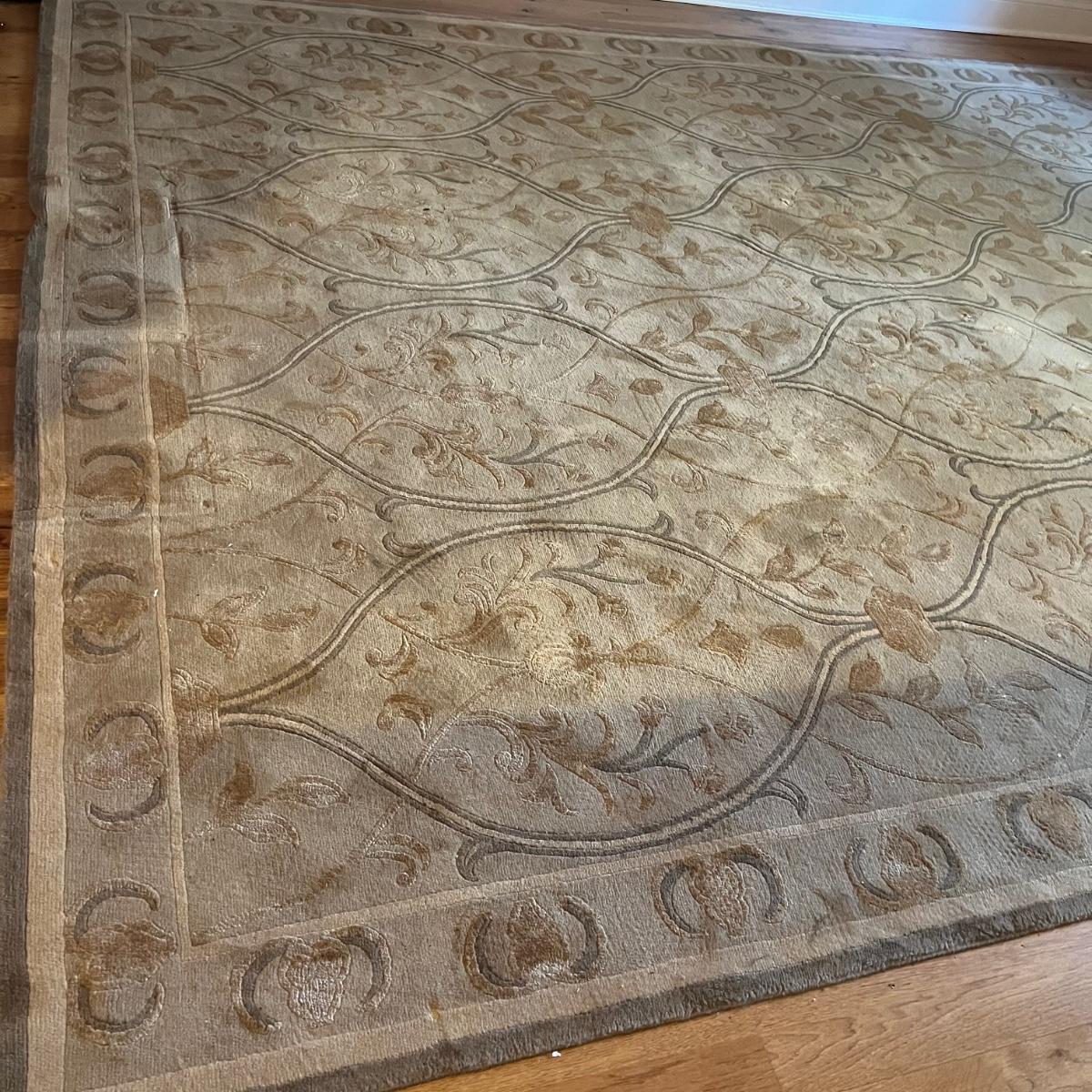 Lot includes a large neutral colored area rug. Rug measures 9’ 2” x 11’ 10”. Rug has some marks on it, see pictures. Rug is up one flight of stairs. The light area is the sun hitting the rug.