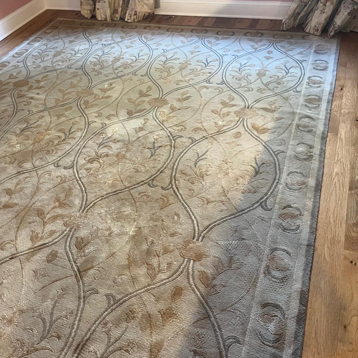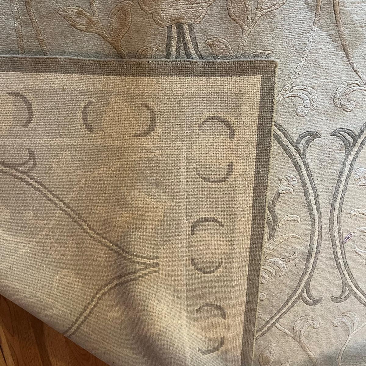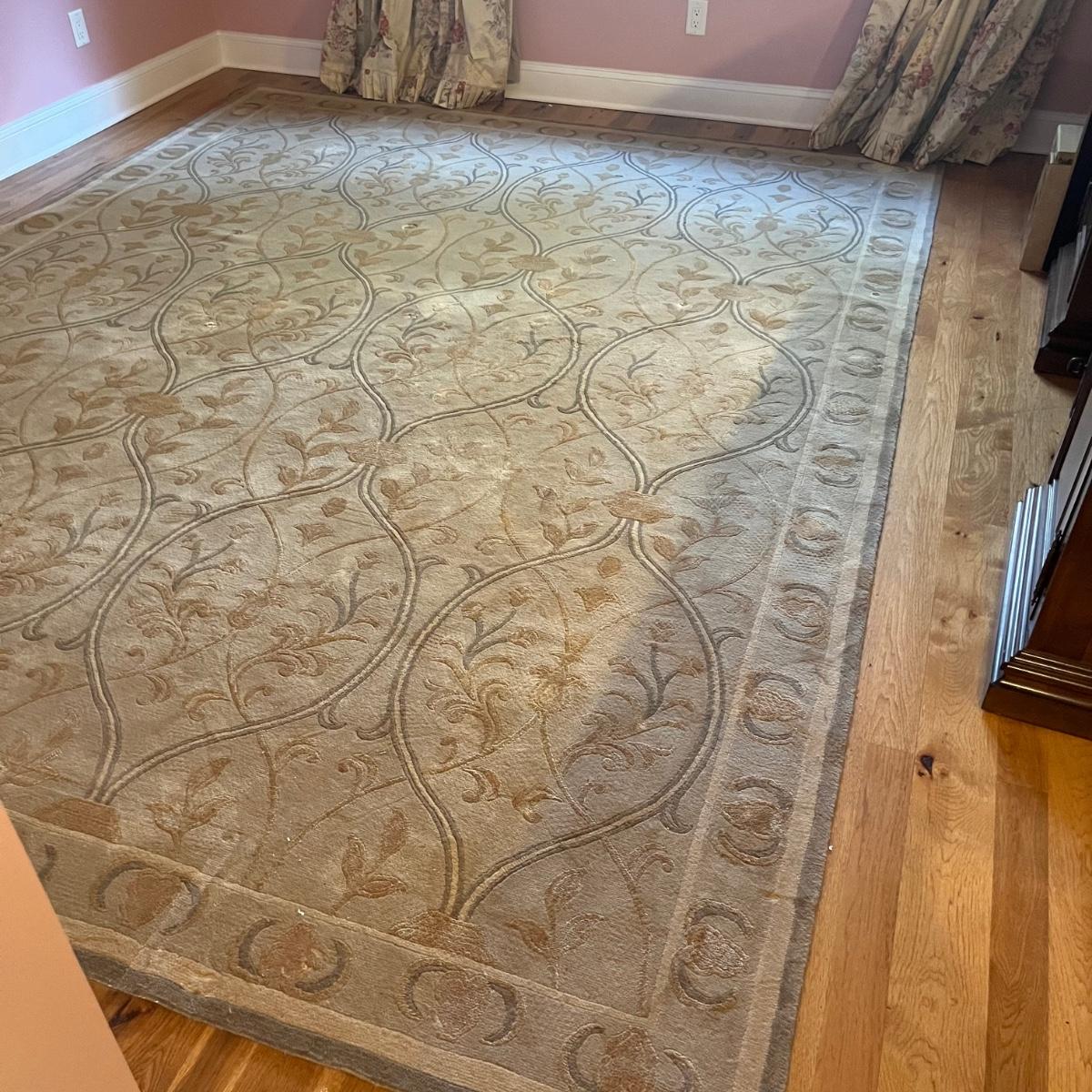 Lot includes a large neutral colored area rug. Rug measures 9’ 2” x 11’ 10”. Rug has some marks on it, see pictures. Rug is up one flight of stairs. The light area is the sun hitting the rug.