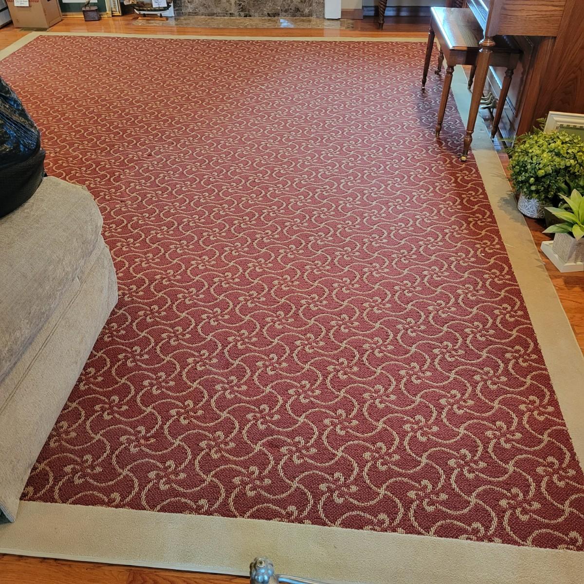 A large area rug that measures approximately 14'11" x 11'9". It has a beige border with a brick red main body with beige accents. The rug pad is included. Local pickup only. Winning bidder will need to pick a later pickup time as there are multiple heavy pieces of furniture on it.