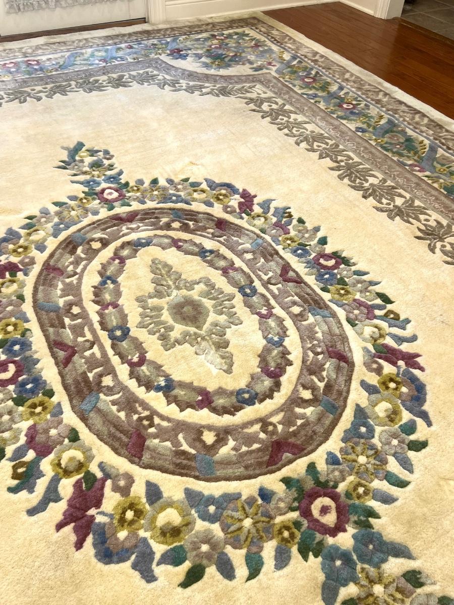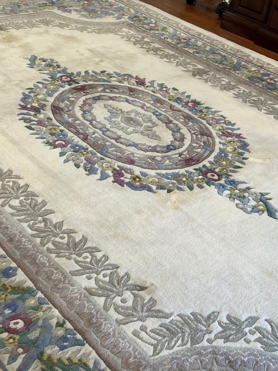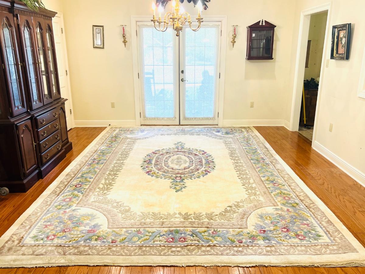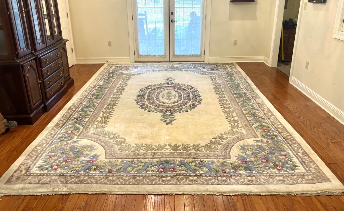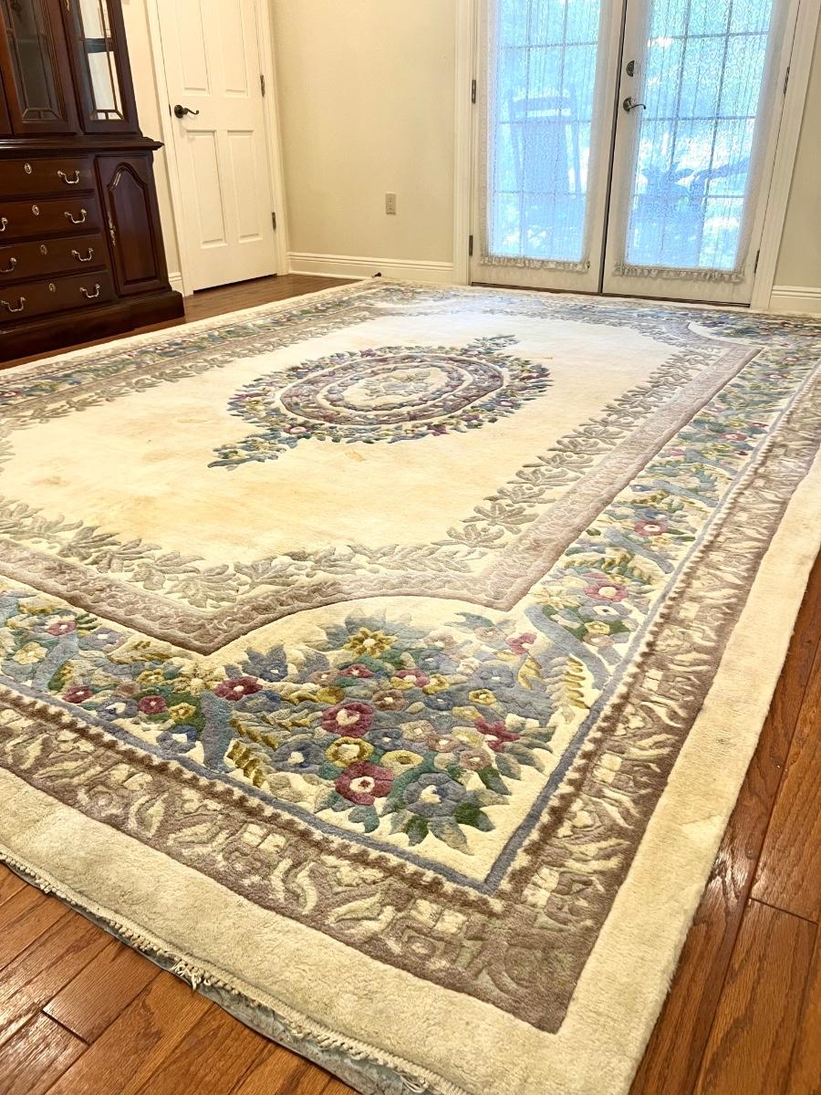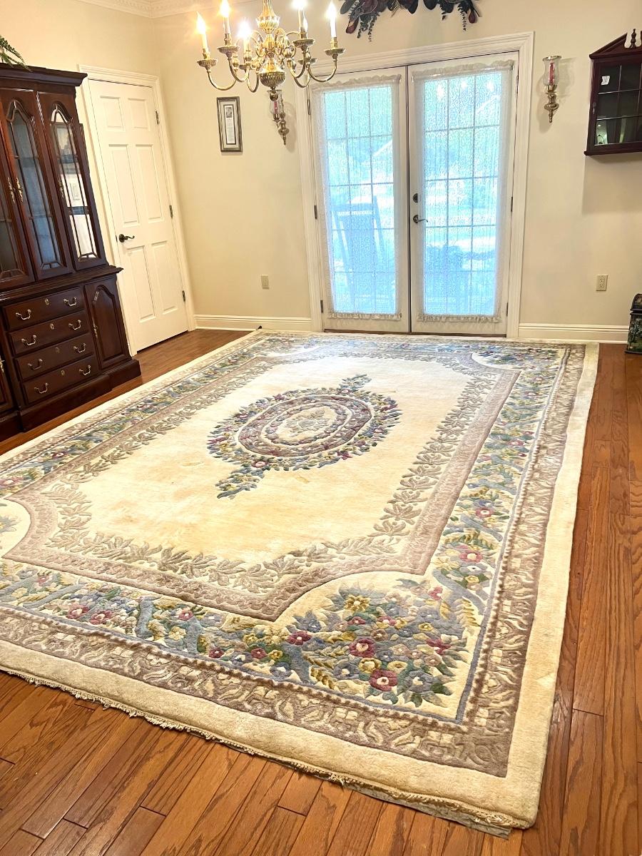 This rug is huge! With a good shampooing this could be like new again. It has some discoloration spots from being spot cleaned. It was used under a formal dining table. Also the end fringes have been taped under the rug. Please see pictures for the condition. You are bidding on this rug knowing it will need to be cleaned. Measures 9’ 7” X 13’ 7”