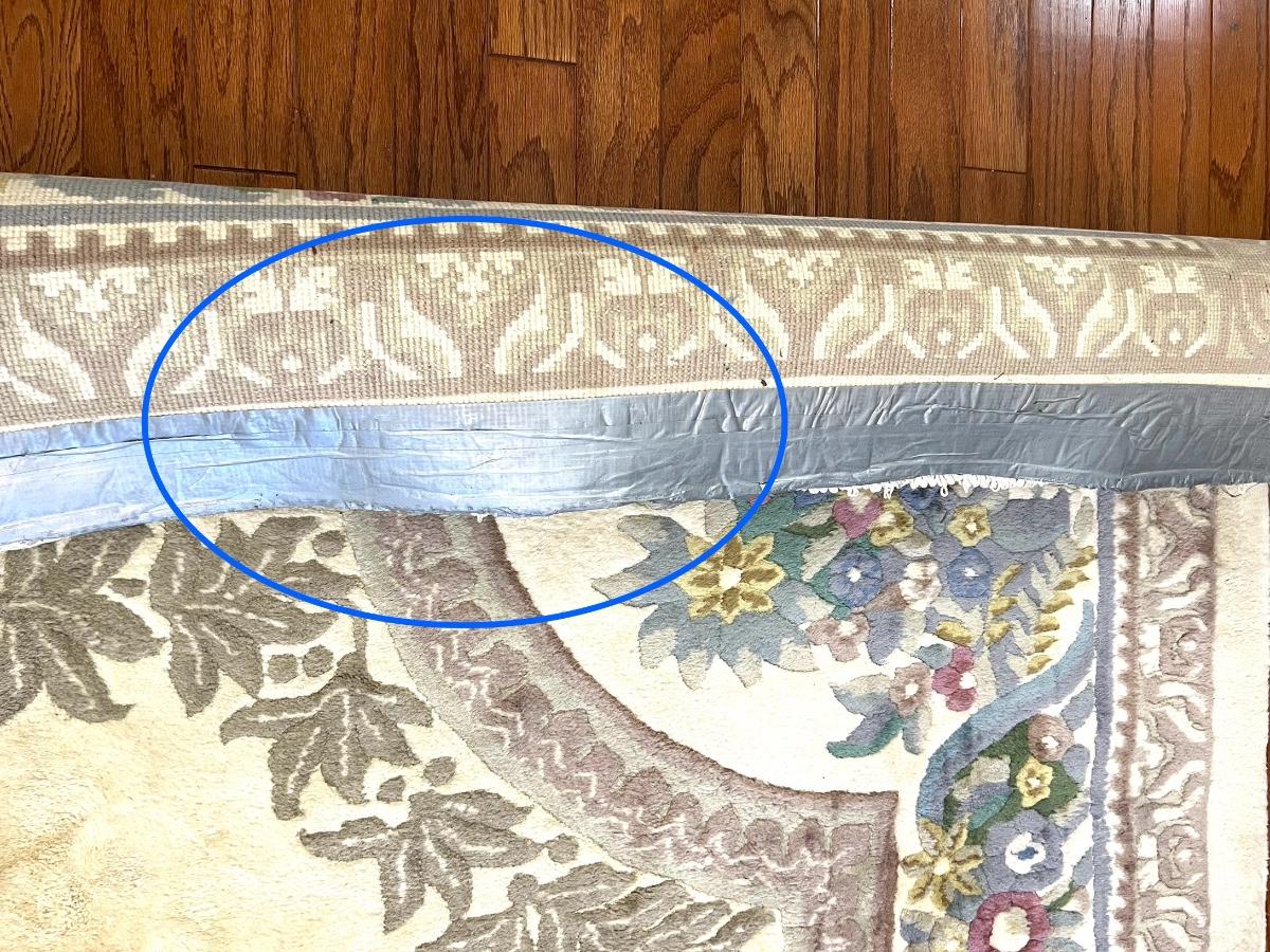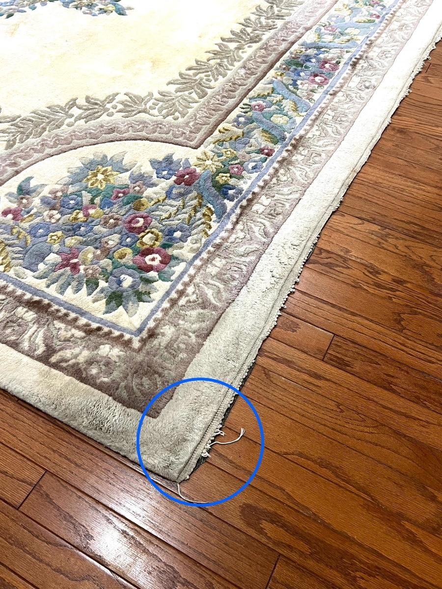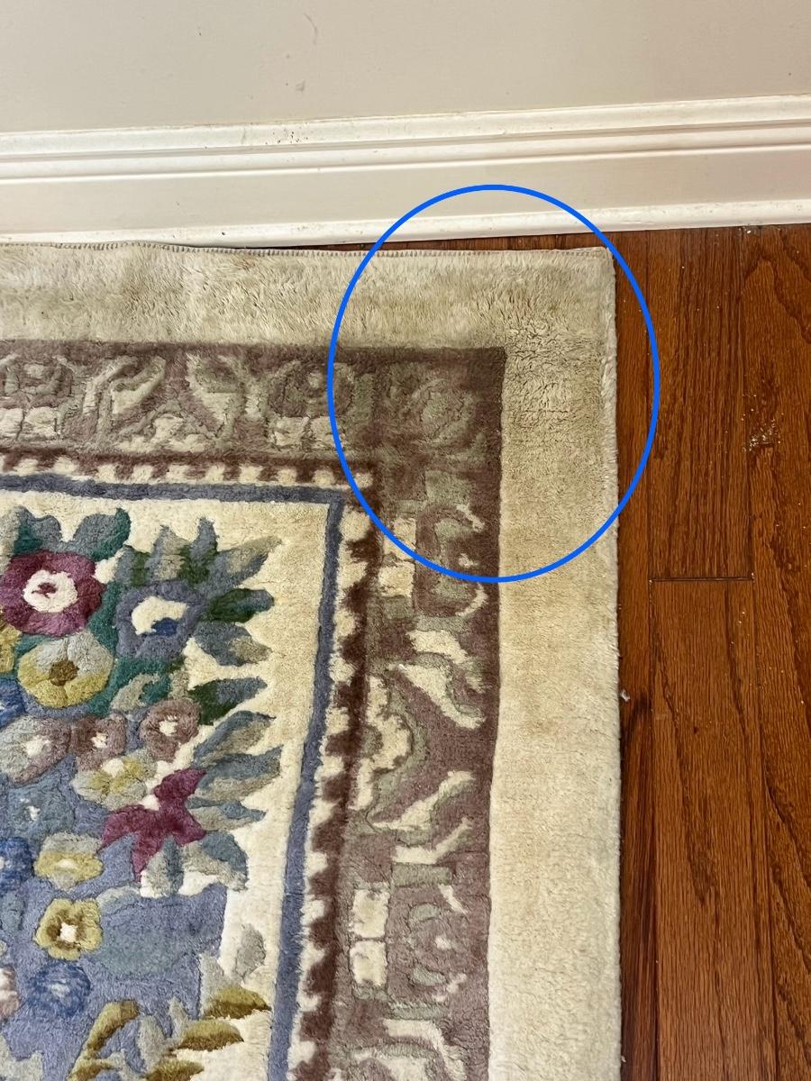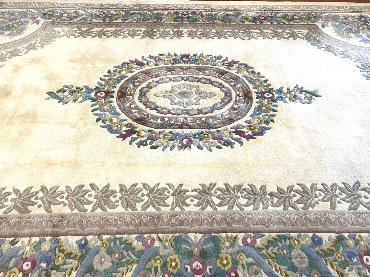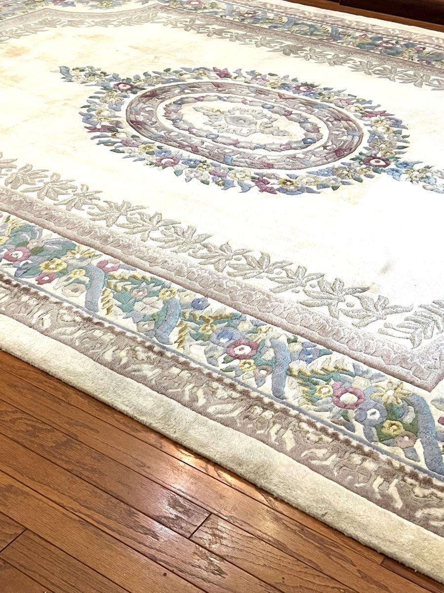 This rug is huge! With a good shampooing this could be like new again. It has some discoloration spots from being spot cleaned. It was used under a formal dining table. Also the end fringes have been taped under the rug. Please see pictures for the condition. You are bidding on this rug knowing it will need to be cleaned. Measures 9’ 7” X 13’ 7”