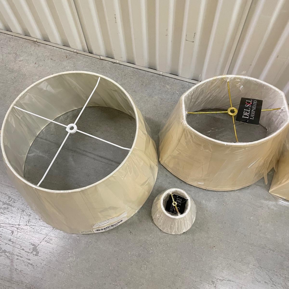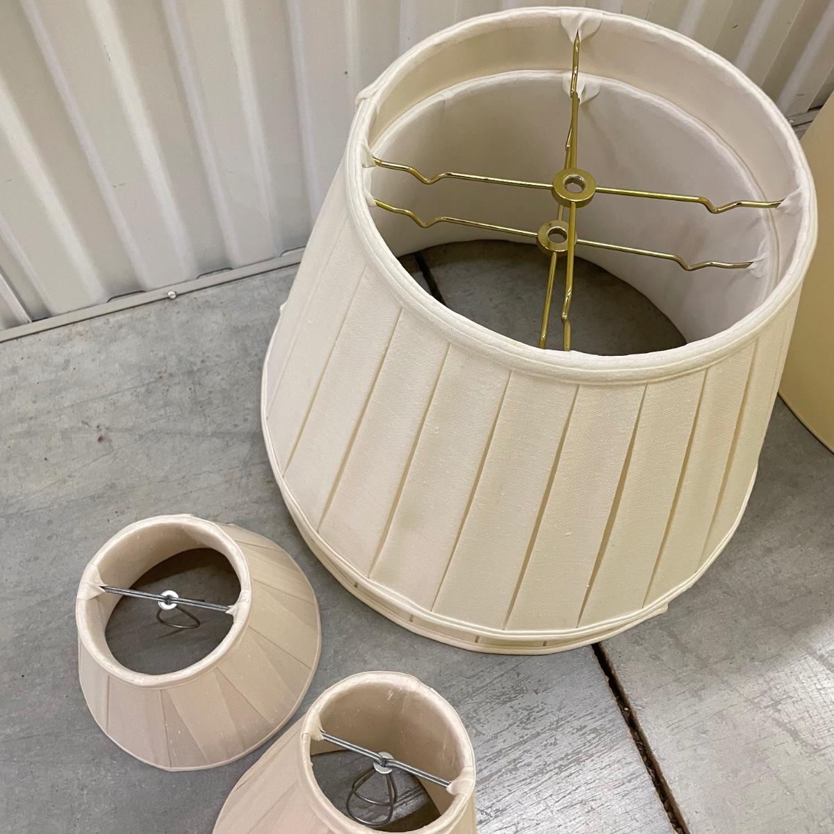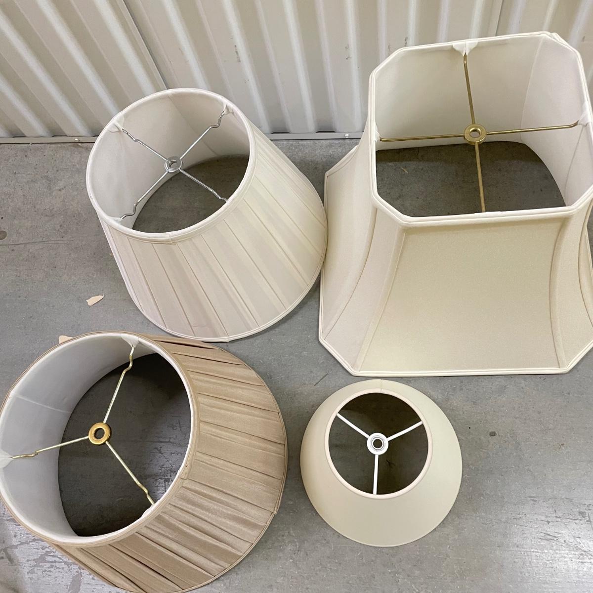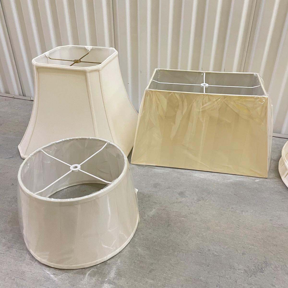Almost 20 lampshades, mostly ivory in color. Lot features a few paper MCM shades including two matching shades with light deflection on top and wooden finials. Lot offers several shades still in packaging, in a variety of cloth, silk and paper. Some non-used shades have Del Sol Lampshades tags. Lot also includes nine extra harps, two of which have finials. The largest round shades with wood finials measure 17”D x 12”H, the smallest shade with a $49.50 price tag is 5”D (at the widest) x 4.25”H. Lot has very few blemishes, see images. Local pick up only.