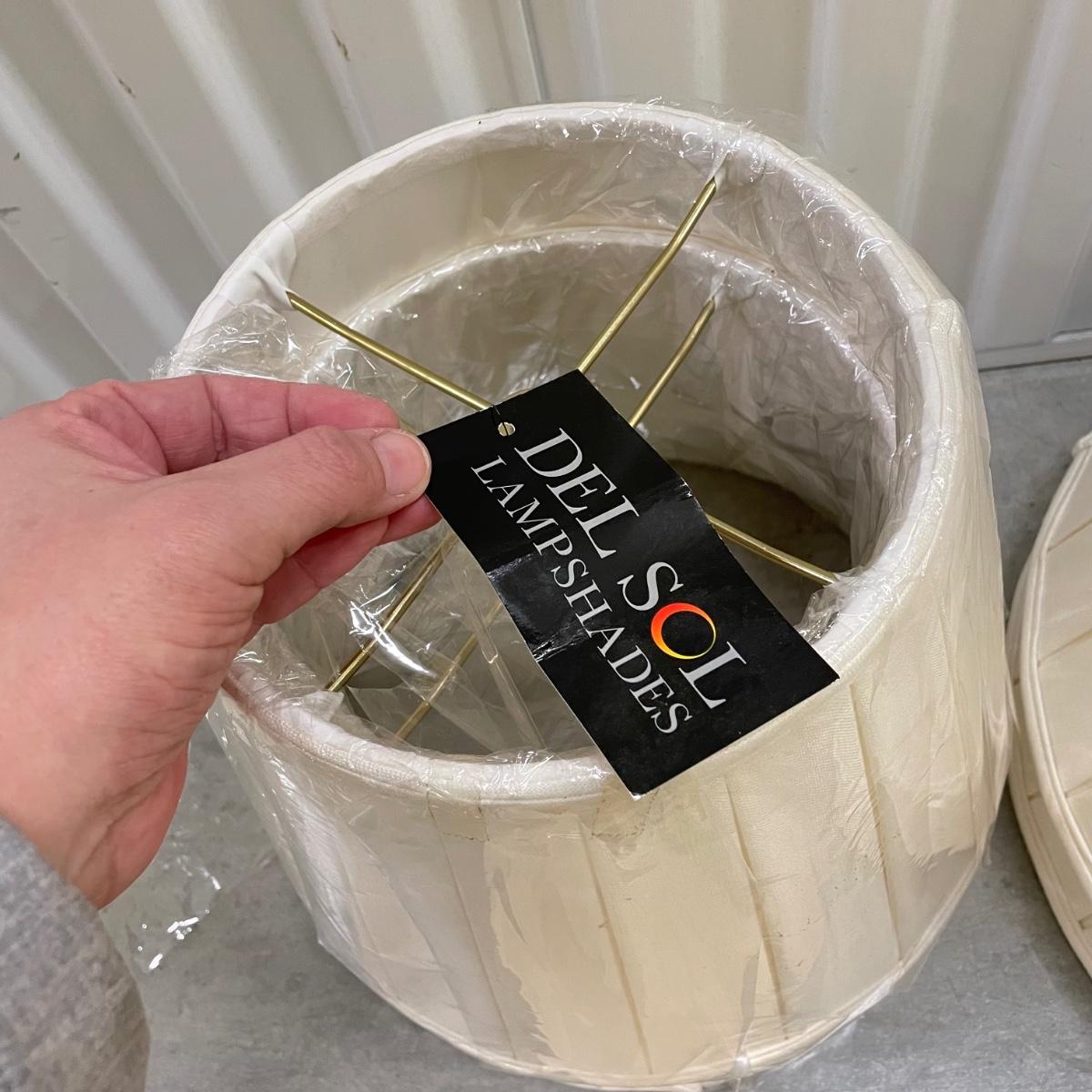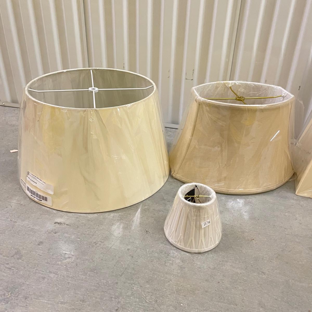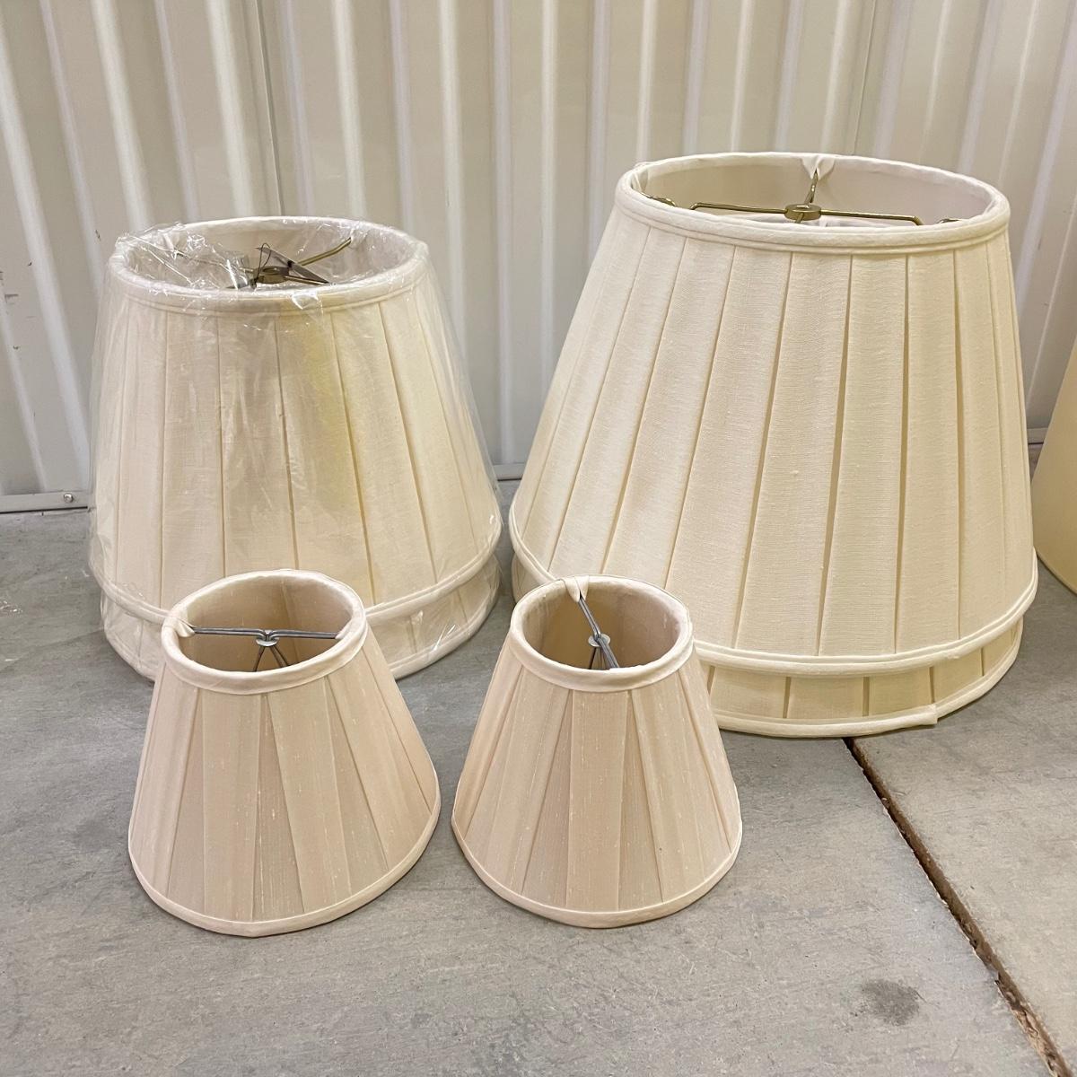 Almost 20 lampshades, mostly ivory in color. Lot features a few paper MCM shades including two matching shades with light deflection on top and wooden finials. Lot offers several shades still in packaging, in a variety of cloth, silk and paper. Some non-used shades have Del Sol Lampshades tags. Lot also includes nine extra harps, two of which have finials. The largest round shades with wood finials measure 17”D x 12”H, the smallest shade with a $49.50 price tag is 5”D (at the widest) x 4.25”H. Lot has very few blemishes, see images. Local pick up only.