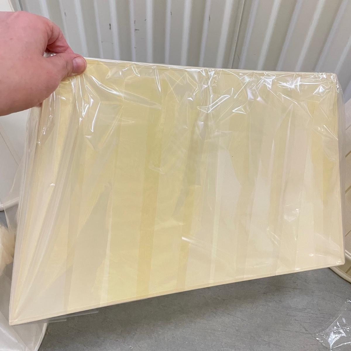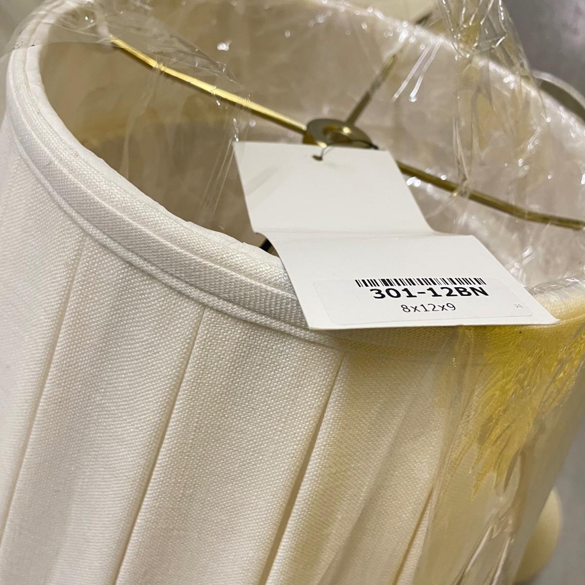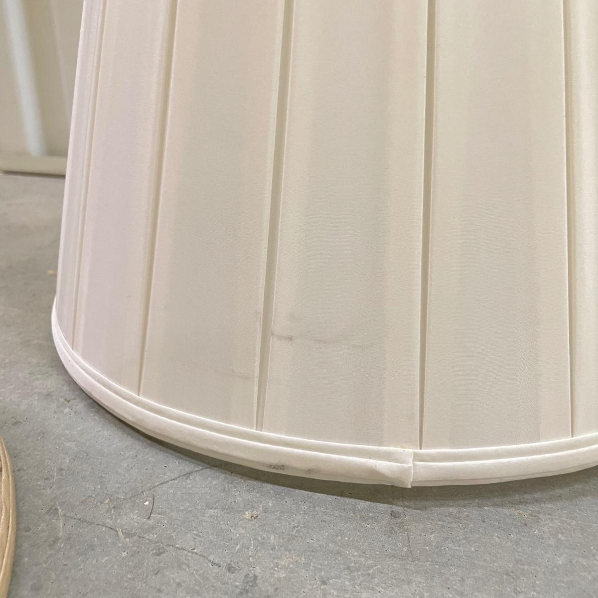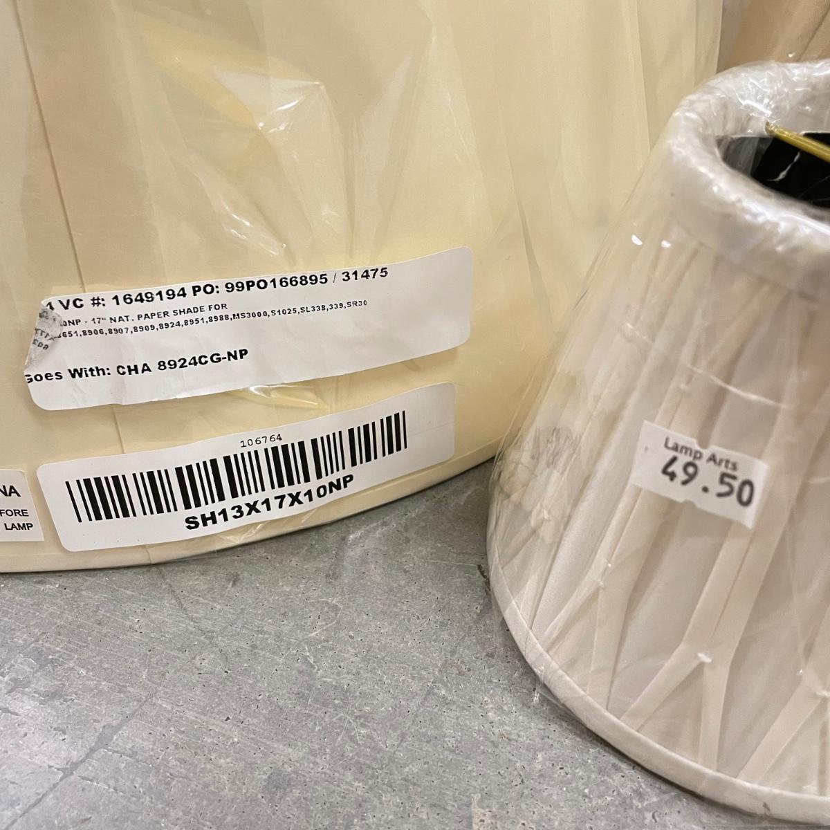 Almost 20 lampshades, mostly ivory in color. Lot features a few paper MCM shades including two matching shades with light deflection on top and wooden finials. Lot offers several shades still in packaging, in a variety of cloth, silk and paper. Some non-used shades have Del Sol Lampshades tags. Lot also includes nine extra harps, two of which have finials. The largest round shades with wood finials measure 17”D x 12”H, the smallest shade with a $49.50 price tag is 5”D (at the widest) x 4.25”H. Lot has very few blemishes, see images. Local pick up only.