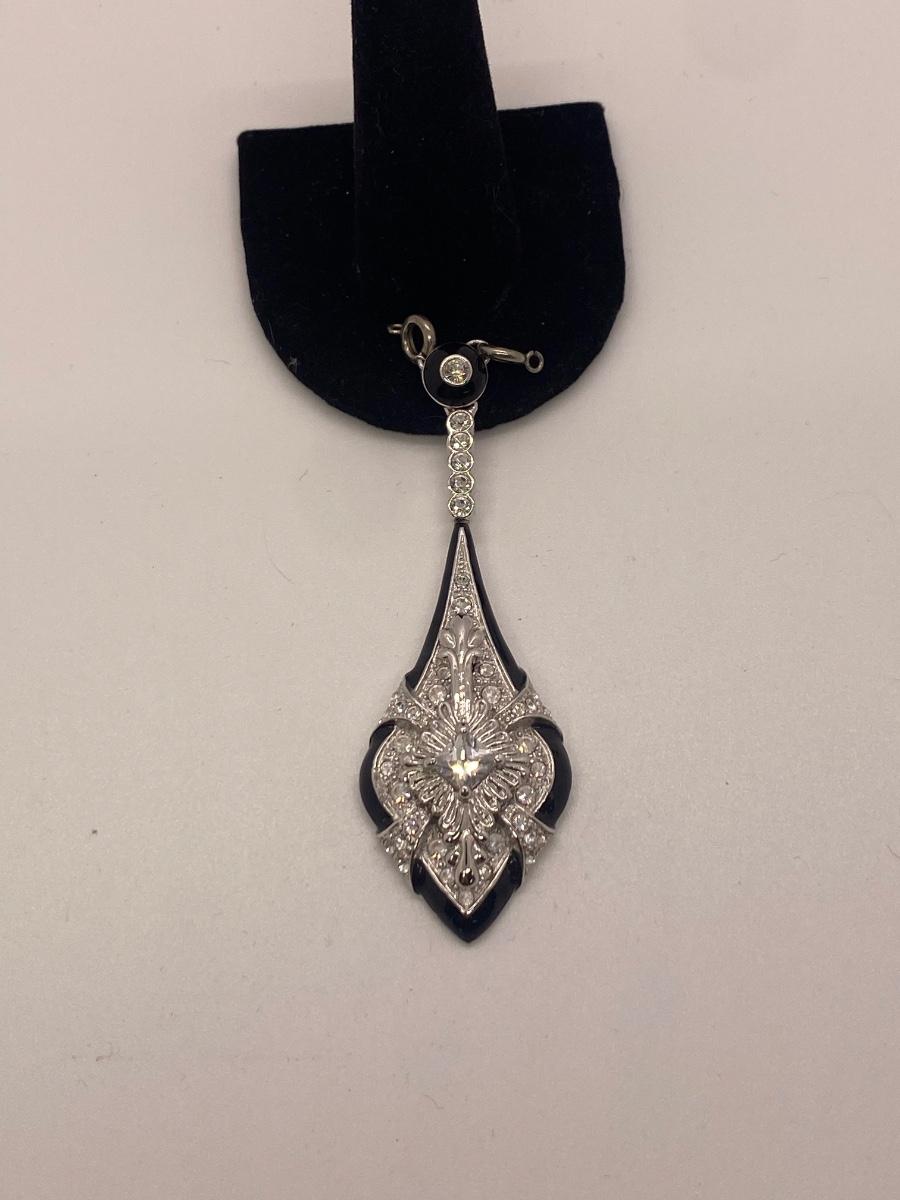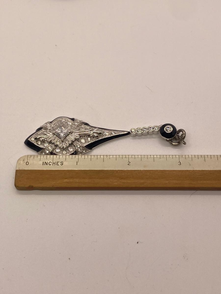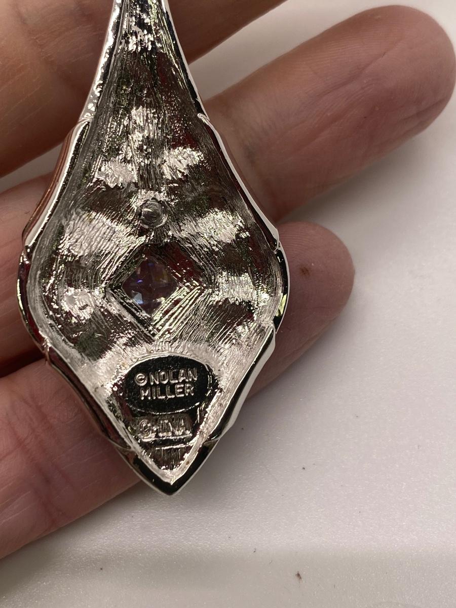 Large Art Deco Inspired Silver Tone & Black Rhinestone Pendant Nolan Miller. In good condition. Brilliant clear CZ rhinestones. About 3" length. Signed on the back.