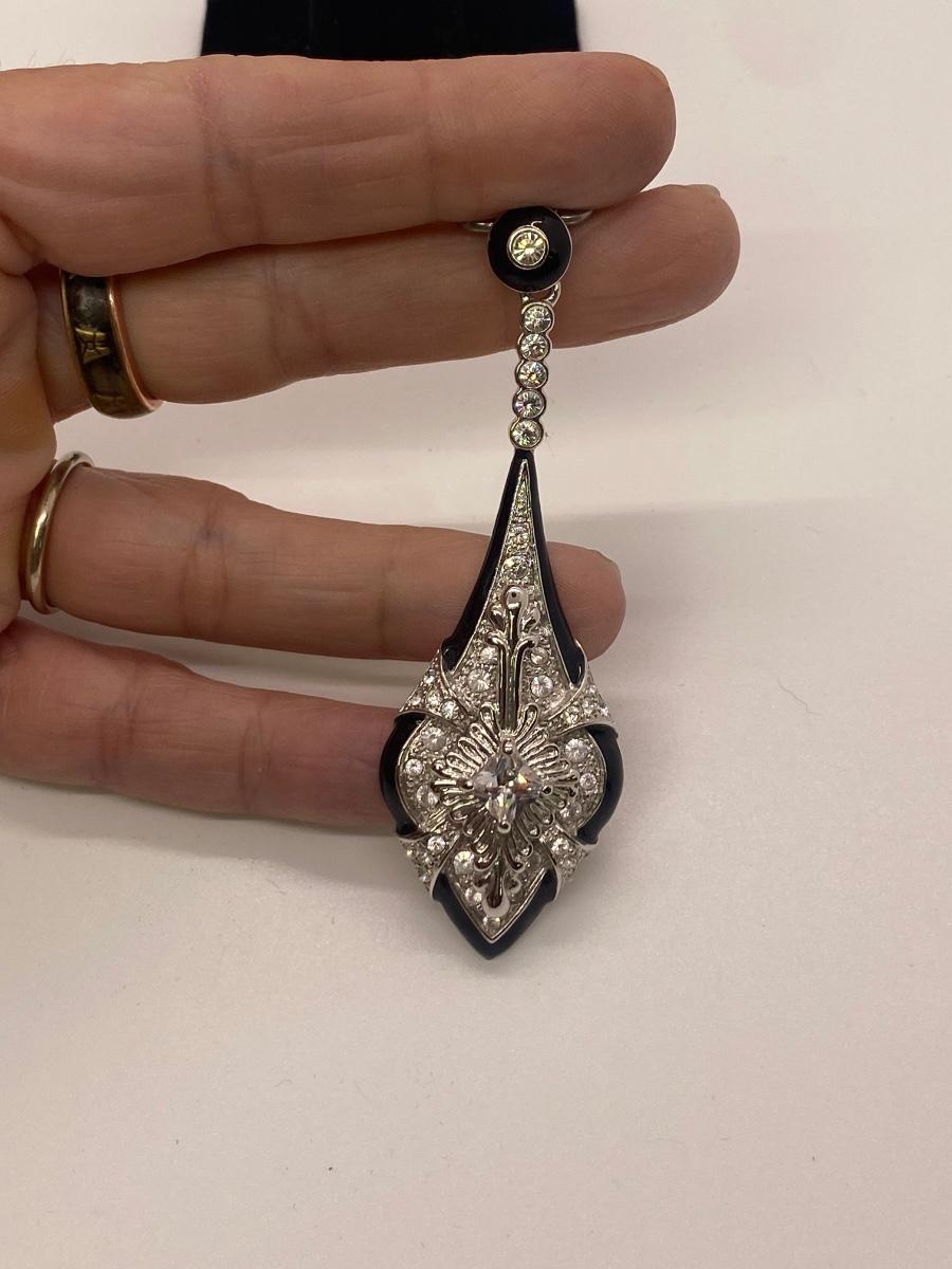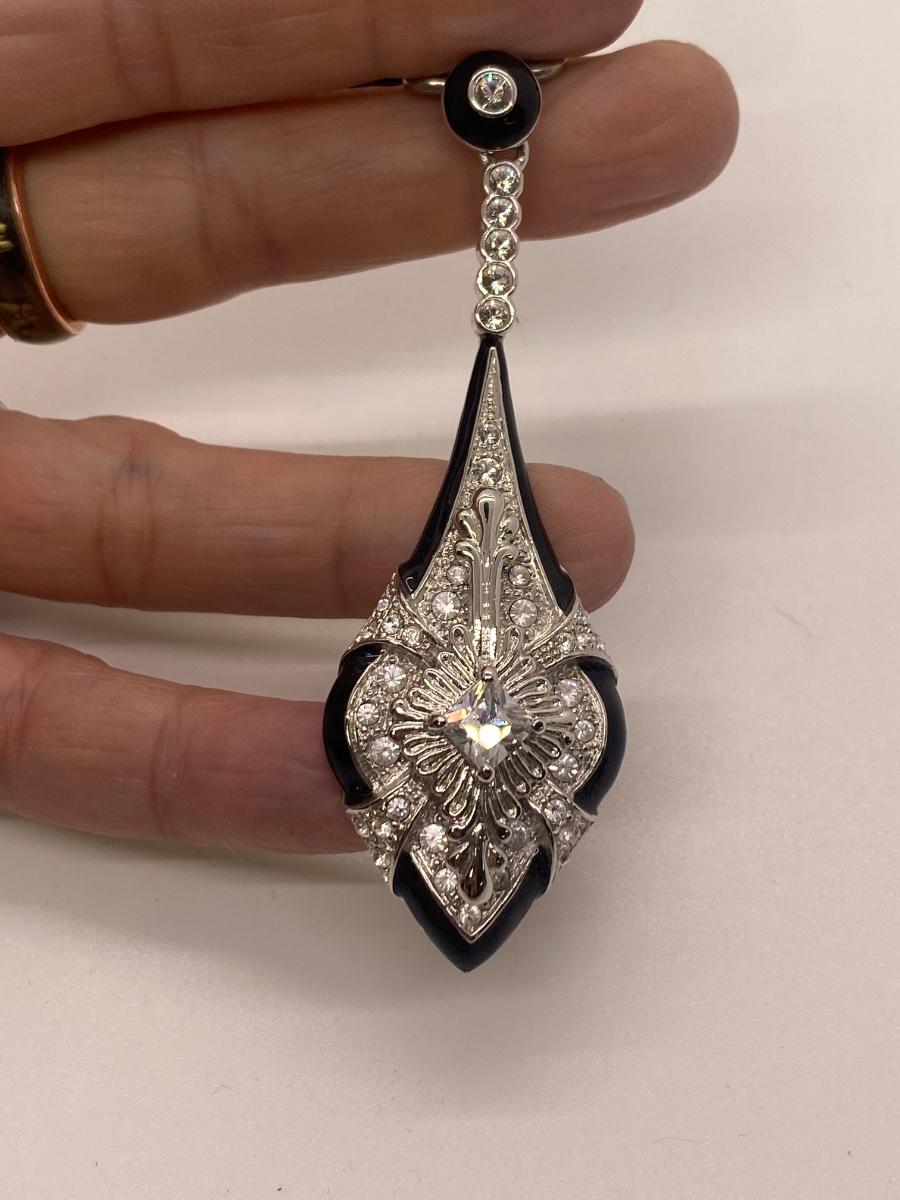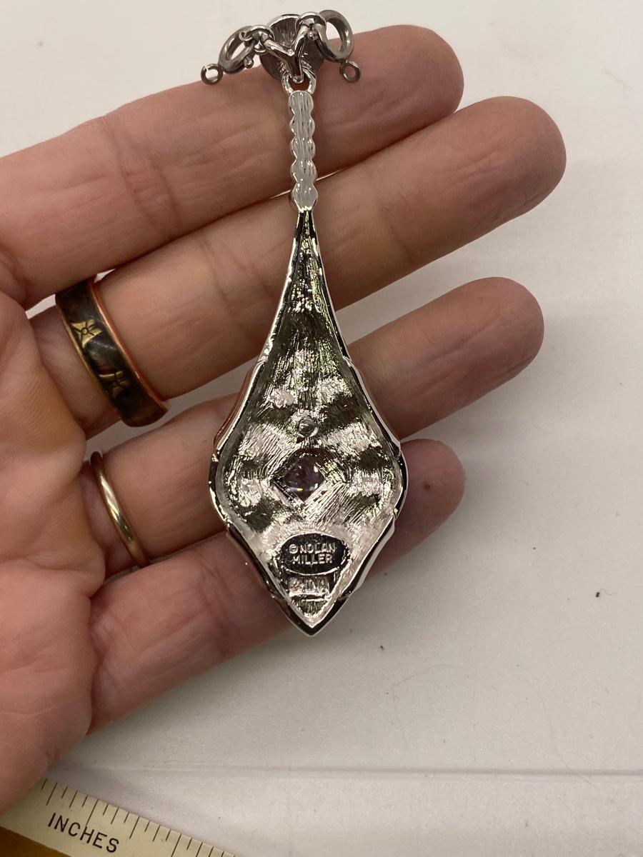 Large Art Deco Inspired Silver Tone & Black Rhinestone Pendant Nolan Miller. In good condition. Brilliant clear CZ rhinestones. About 3" length. Signed on the back.