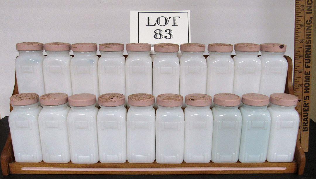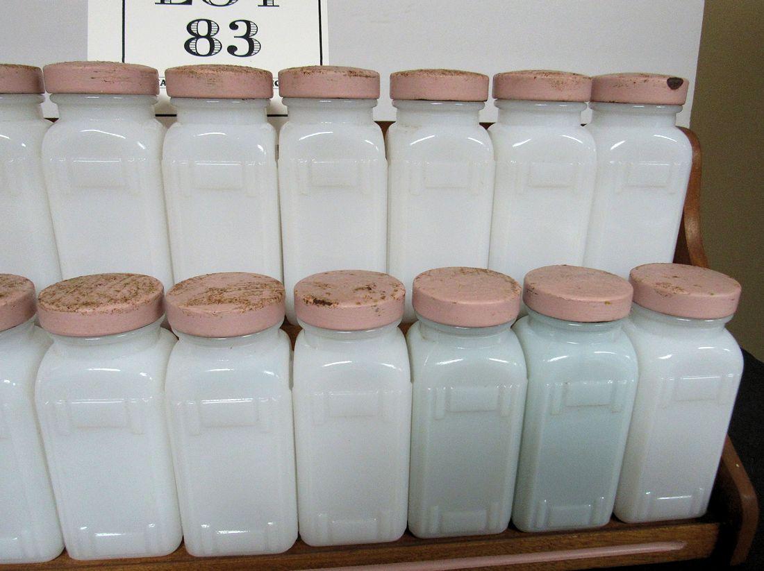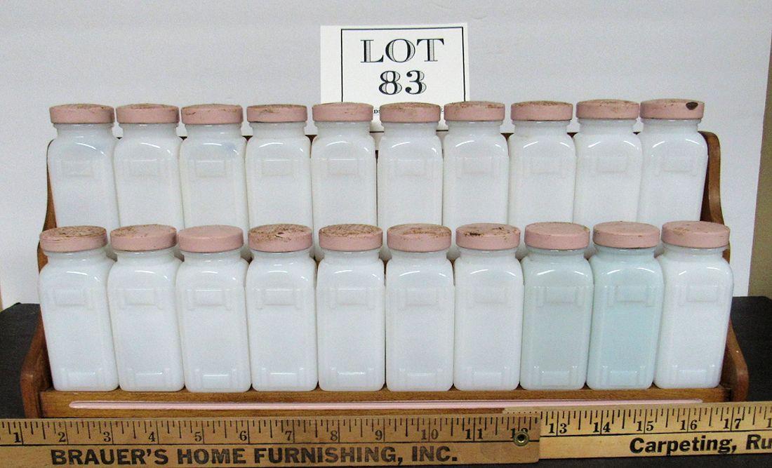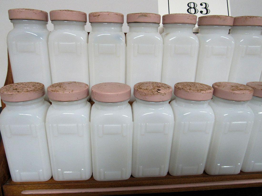 Large Art Deco Milk Glass Spice Jar Set on Wood Rack