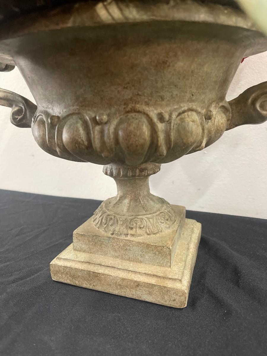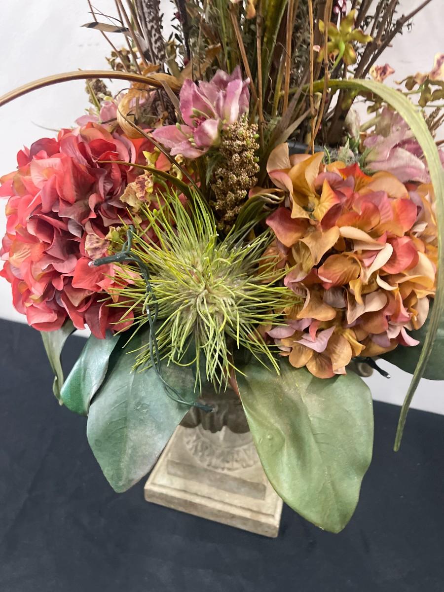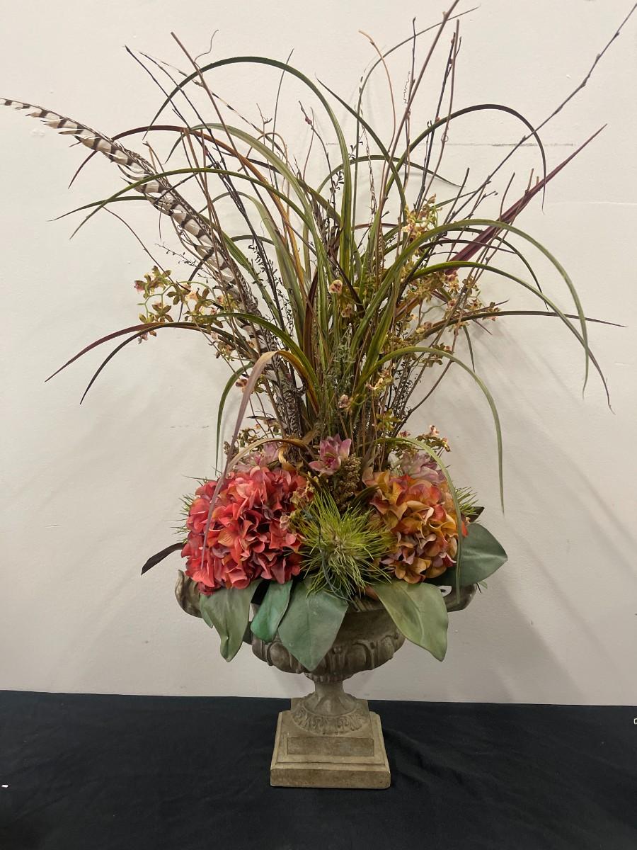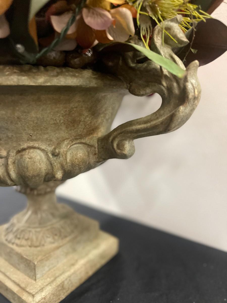 Large artificial flower arrangement in urn shaped vase with twinkle lights. Battery compartment for lights missing the back, otherwise excellent condition.