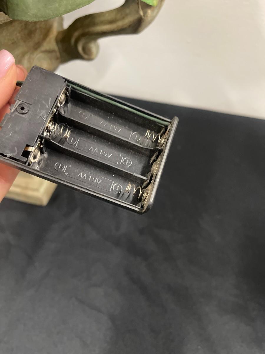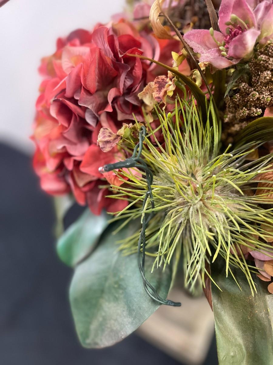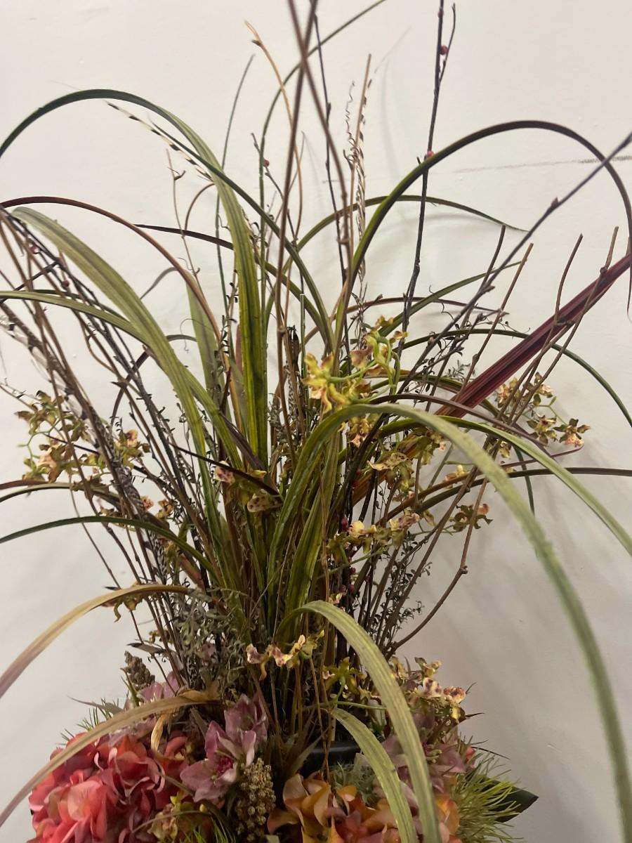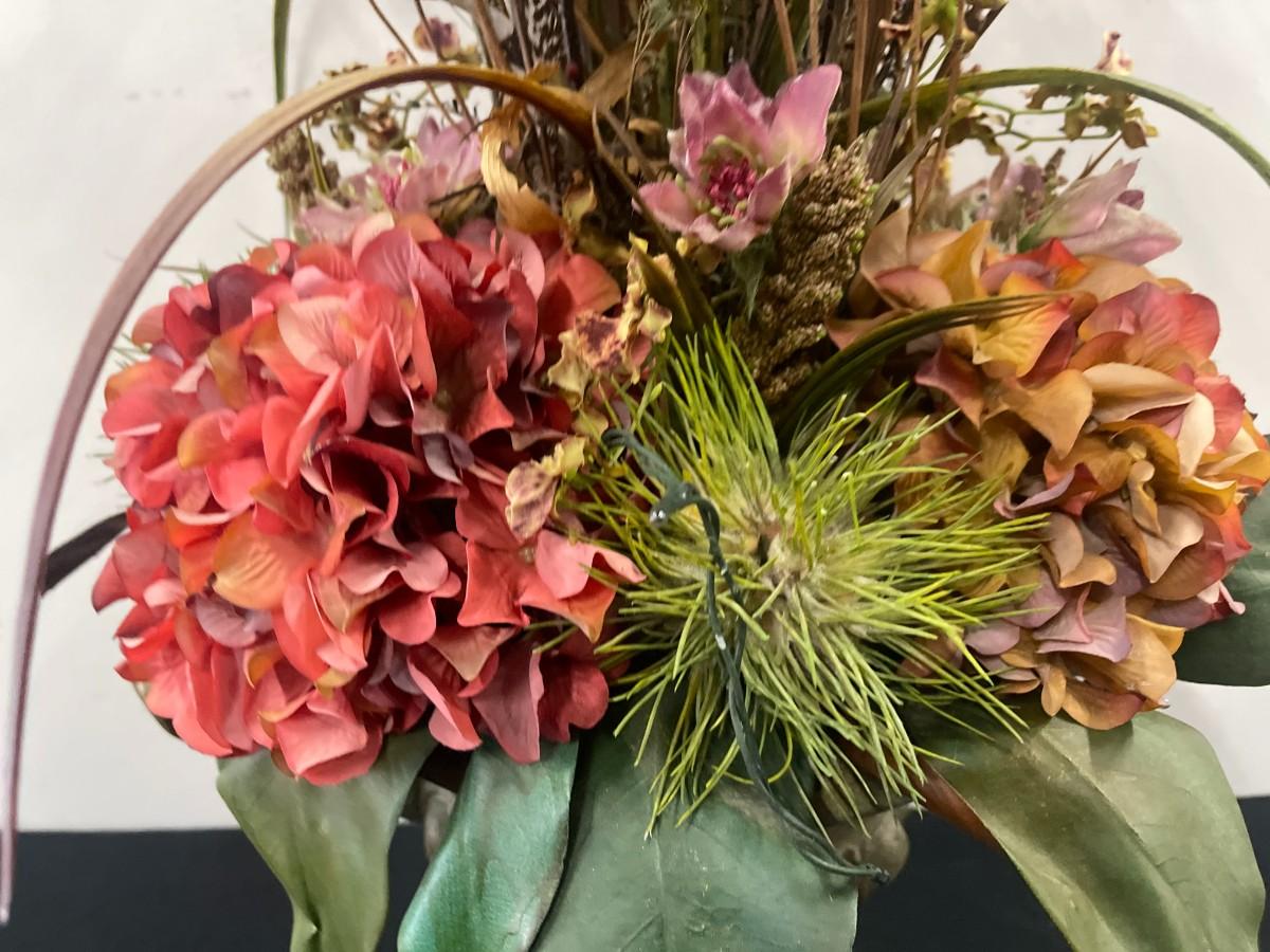 Large artificial flower arrangement in urn shaped vase with twinkle lights. Battery compartment for lights missing the back, otherwise excellent condition.