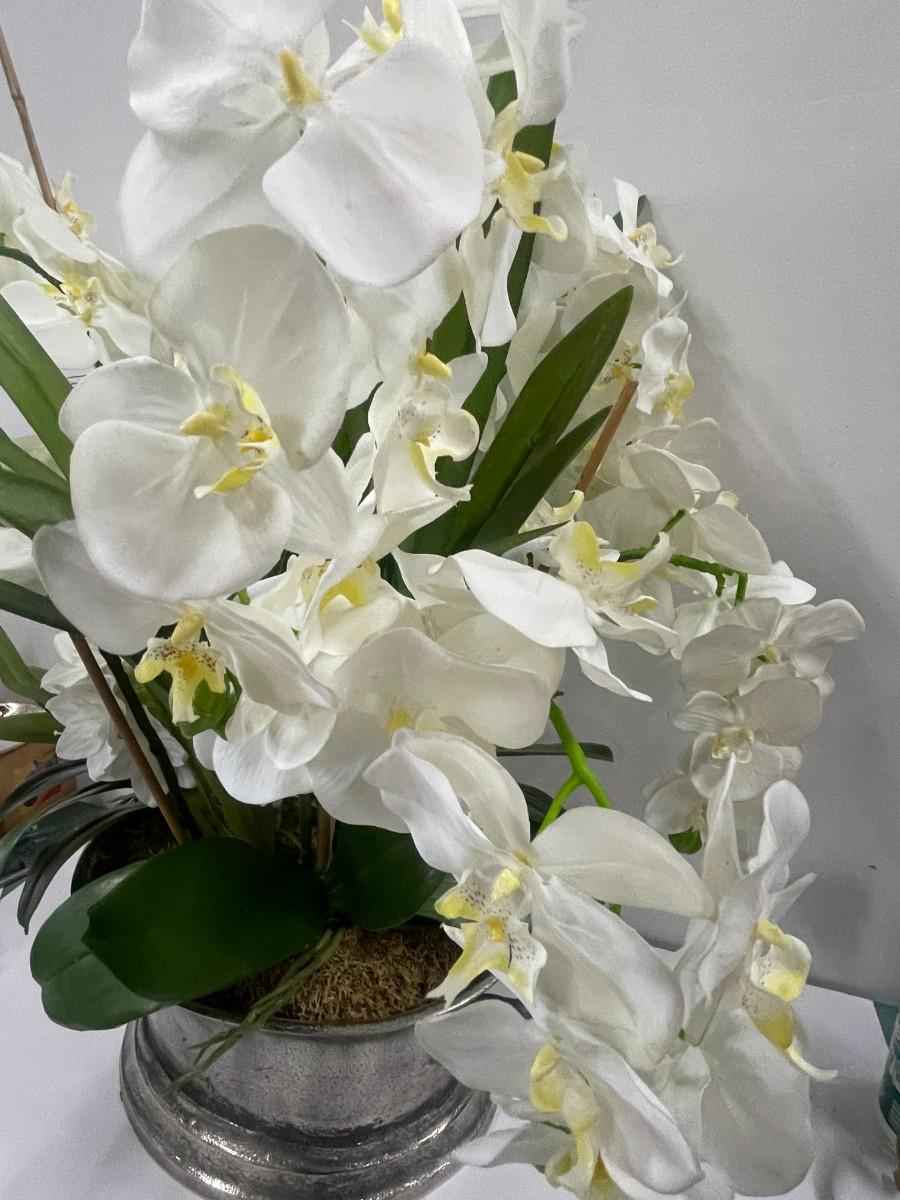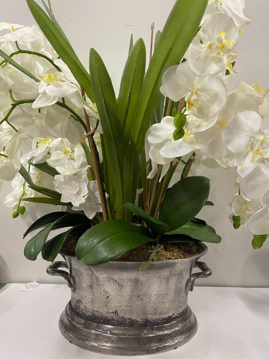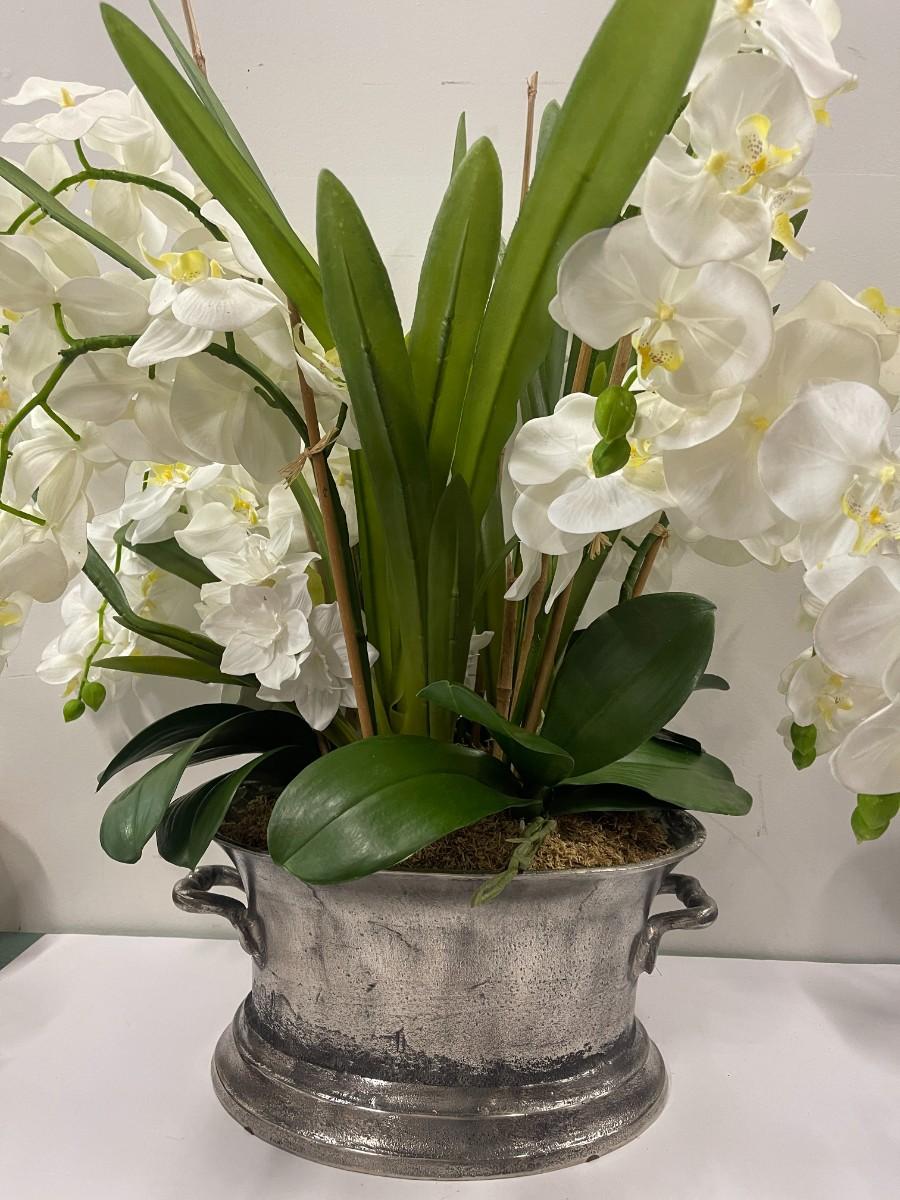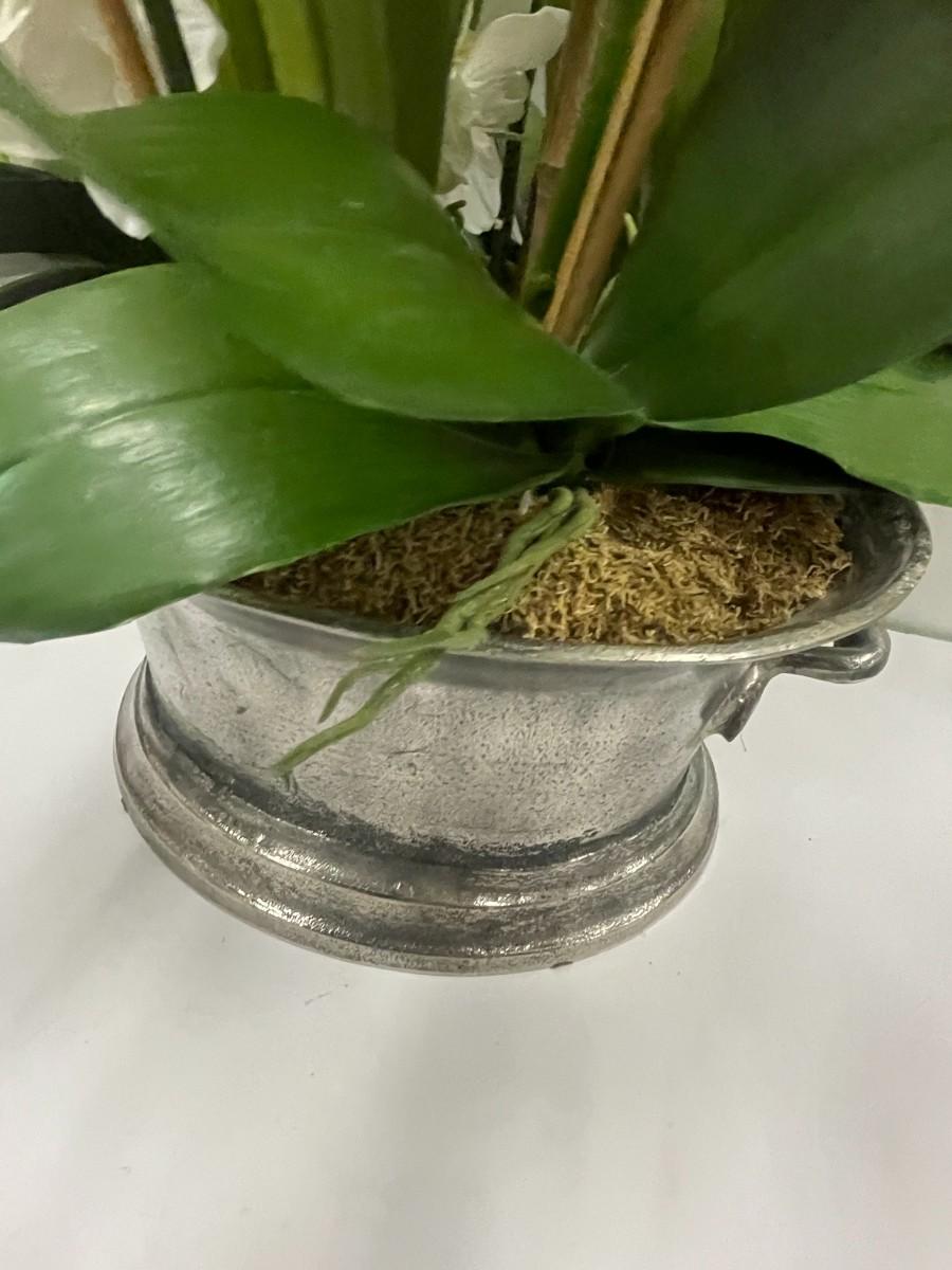 Large artificial orchid arrangement in oval metal planter pot. 12" x 29" high to top of plant. Excellent condition.