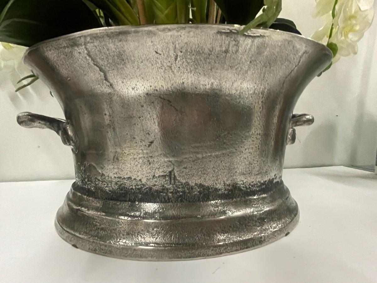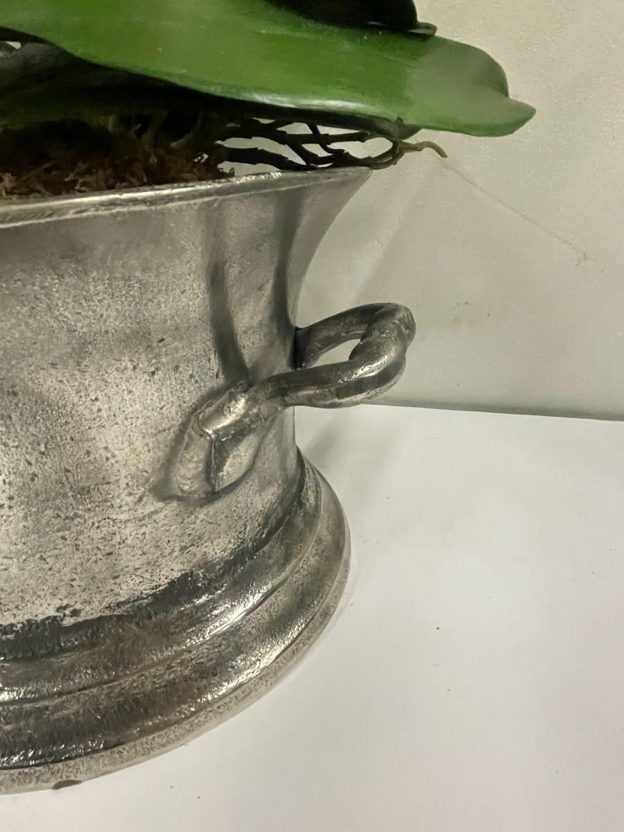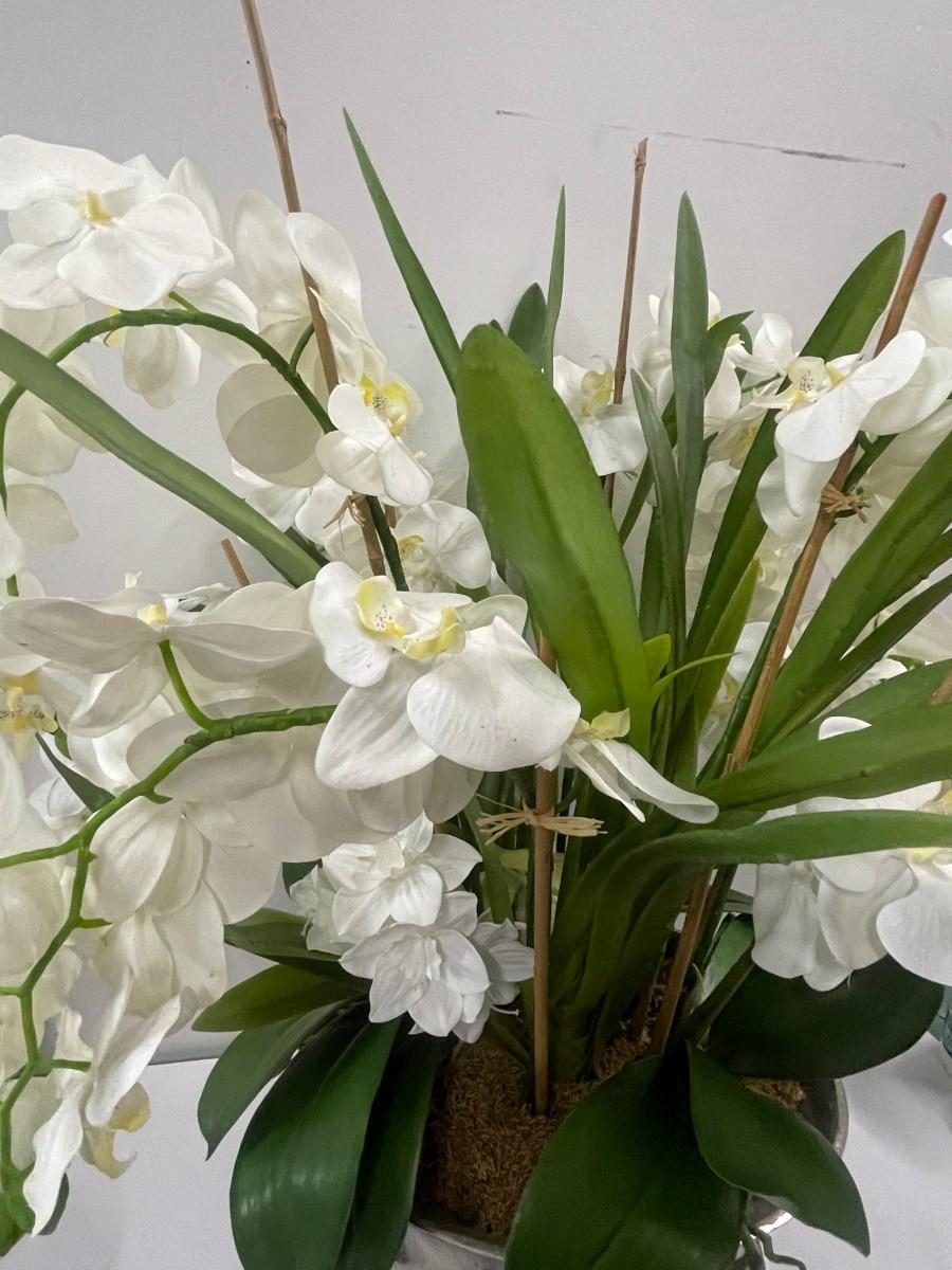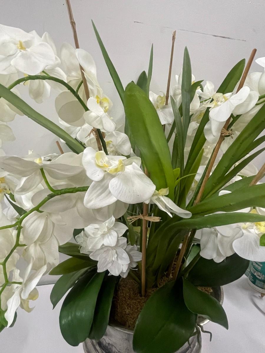 Large artificial orchid arrangement in oval metal planter pot. 12" x 29" high to top of plant. Excellent condition.