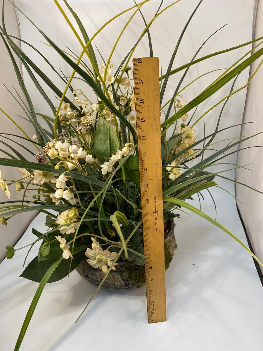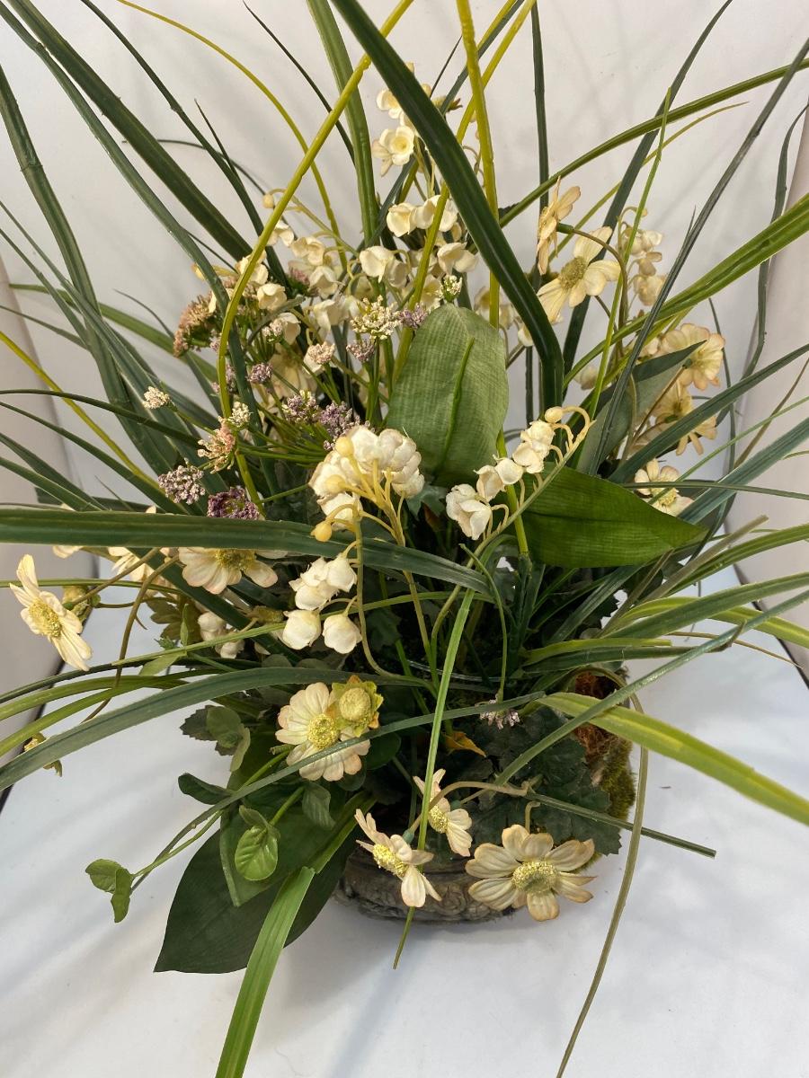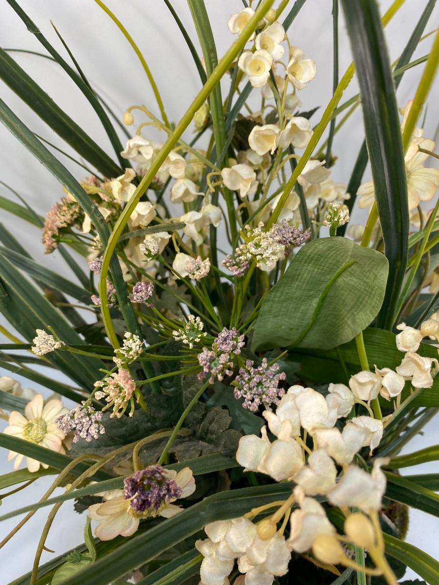 Large Artificial Small White Flowers Fake Floral Arrangement. A little dusty from display. Over 18" size.