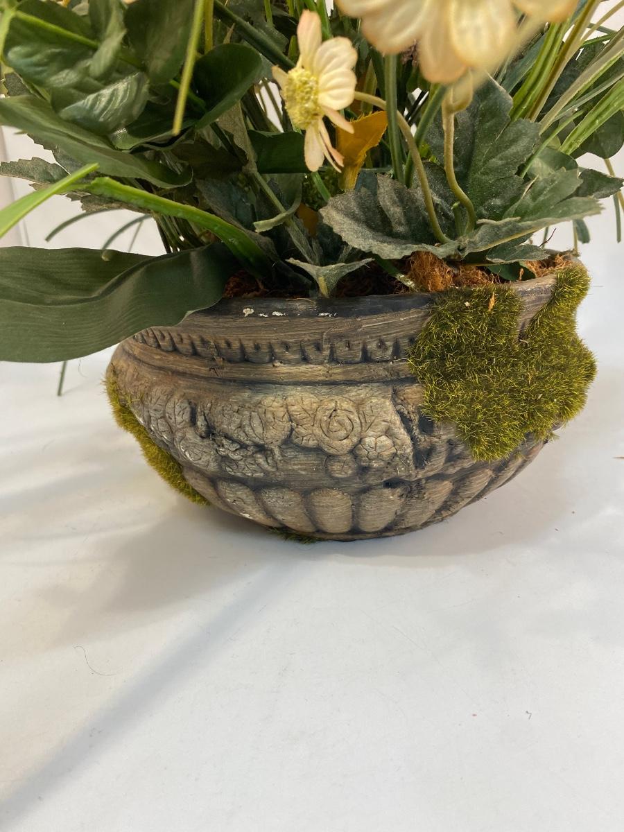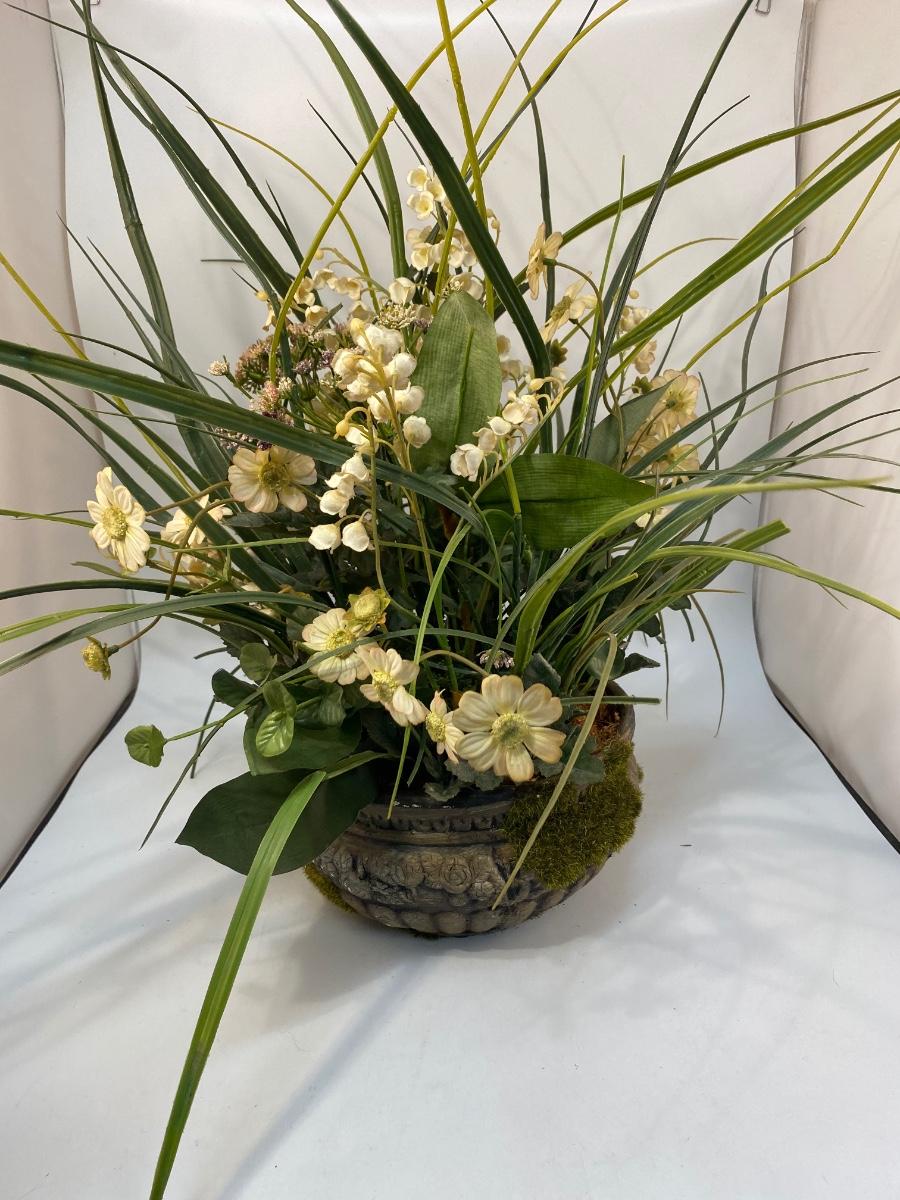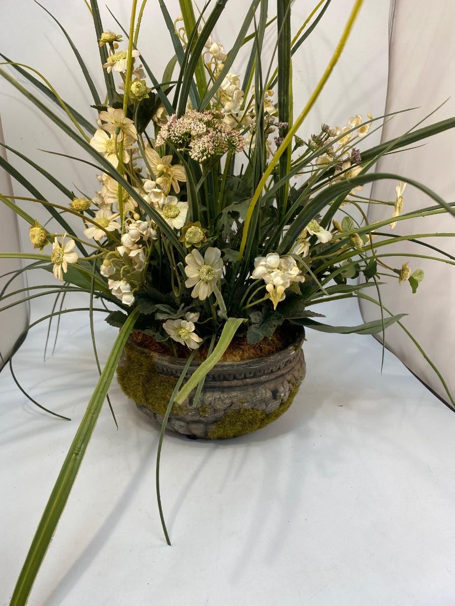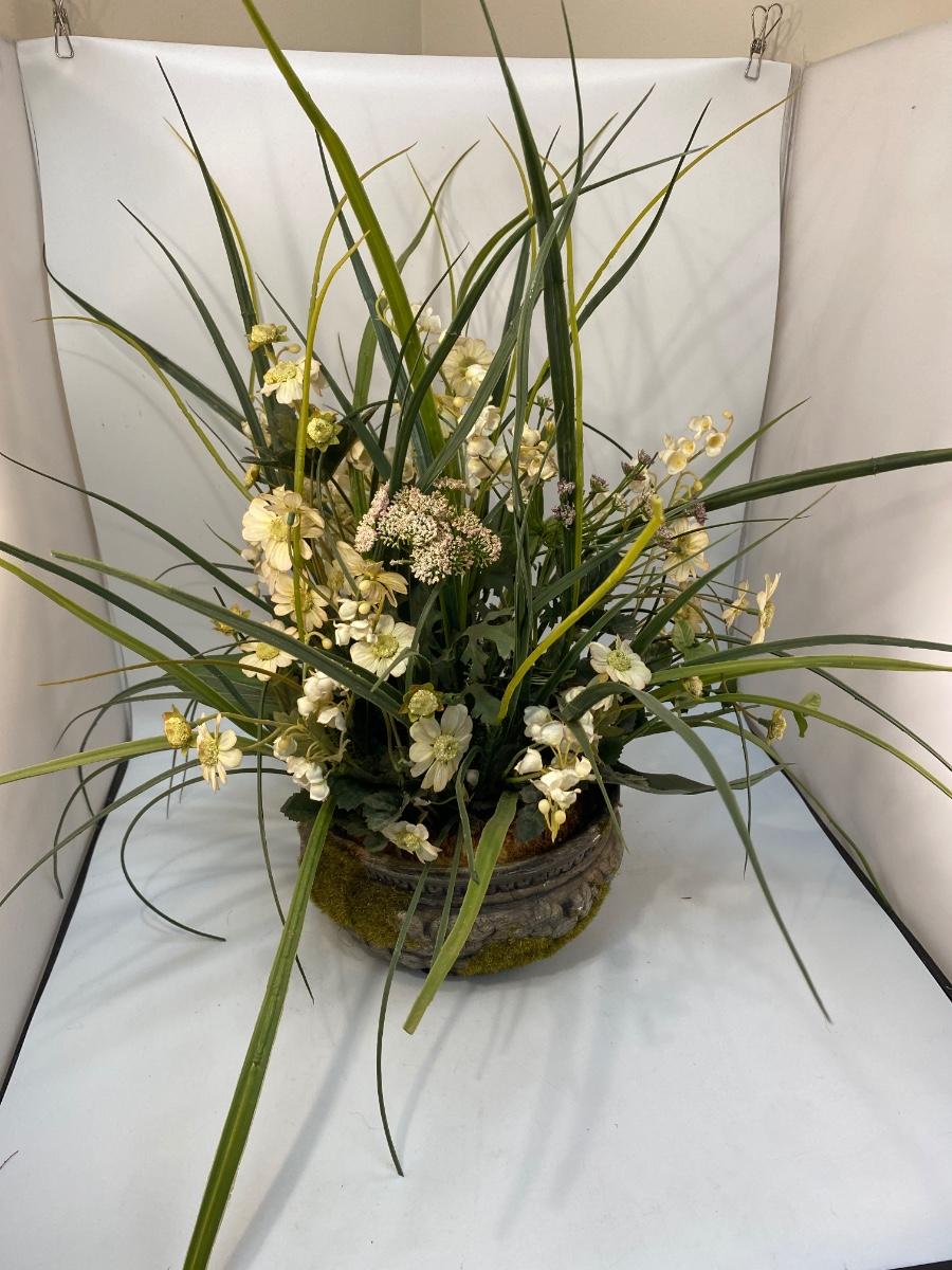 Large Artificial Small White Flowers Fake Floral Arrangement. A little dusty from display. Over 18" size.