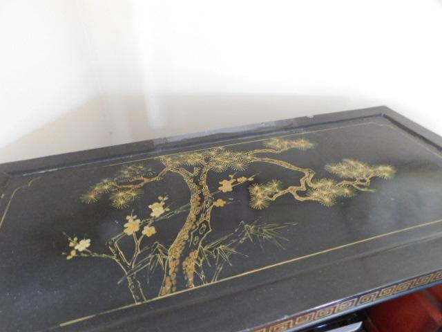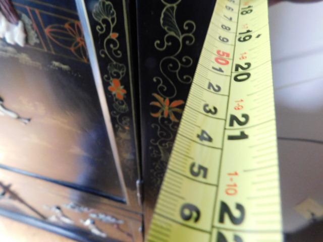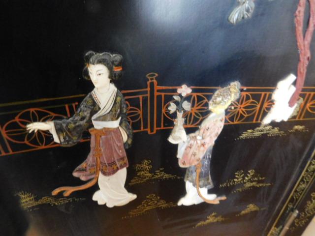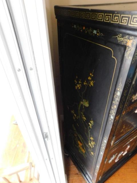 Large Asian Black Laquer with Mother of Pearl Carved Inlay Geisha Scenes Cabinet 39"x18"x58" some pieces of mother of pearl missing. Expect some wear or scratches