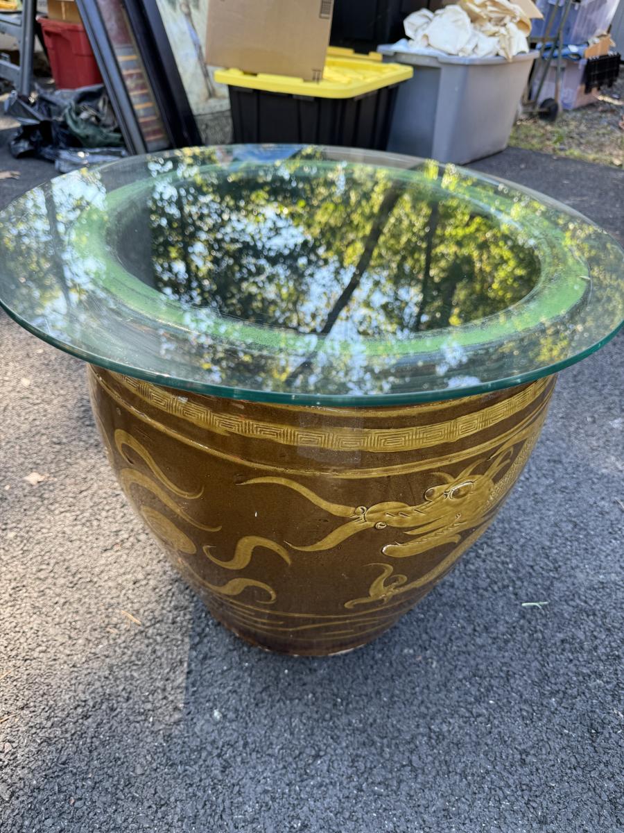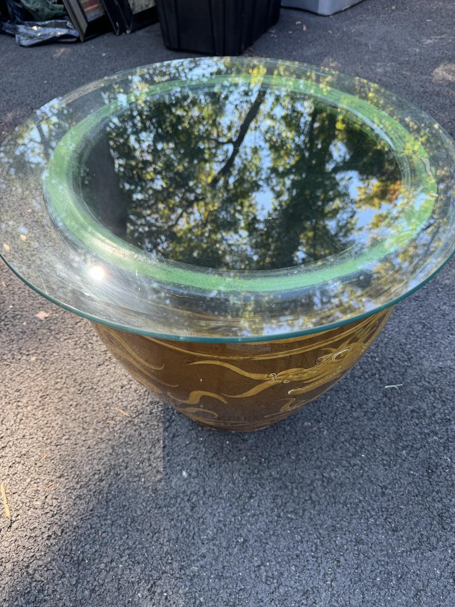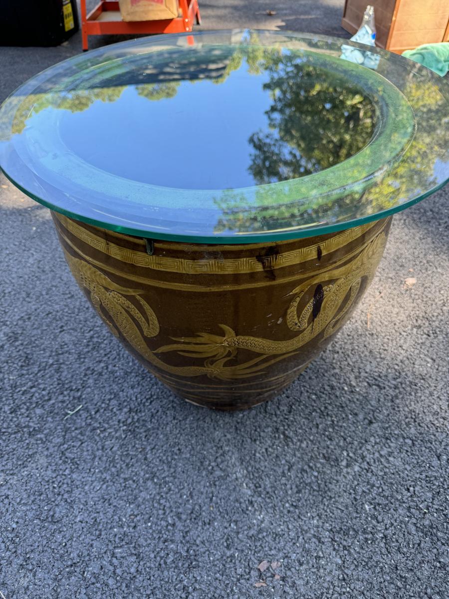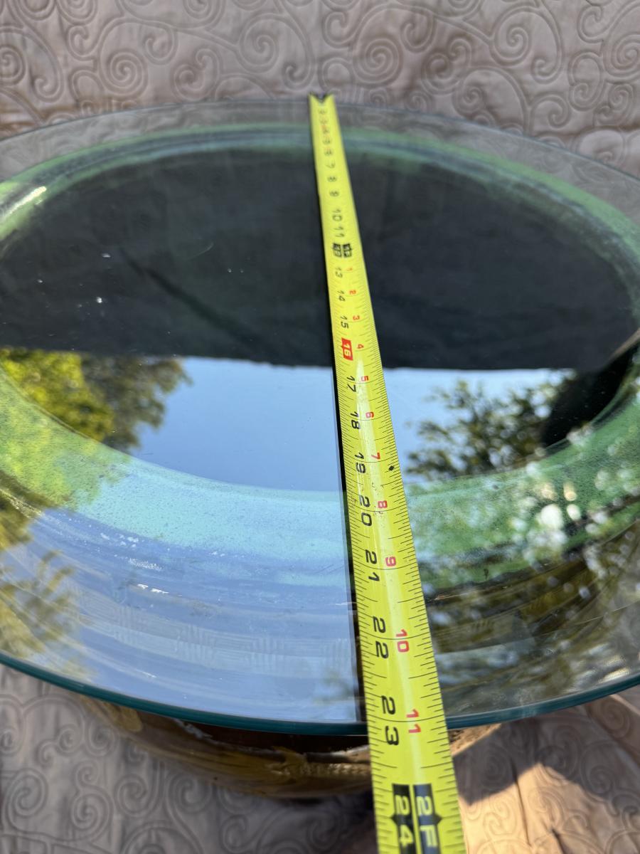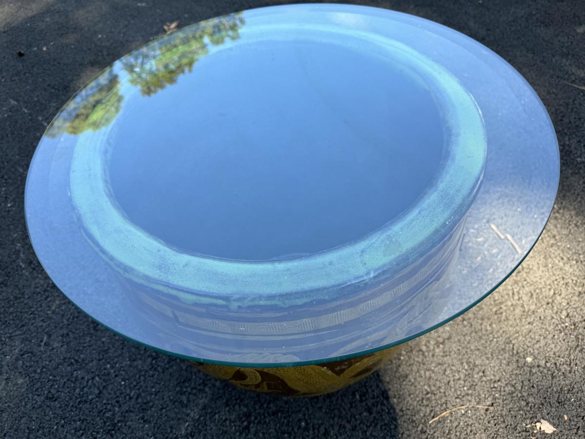Buying as is, as found in this wonderful estate. See MANY PHOTOS for content, condition and dimensions. Never a Buyers Premiums or Credit Card Fee. All lots start at just $10 and sell with No Reserve to the highest bidder. Glass top 23” diameter.